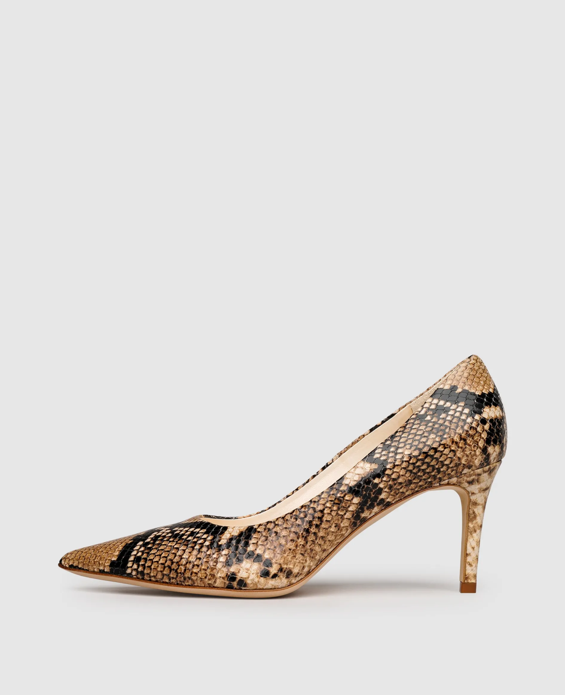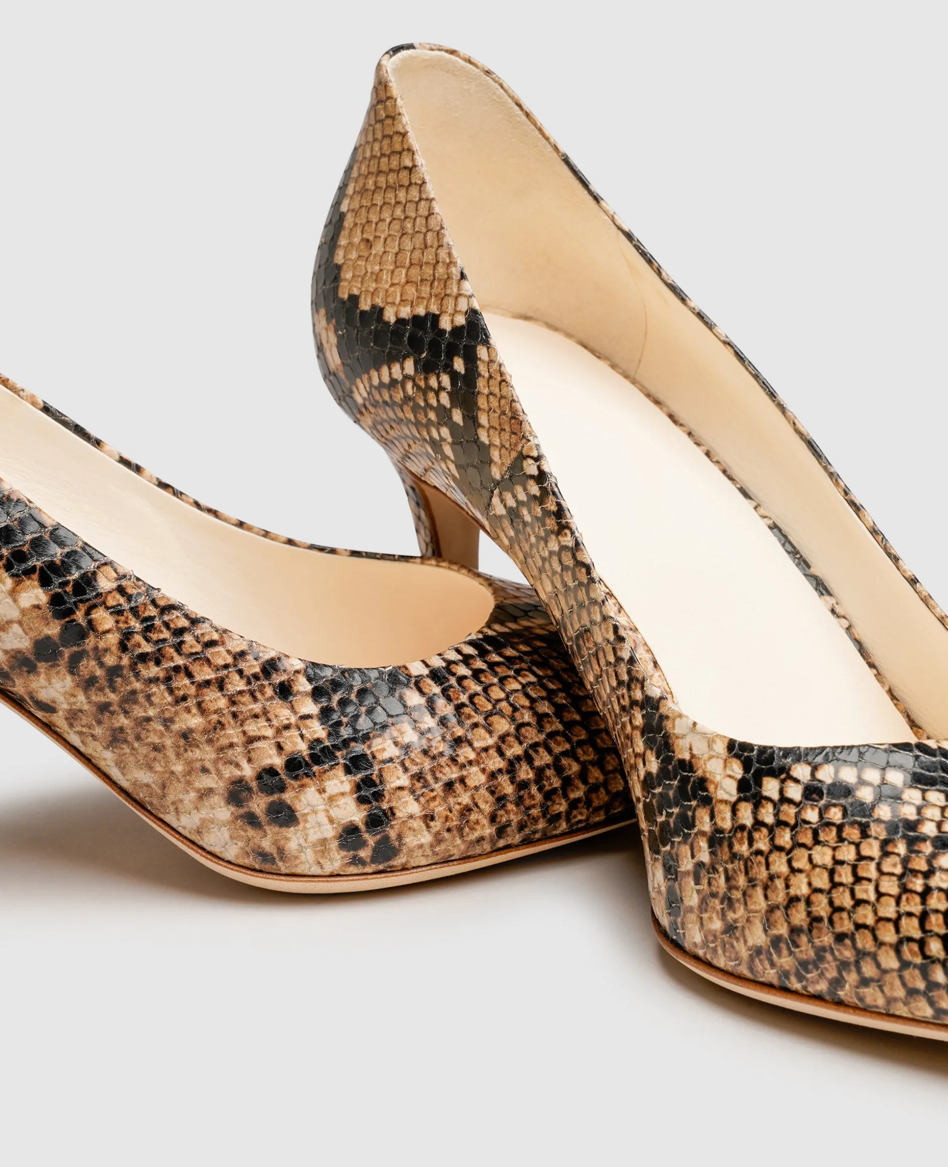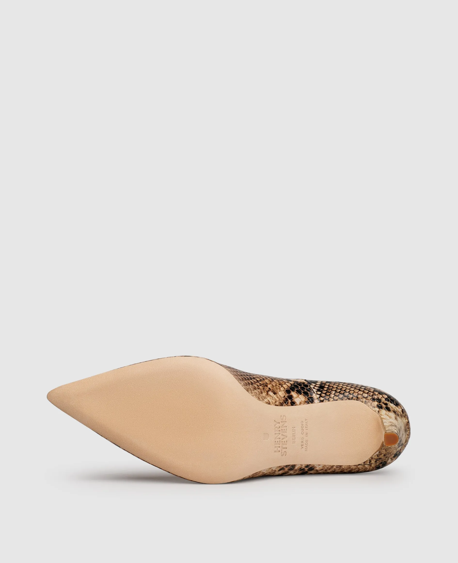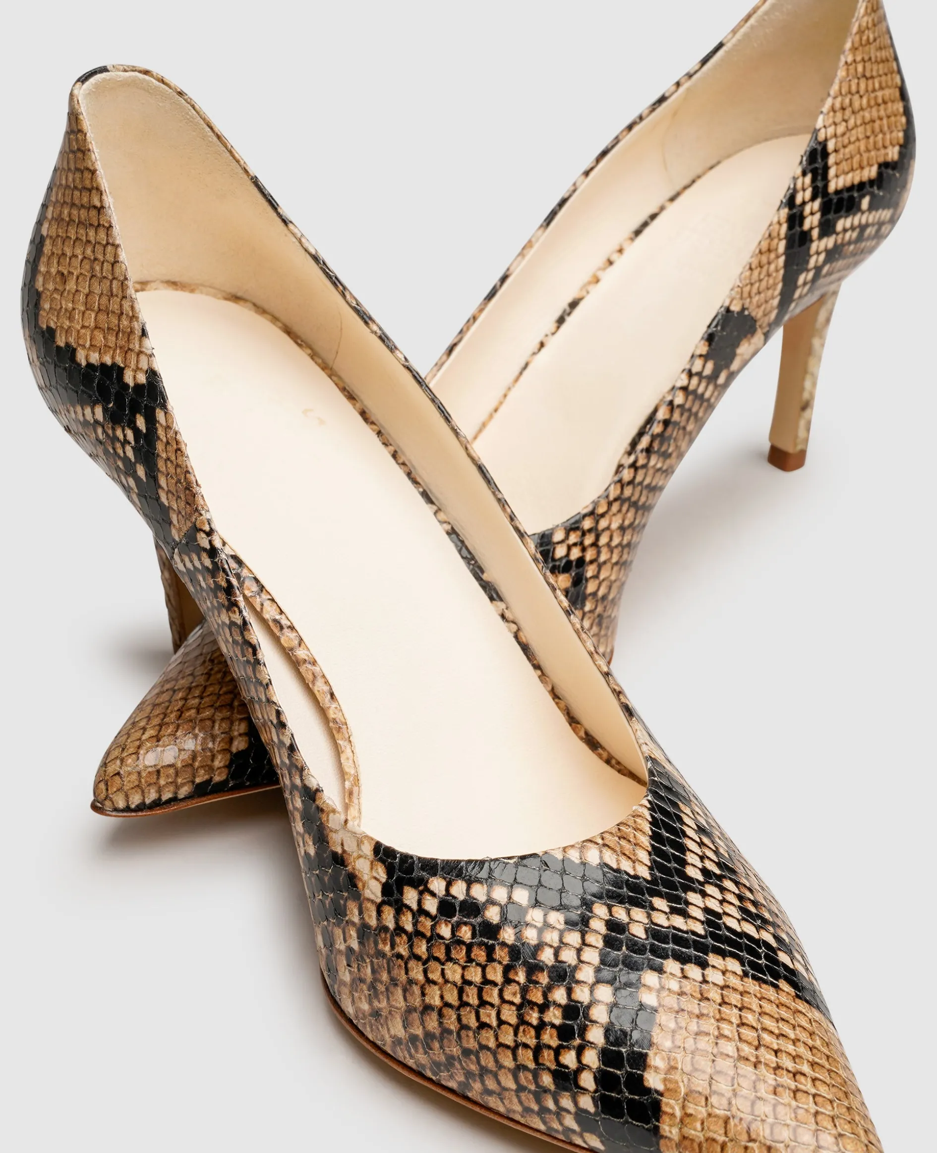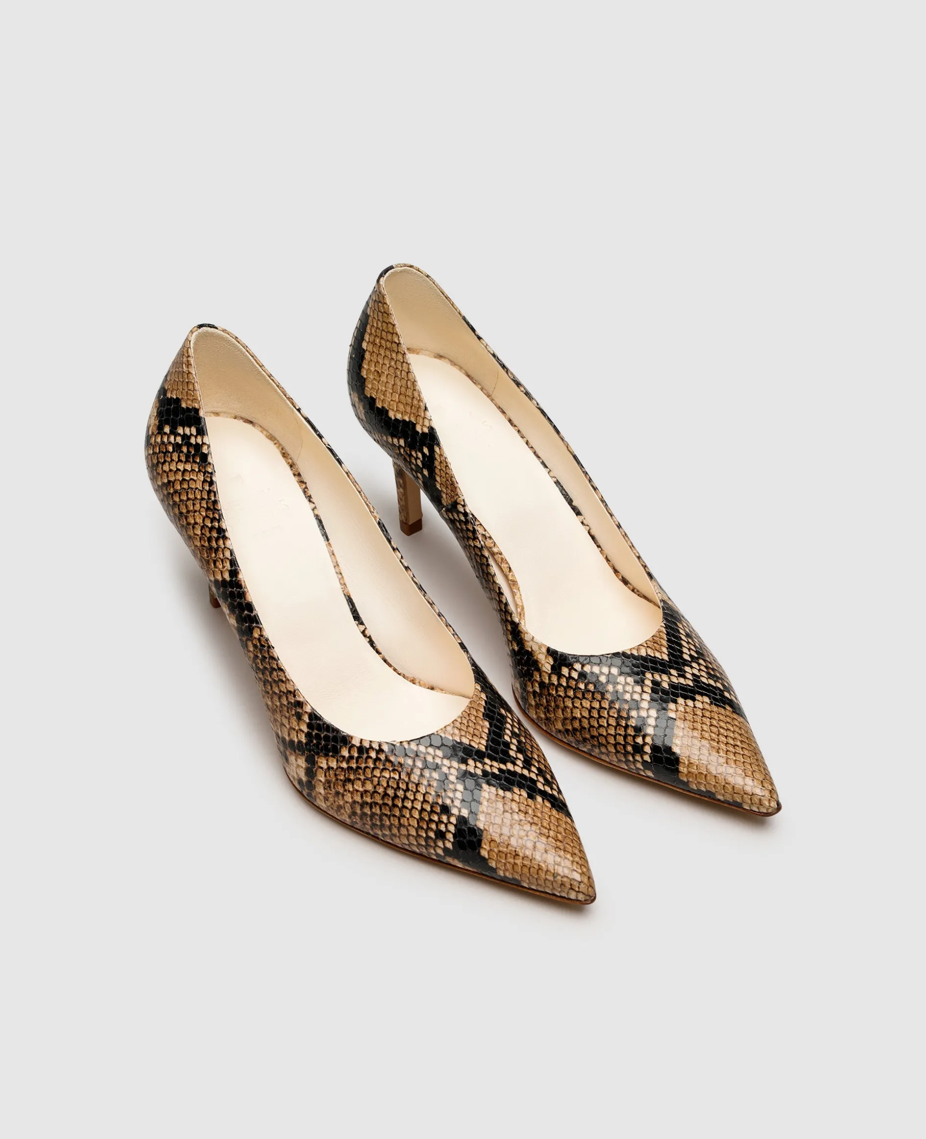 Für eine Zusammenkunft aus zeitloser Eleganz und modernem Zeitgeist stehen diese Damen-Pumps in Reptil-Optik. Das geschmeidige Oberleder vom Kalb erhält nach dem Gerbprozess die Prägung im angesagten Phyton-Muster und schafft es so, jedem noch so schlichten Look das besondere Etwas zu verleihen. Die Pumps mit der klassischen Spitze finden durch einen 7 Zentimeter hohen, filigranen Absatz und einer klassischen Ledersohle ihre anmutige Vollendung.