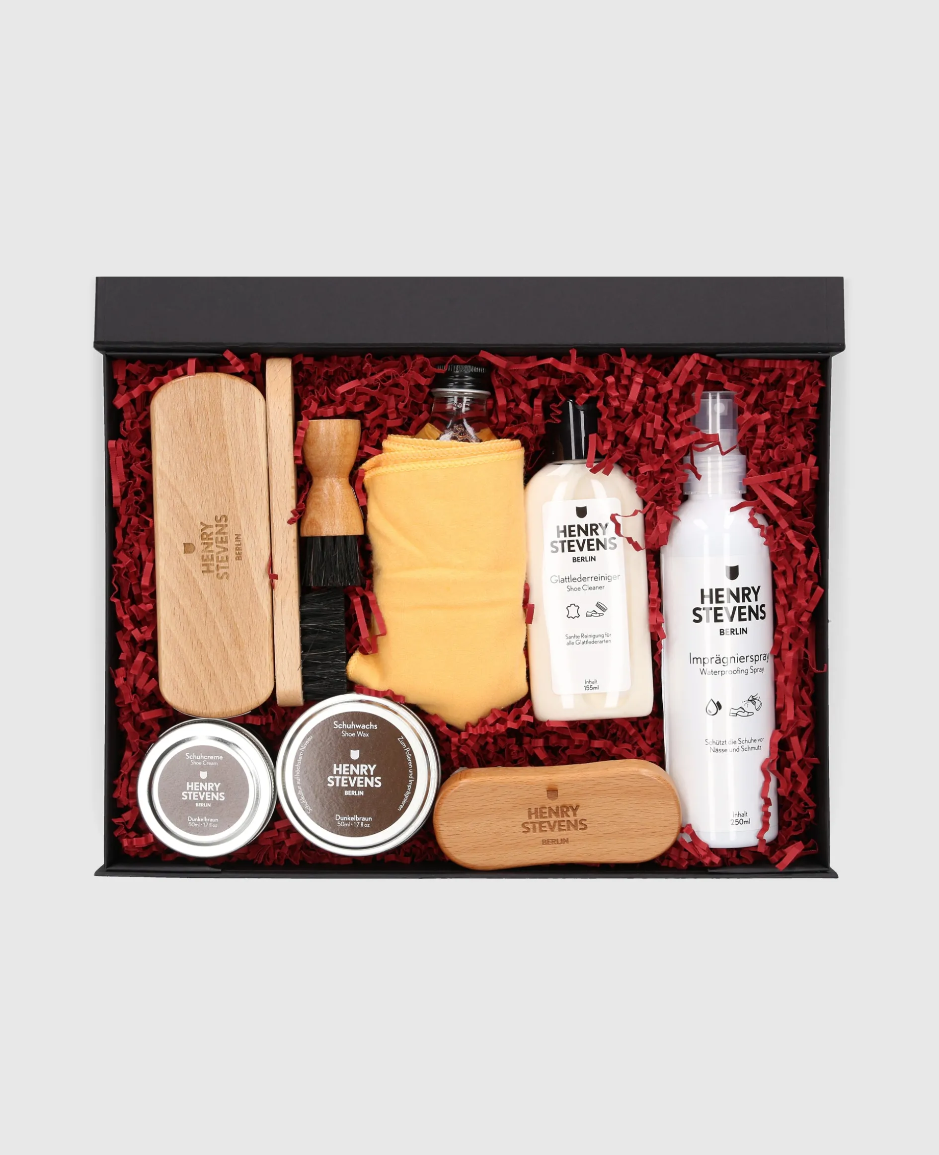 Verleihen Sie Ihren Schuhen Festtagsglanz mit dem exklusiven Schuhpflegeset von Henry Stevens. In edlem Dunkelbraun gehalten, vereint es Pflege der Spitzenqualität und stilvolle Eleganz – ein unverzichtbares Accessoire für anspruchsvolle Schuhliebhaber. Von hochwertigen Bürsten bis zu Creme und Wachs – ideal für makellos gepflegte Schuhe. Professionelle Pflege verpackt mit weihnachtlichem Charme sorgt für alle Ihre Ansprüche an die Schuhpflege.