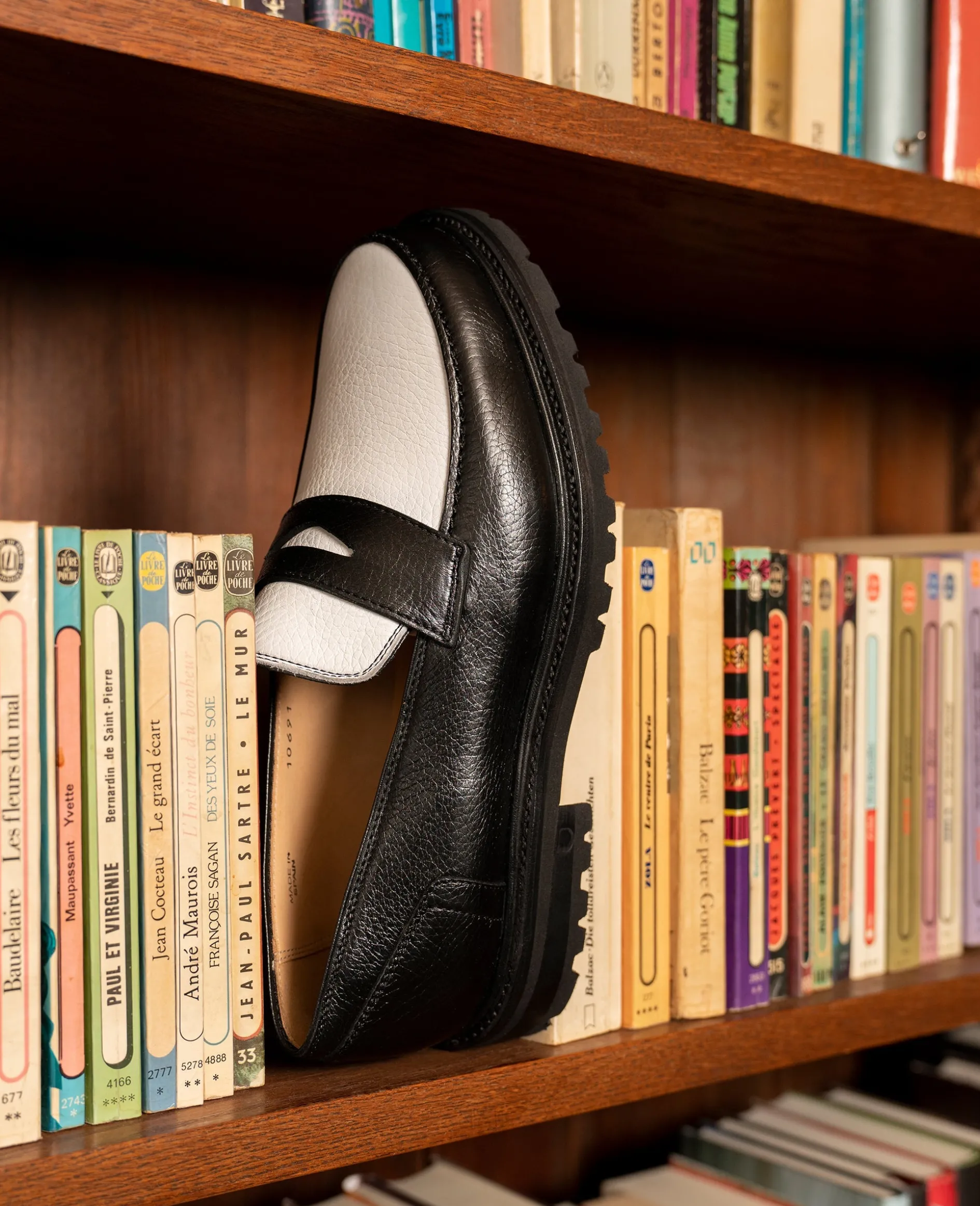 Der bequeme Schlupfschuh wurde Anfang des 20. Jahrhunderts erfunden und gilt als Weiterentwicklung des Mokassins. Sein Schaft verläuft unter dem Fuß entlang und wird auf der Oberseite mit dem Blatteinsatz geschlossen. Verfügt zusätzlich über Laufsohle und Absatz.