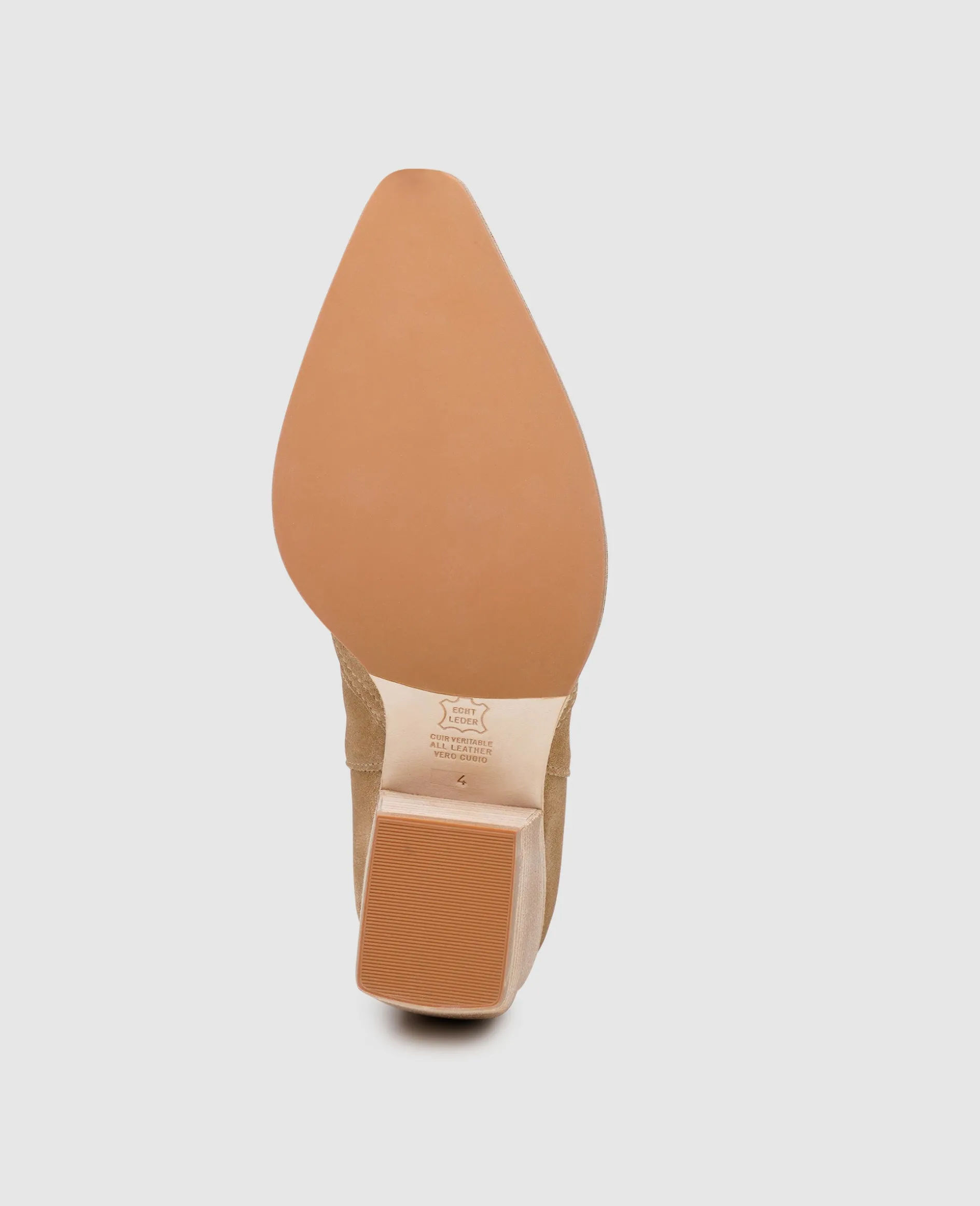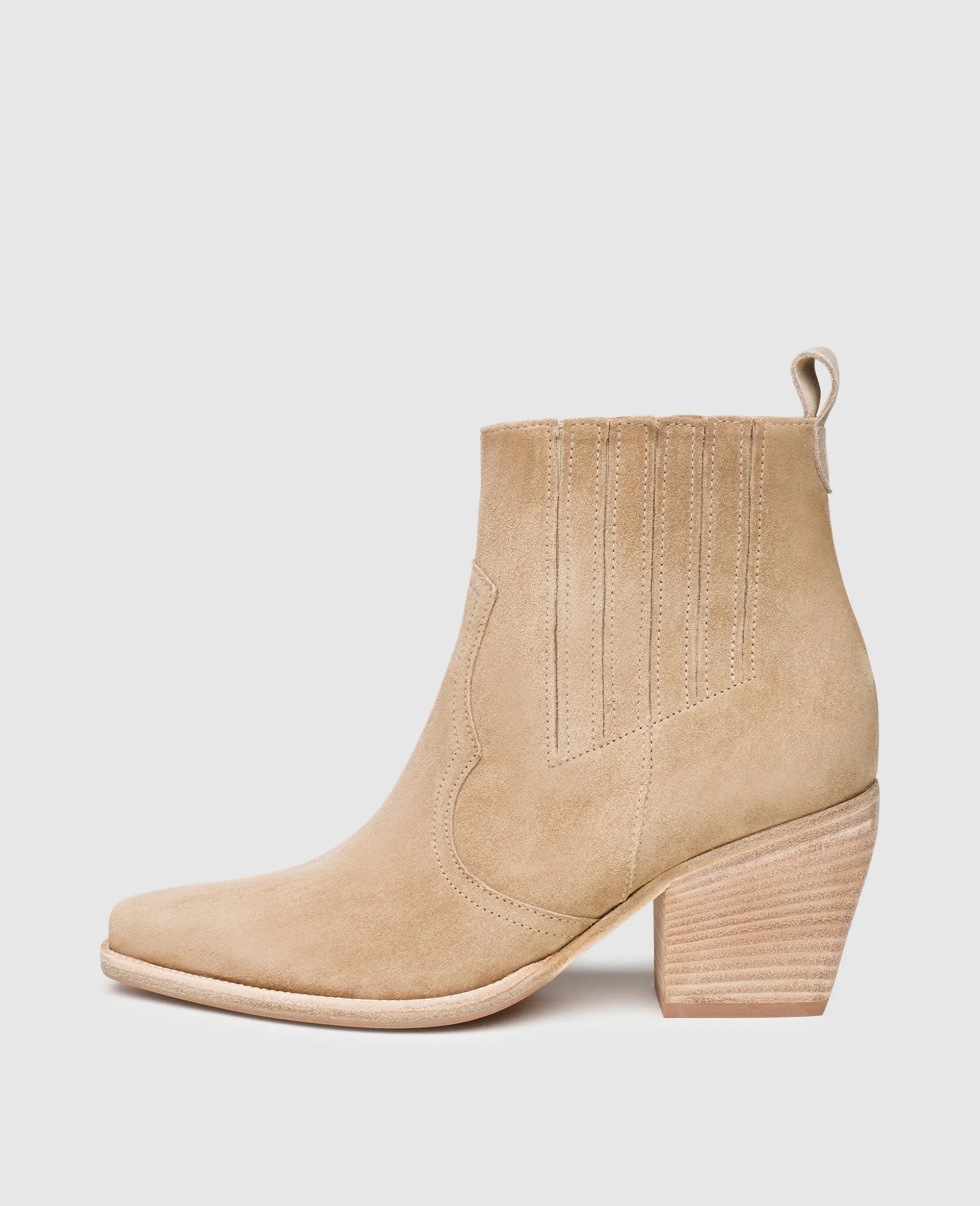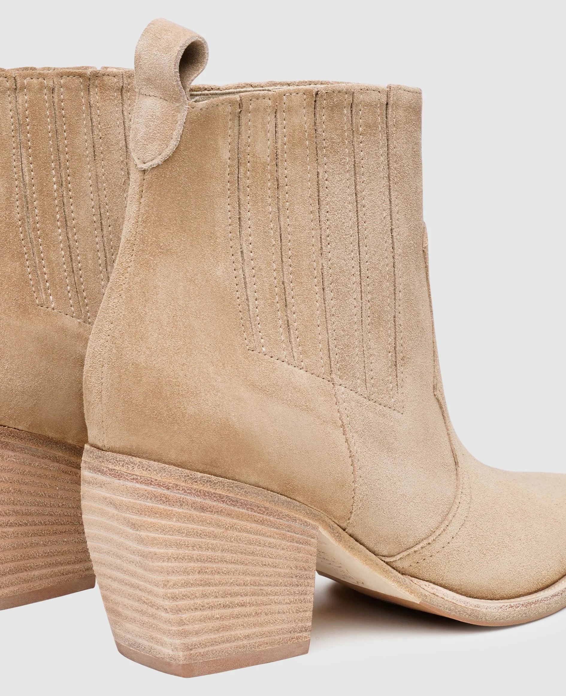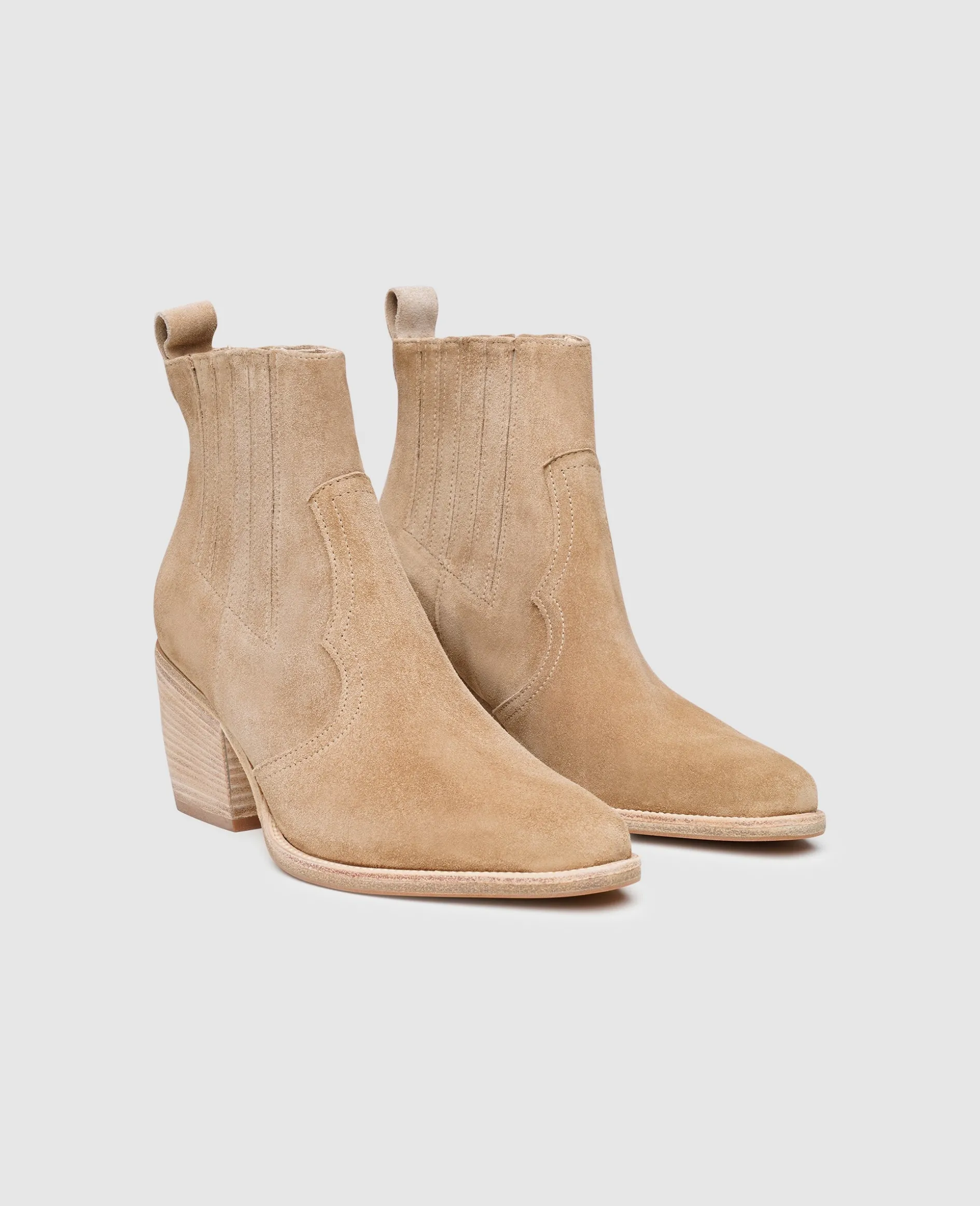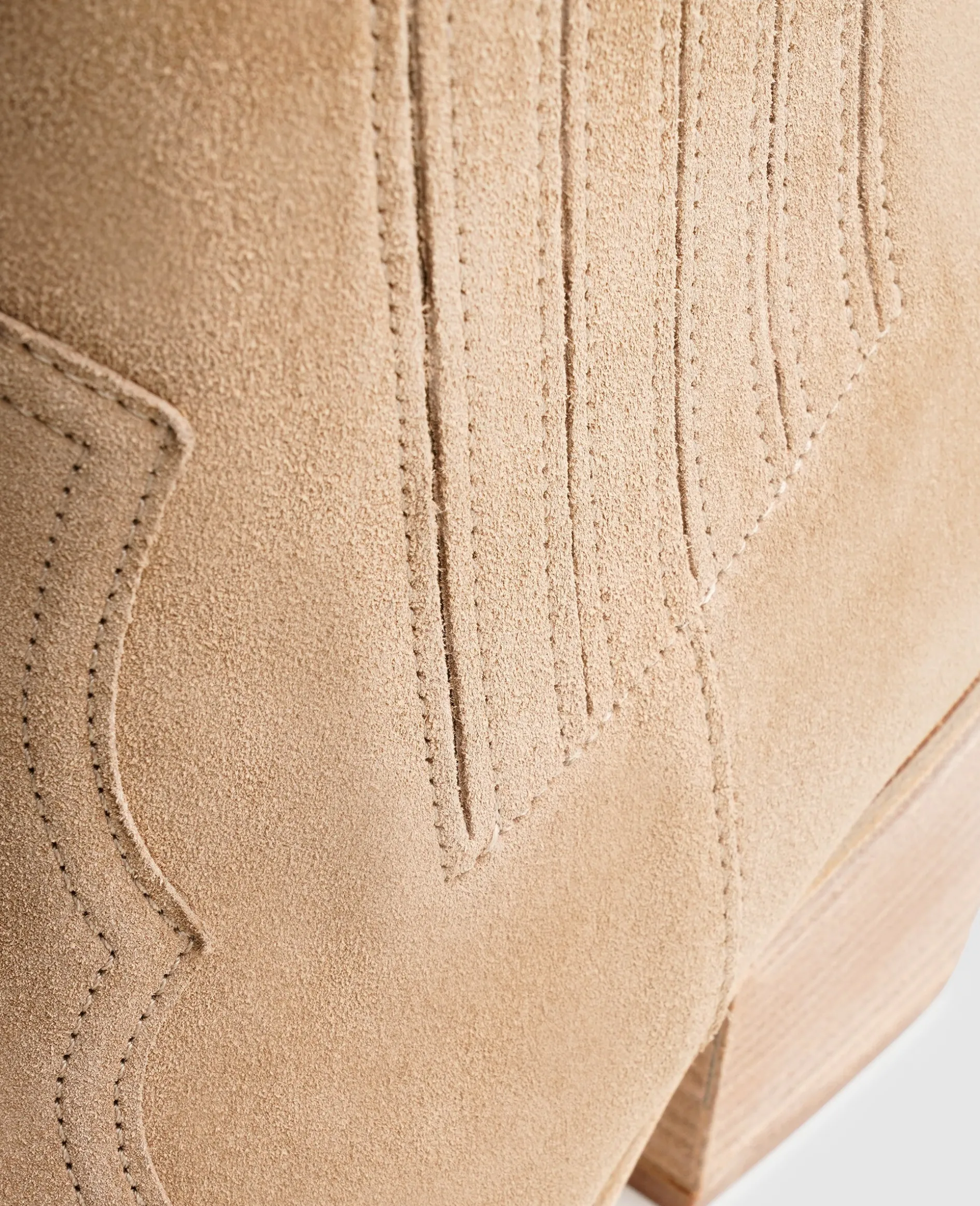 Der klassische Schnitt des Chelsea Boots erlebt bei diesem Modell aus geschmeidigem Velours ein besonders stylisches Update. Die Elastikeinsätze werden durch appliziertes Leder elegant verdeckt und erheben das Modell Luna zu einem echten Hingucker. Die Ziernähte auf dem Schaft verleihen der Stiefelette zusätzlich angesagte Details im Cowboystiefel-Stil.