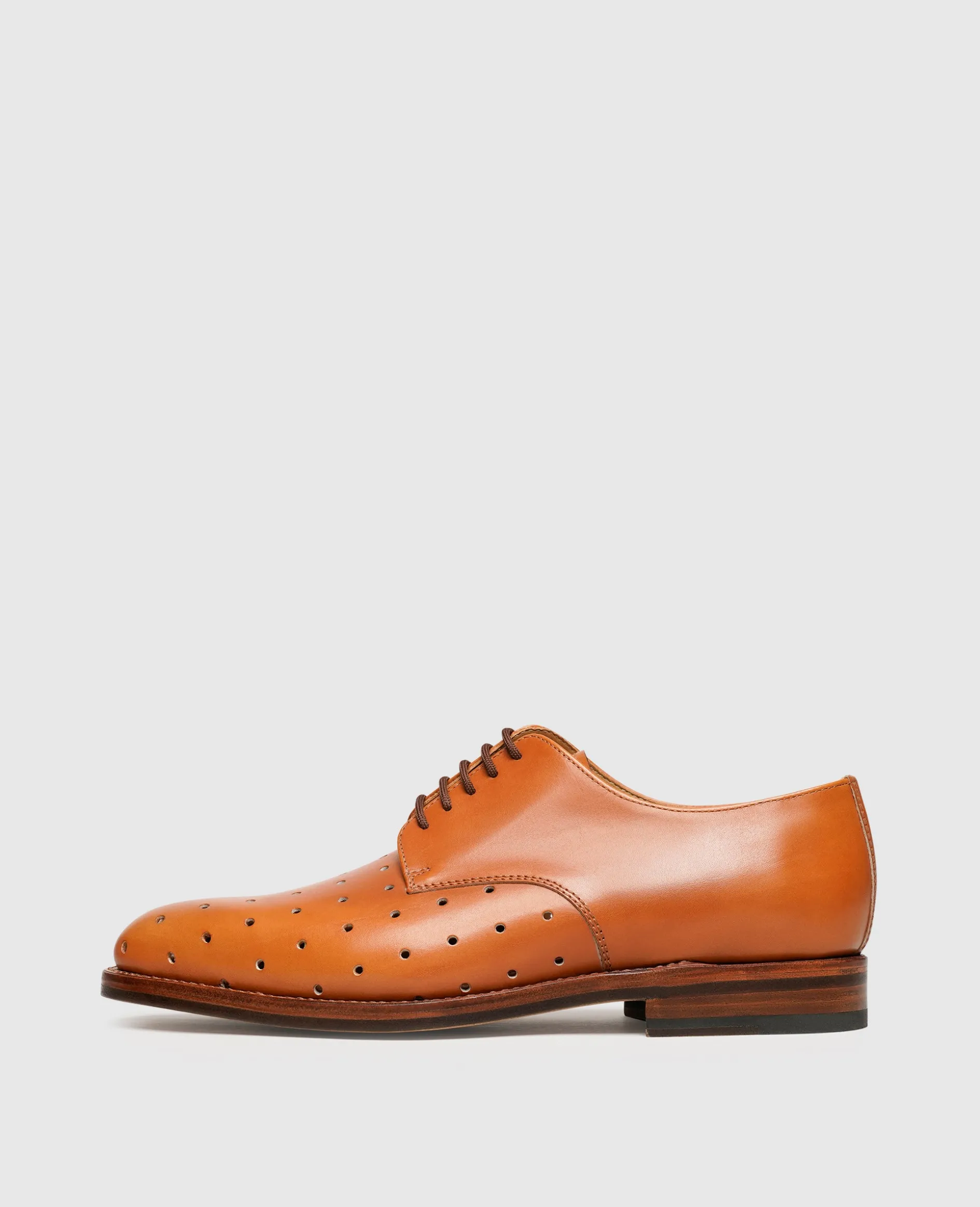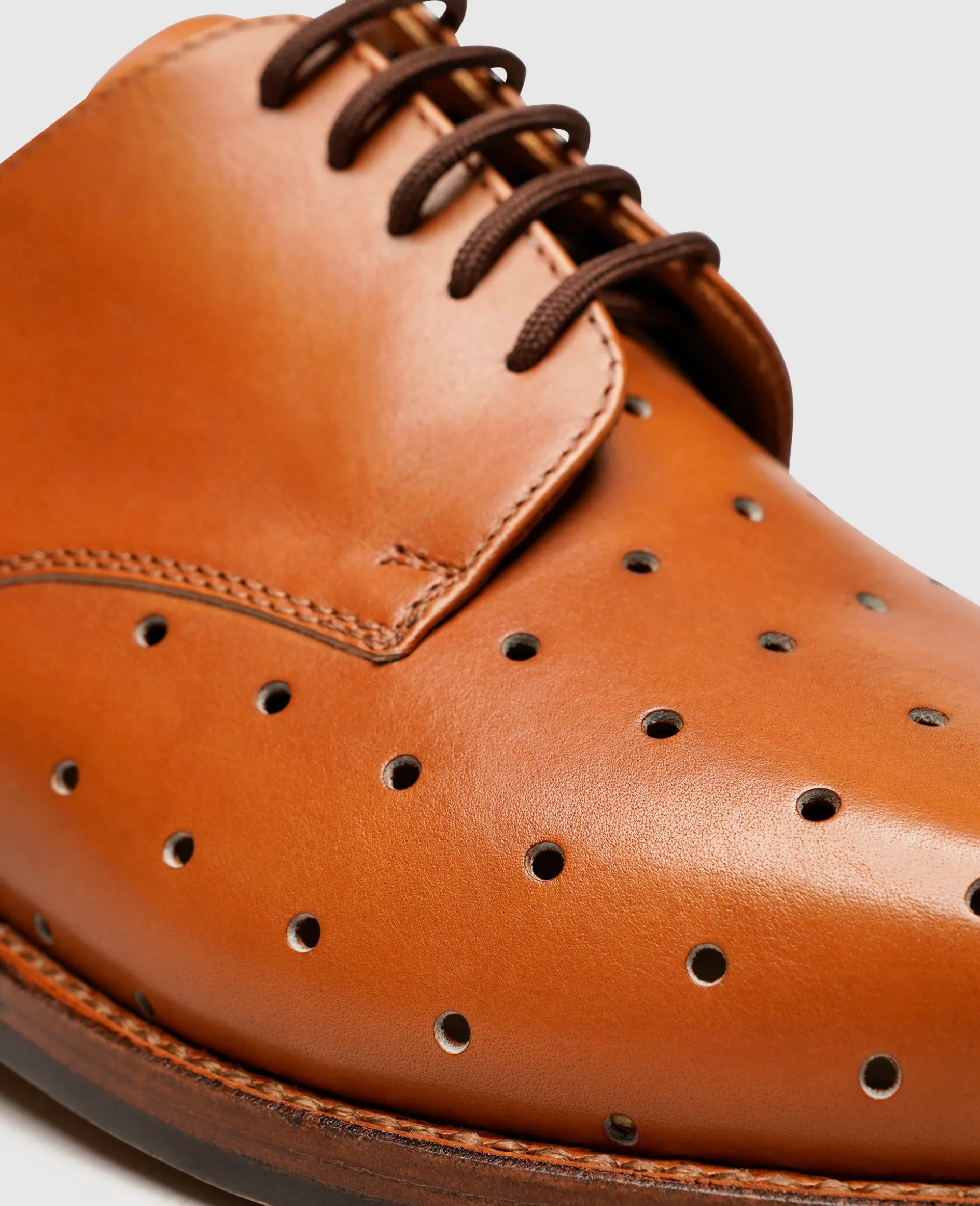Die rahmengenähten und handgefertigten Schnürschuhe für Herren von Heinrich Dinkelacker repräsentieren dynamische Anmut. Das Oberleder besteht aus feinstem Toscana Calf. Dank einer vollständigen Lochung auf dem vorderen Schaft erhält der klassische Herrenschuh eine gewisse Nonchalance. Das gelochte Oberleder garantiert auch im Sommer eine angenehme Luftzirkulation im Schuh. Die langlebige Doppelsohle aus Leder mit beständiger 3er-Nagelung rundet den Komfort ab.