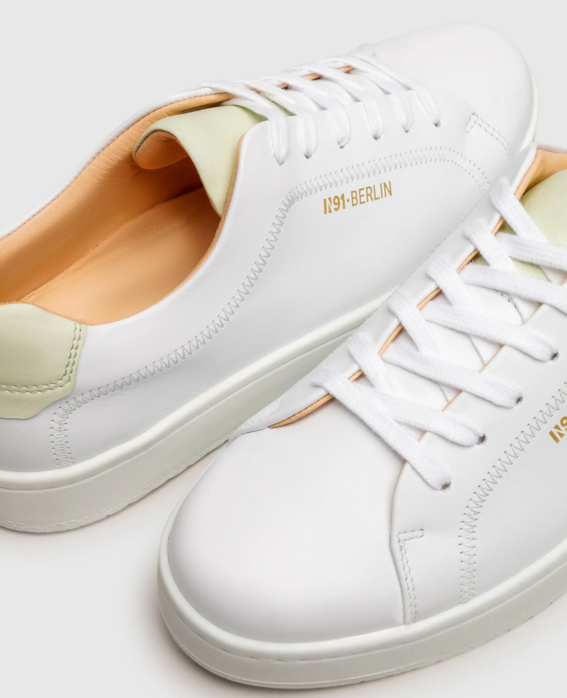Modernes Understatement manifestiert sich in diesem handgefertigten Damen-Sneaker aus der Kollektion von N91. Das Schuhoberteil, bestehend aus geschmeidigem Kalbsleder, wurde überwiegend in dezentem Weiß gehalten. Ebenso unaufdringlich präsentiert sich die flexible Gummilaufsohle, welche im Inneren mit einem praktischen Wechselfußbett ausgestattet ist. Highlight: Einzelne Farbelemente auf der Schuhlasche und der Hinterkappe sorgen für unaufdringliche Dynamik.
