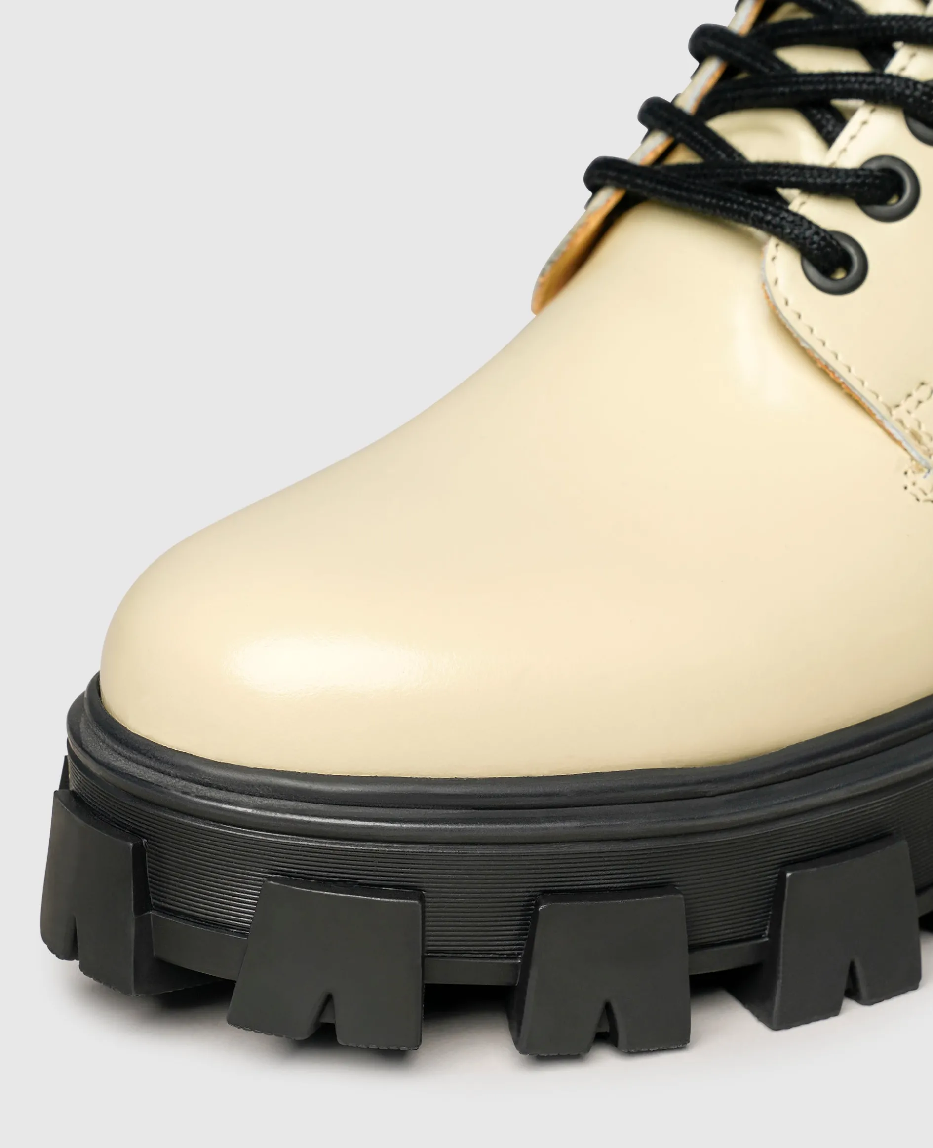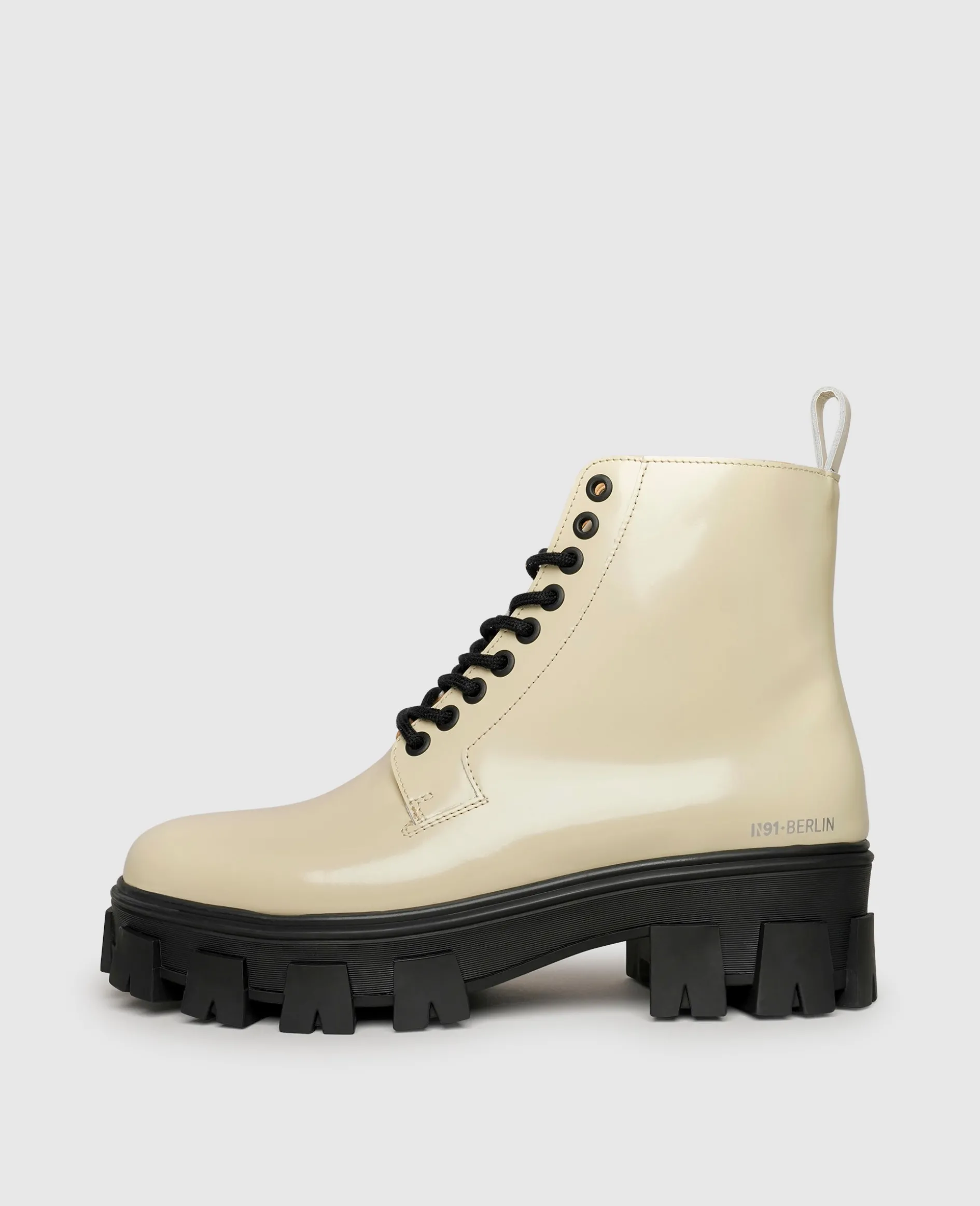Urbane Vibes versprüht diese extravagante Schnür-Stiefelette schon auf den ersten Blick. Die Kombination aus der auffälligen Gummisohle mit einem Plateau im Vorderfußbereich und dem glänzenden Leder vom Schaft sowie einer auffälligen Schnürung kreiert aus diesem Damenschuh ein echtes Statement-Piece. Auch im Inneren erwartet die Trägerin ein besonderes Detail, denn als Futterleder dient dem Modell kompostierbares Bio-Leder — komplett frei von Schadstoffen.