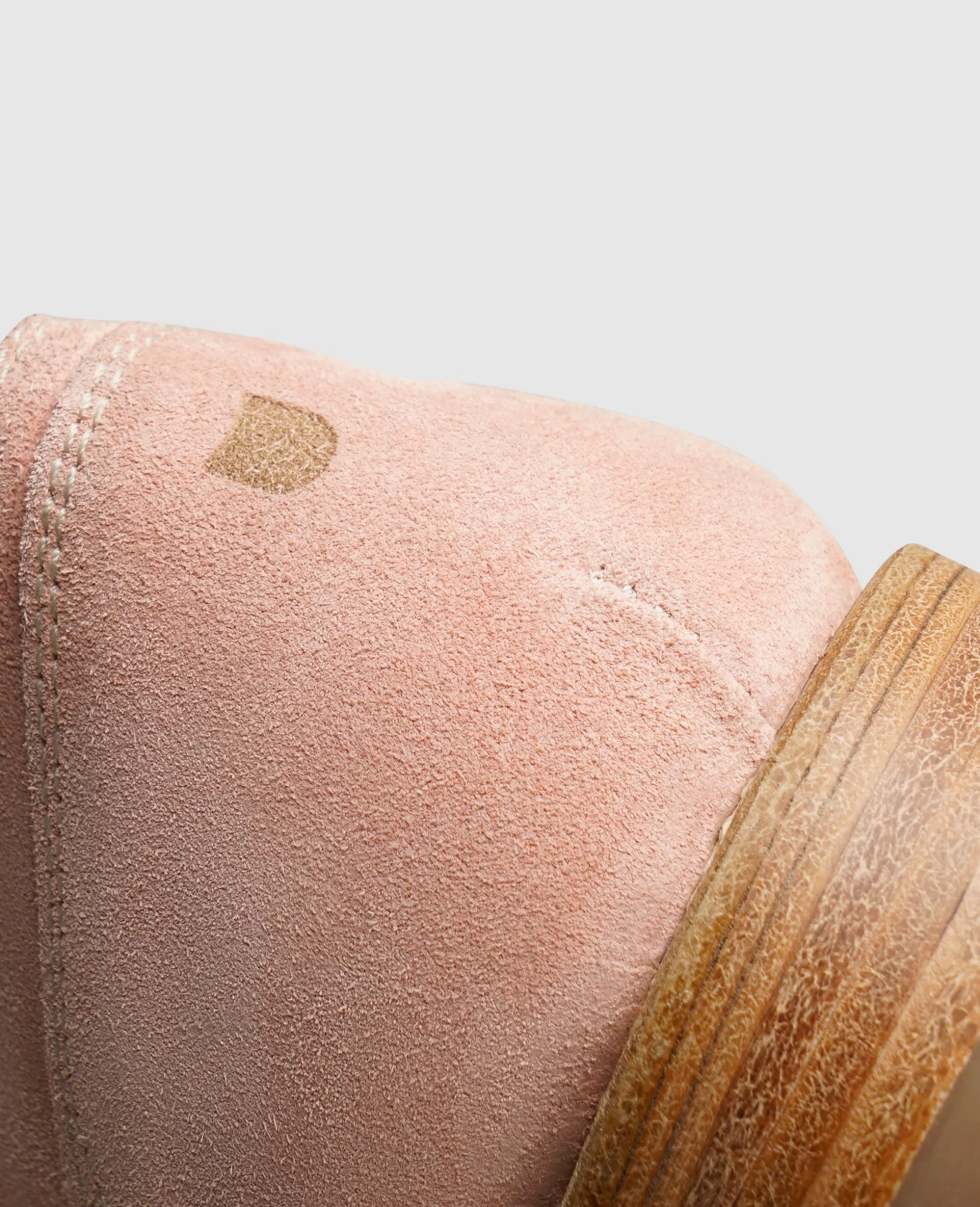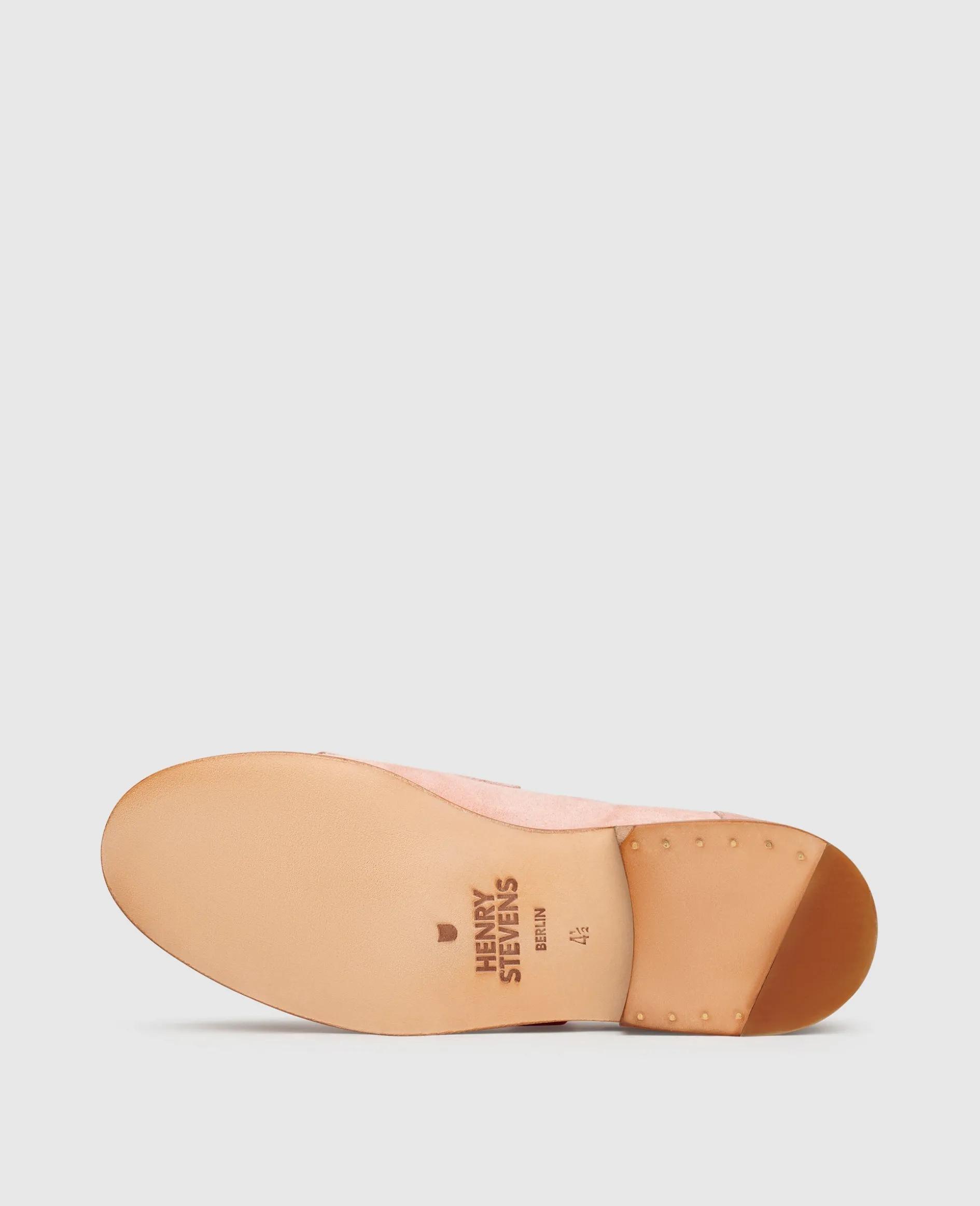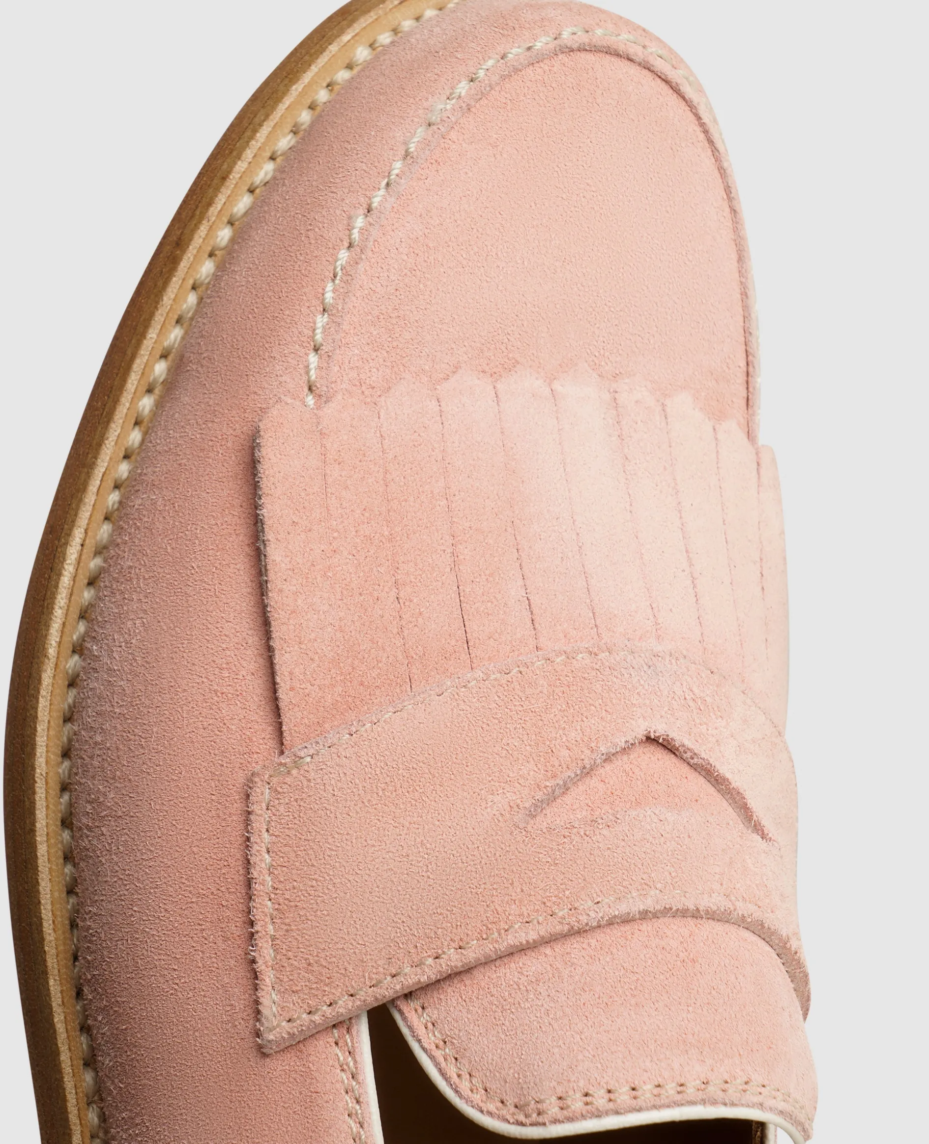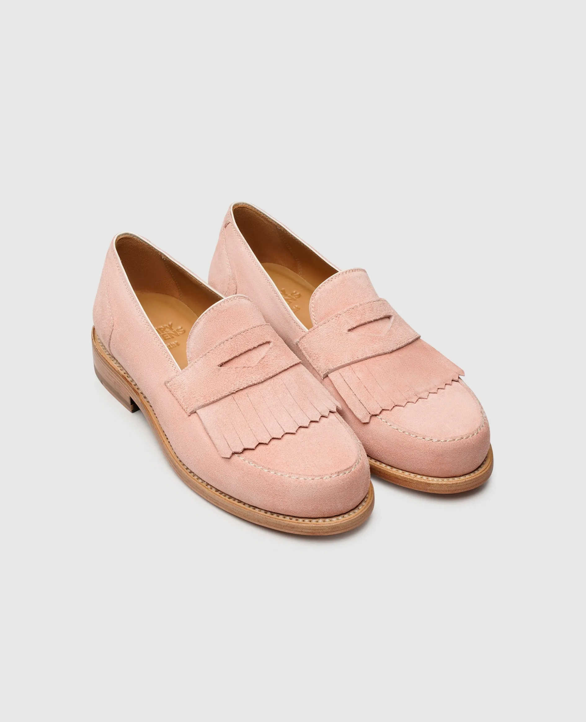 Eine wunderbare Leichtigkeit transportiert der handgefertigte Fringe Loafer Amelia. Das samtige Velours vom Schaft verleiht dem Damen-Schlupfschuh seine feminine Note, welche durch die runde Leistenform Vollendung findet. Der offene Schaftgrundschnitt wird von einem U-förmigen Blatteinsatz und einem traditionell quer über den Rist verlaufenden Lederriemen akzentuiert, welcher zusätzlich durch die namensgebenden Fransen den modernen Look komplettiert.