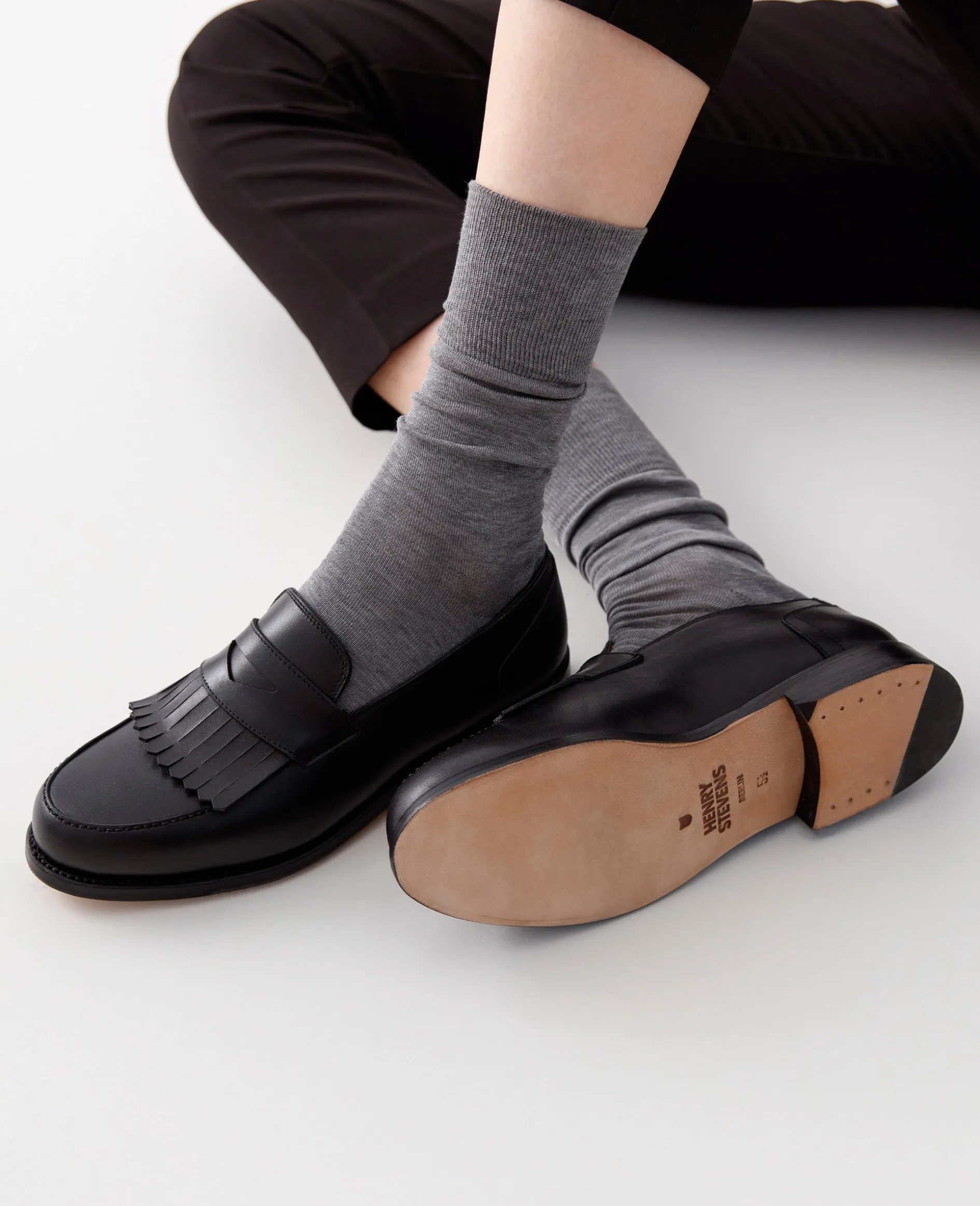Dieser Schlupfschuh vereint Klassik und Moderne und etabliert sich als absolutes Must-have. Die typische Applikation über dem Ristbogen, die einen Penny Loafer definiert, wird bei diesem Damenschuh noch um Fransen erweitert, die dem Klassiker zu einem dynamischen und angesagten Look verhelfen. Das feine Kalbsleder, das den Schaft der Fringe Loafer ziert, erweist sich als äußerst strapazierfähig und findet zudem durch die zeitlose Ledersohle Vollendung.