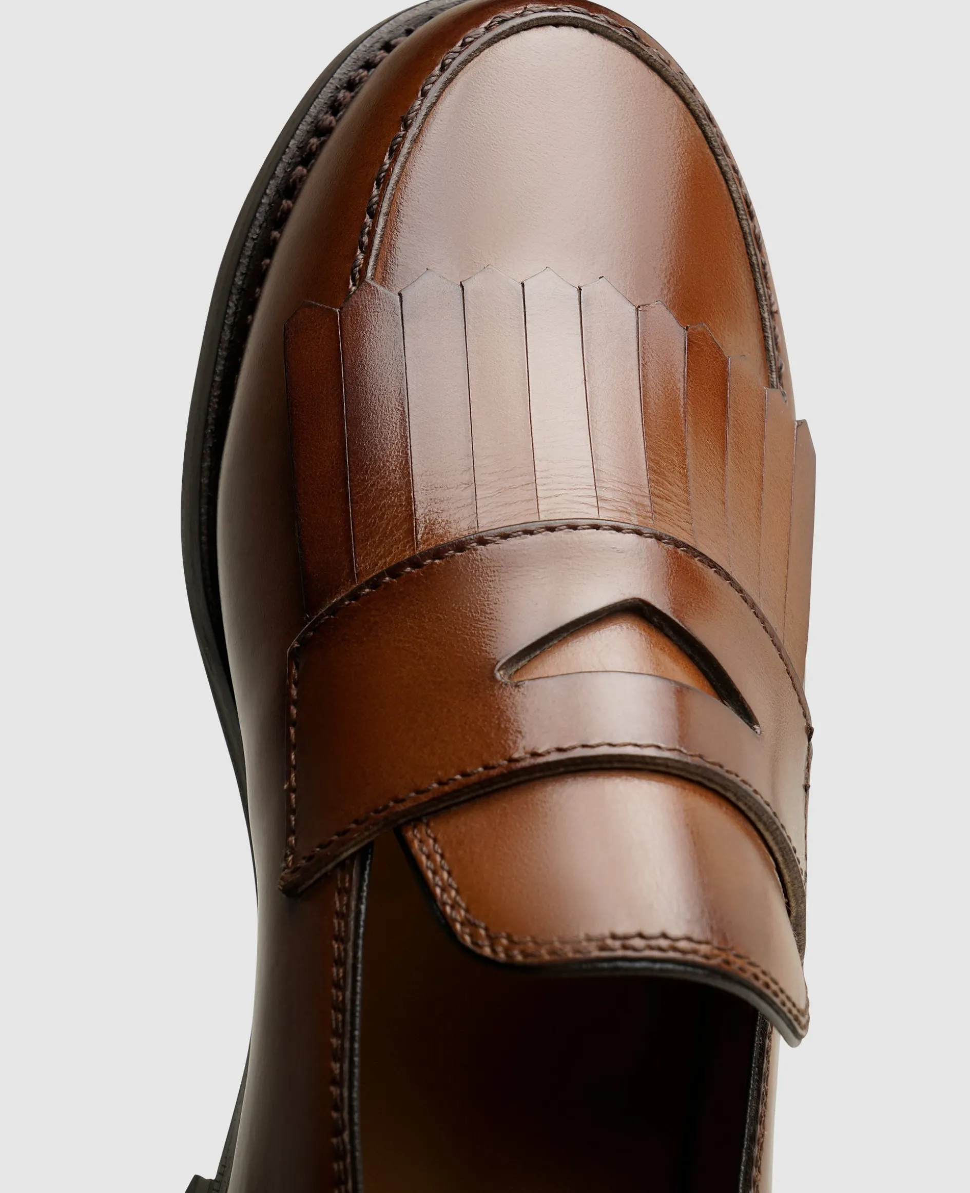 Dieser Schlupfschuh vereint Klassik und Moderne und etabliert sich als absolutes Must-have. Die typische Applikation über dem Ristbogen, die einen Penny Loafer definiert, wird bei diesem Damenschuh noch um Fransen erweitert, die dem Klassiker zu einem dynamischen und angesagten Look verhelfen. Das feine Kalbsleder, das den Schaft der Fringe Loafer ziert, erweist sich als äußerst strapazierfähig und findet zudem durch die zeitlose Ledersohle Vollendung.