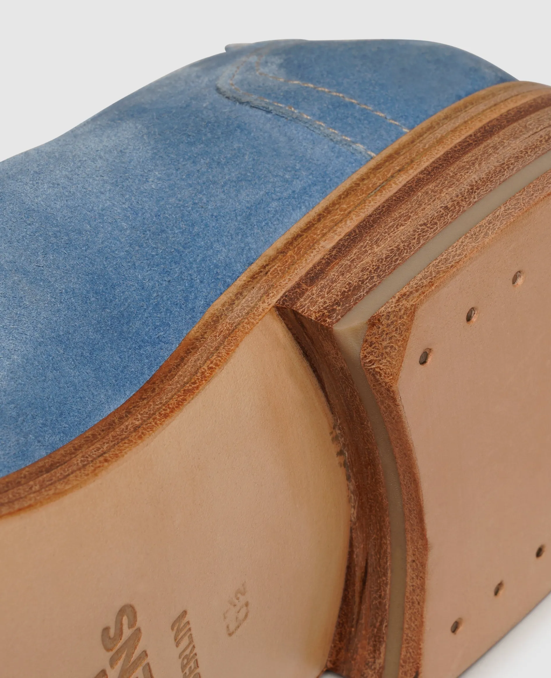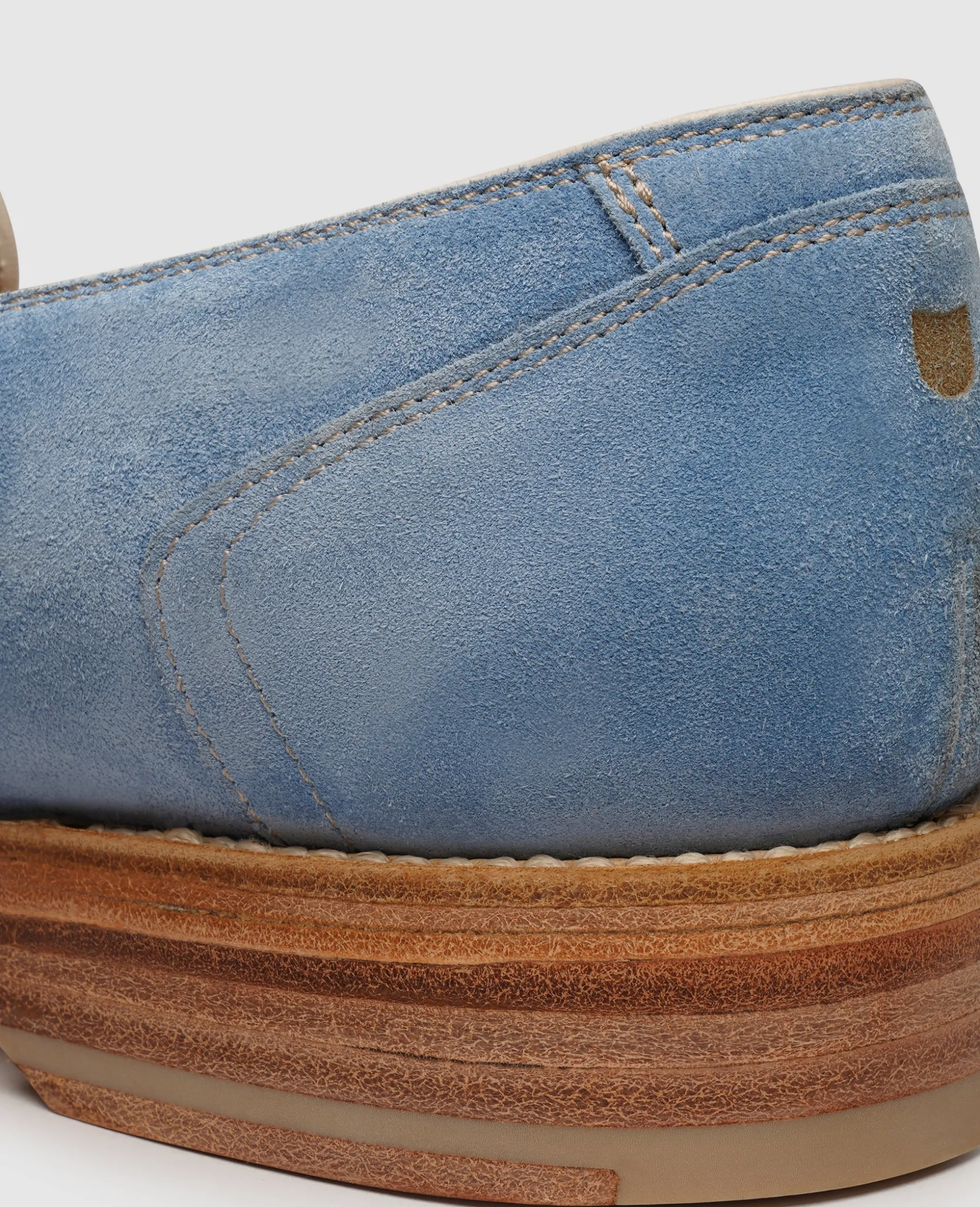 Der bequeme Schlupfschuh wurde Anfang des 20. Jahrhunderts erfunden und gilt als Weiterentwicklung des Mokassins. Sein Schaft verläuft unter dem Fuß entlang und wird auf der Oberseite mit dem Blatteinsatz geschlossen. Verfügt zusätzlich über Laufsohle und Absatz.