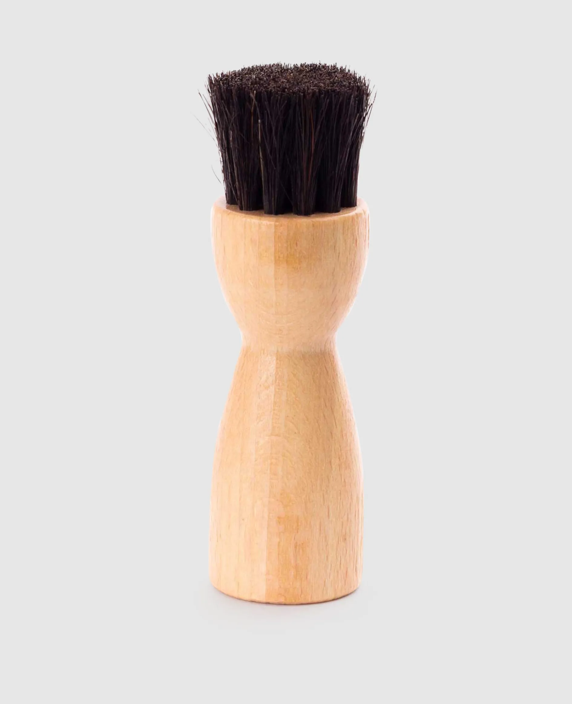 Die Auftragbürste, in Form eines Pinsels, ist eine Ergänzung zum Baumwolltuch, um Schuhcreme auf das Oberleder aufzutragen. Sie eignet sich besonders für stark strukturiertes Leder und erreicht schwer zugängliche Zonen des Schuhs, wo der Lappen versagt. Aus heimischer Buche in Deutschland gefertigt.