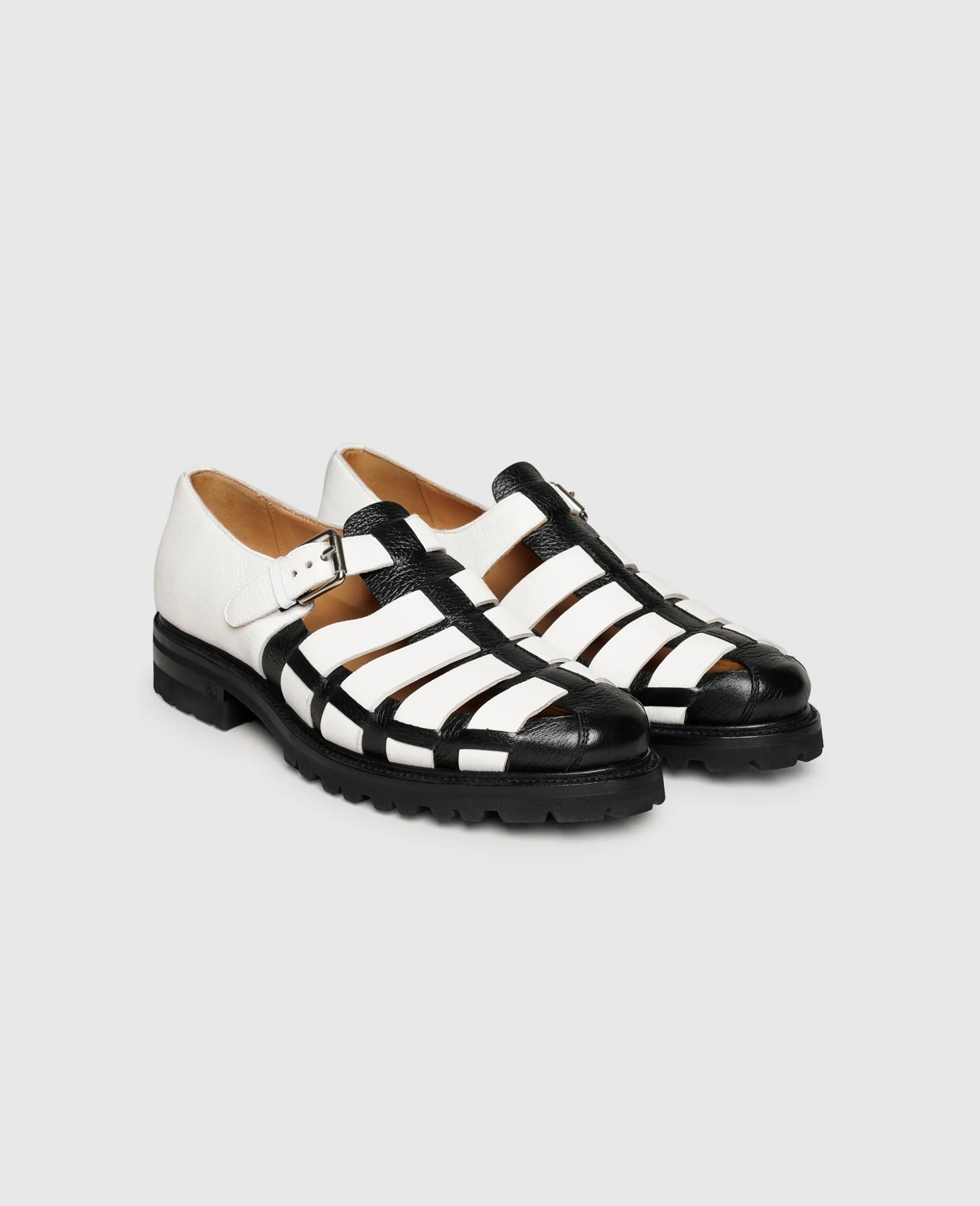 Diese rahmengenähten Sandalen von Henry Stevens sind die perfekte sommerliche Wahl für leichte und luftige Outfits. Im Schuhinneren des in Spanien handgefertigten Schuhs unterstützen das vegetabil gegerbte Innenfutter und das komfortable Fußbett aus Leder ein Tragegefühl auf höchstem Niveau. Das schwarz-weiße Herrenmodell wird durch Riemen aus glattem und weichem Hirschleder und einer Schnalle in der Weite reguliert. Durch die rutschfeste Laufsohle aus Gummi muss man auch bei langen Fußwegen nicht an Komfort einbüßen. Die Sandalen sorgen für die perfekte Abrundung Ihrer Freizeitlooks.