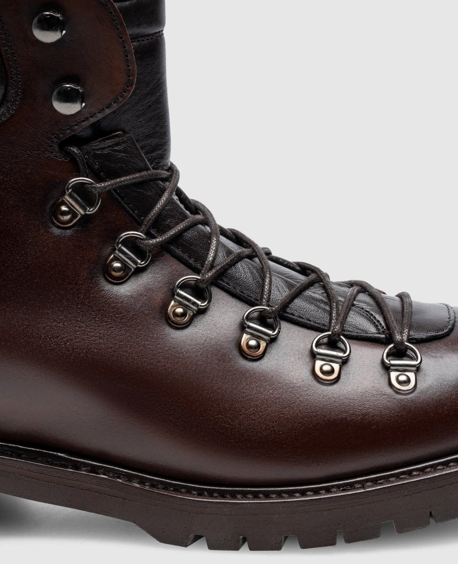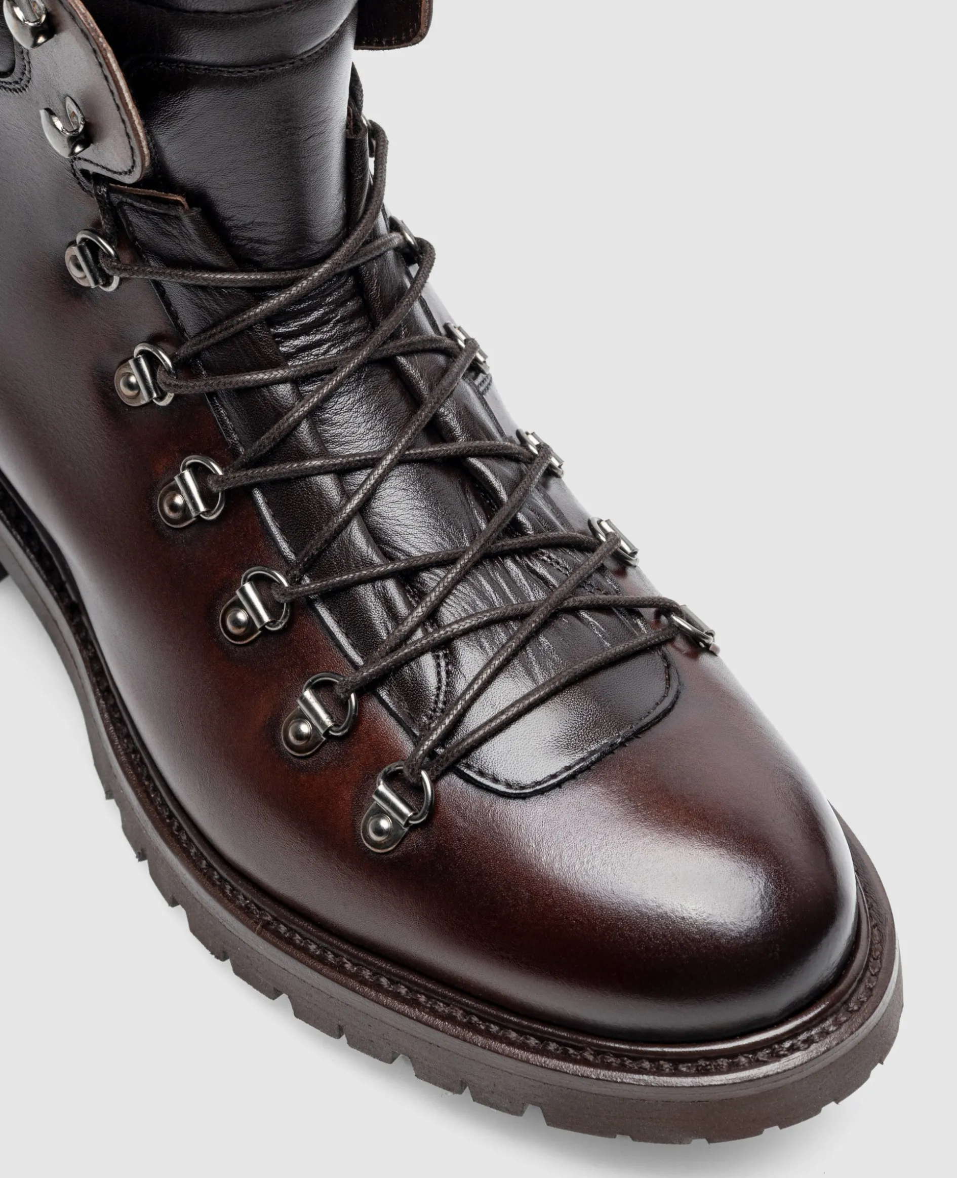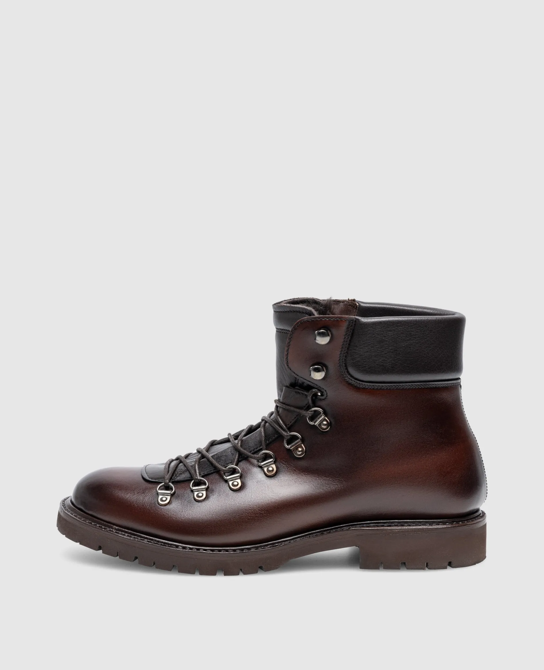 Der Barkley Hiking Boot in Schwarzbraun aus Kalbsleder mit Patina bietet ein Innenmaterial aus Lammfell und eine Gummisohle mit Profil. Durch die handgefertigte und rahmengenähte Machart vereint er robuste Materialien mit präziser Verarbeitung für hohen Komfort und Wetterbeständigkeit. Hergestellt in Spanien.