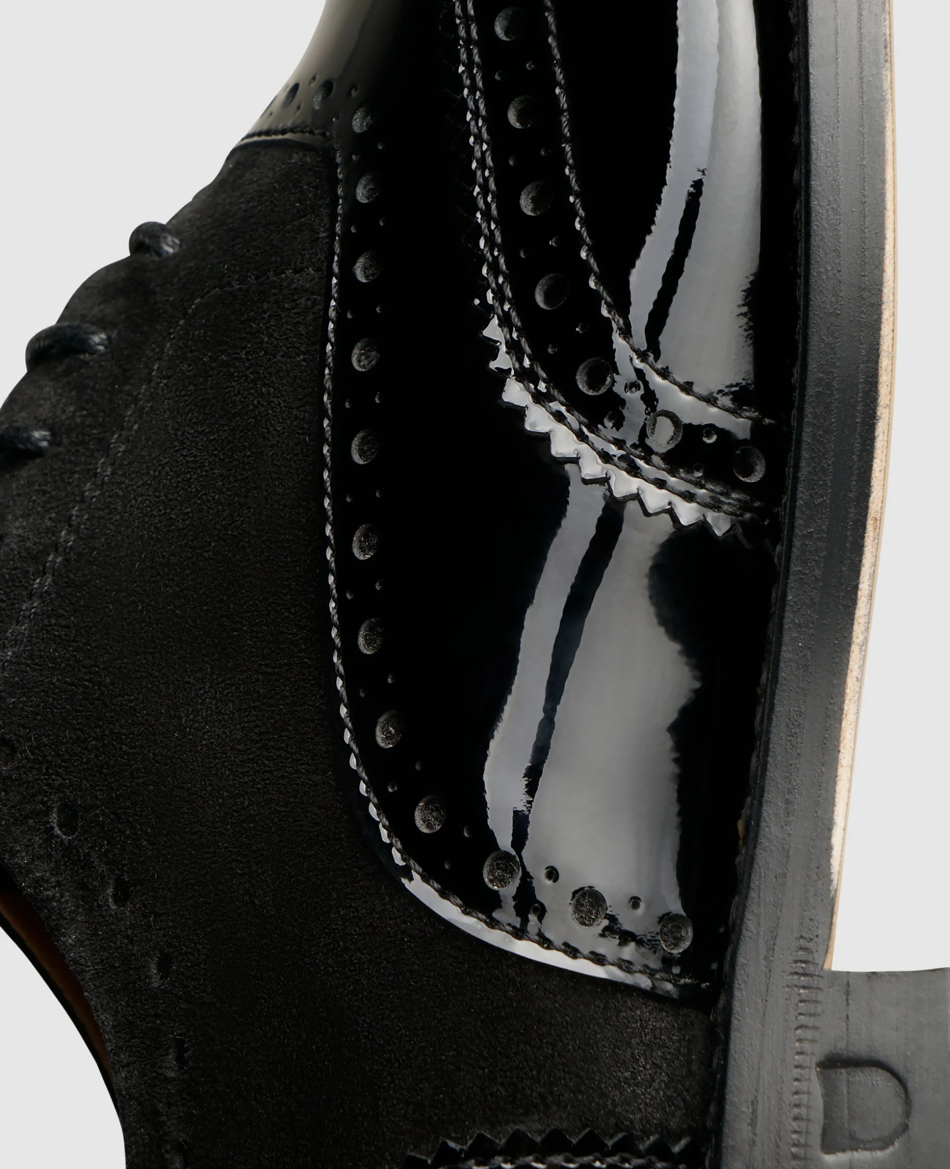 Einen Hauch Extravaganz versprüht dieser Full-Brogue Oxford dank einer Materialkombination aus samtigem Velours und elegantem Lackleder. Zusätzlich für anerkennende Blicke sorgt garantiert die wunderbare Lyralochung, welche die Schaftteilkanten aus feinem French Calf, welches durch den Polyurethan-Lack seinen Glanz erhält, ziert. An den Seitenteilen überzeugt geschmeidiges Velours mit seiner wunderbaren Haptik und komplettiert das außergewöhnliche Ensemble. Der rahmengenähte Damenschuh mit der geschlossenen Schnürung präsentiert sich mit seiner klaren Linienführung klassisch und elegant.