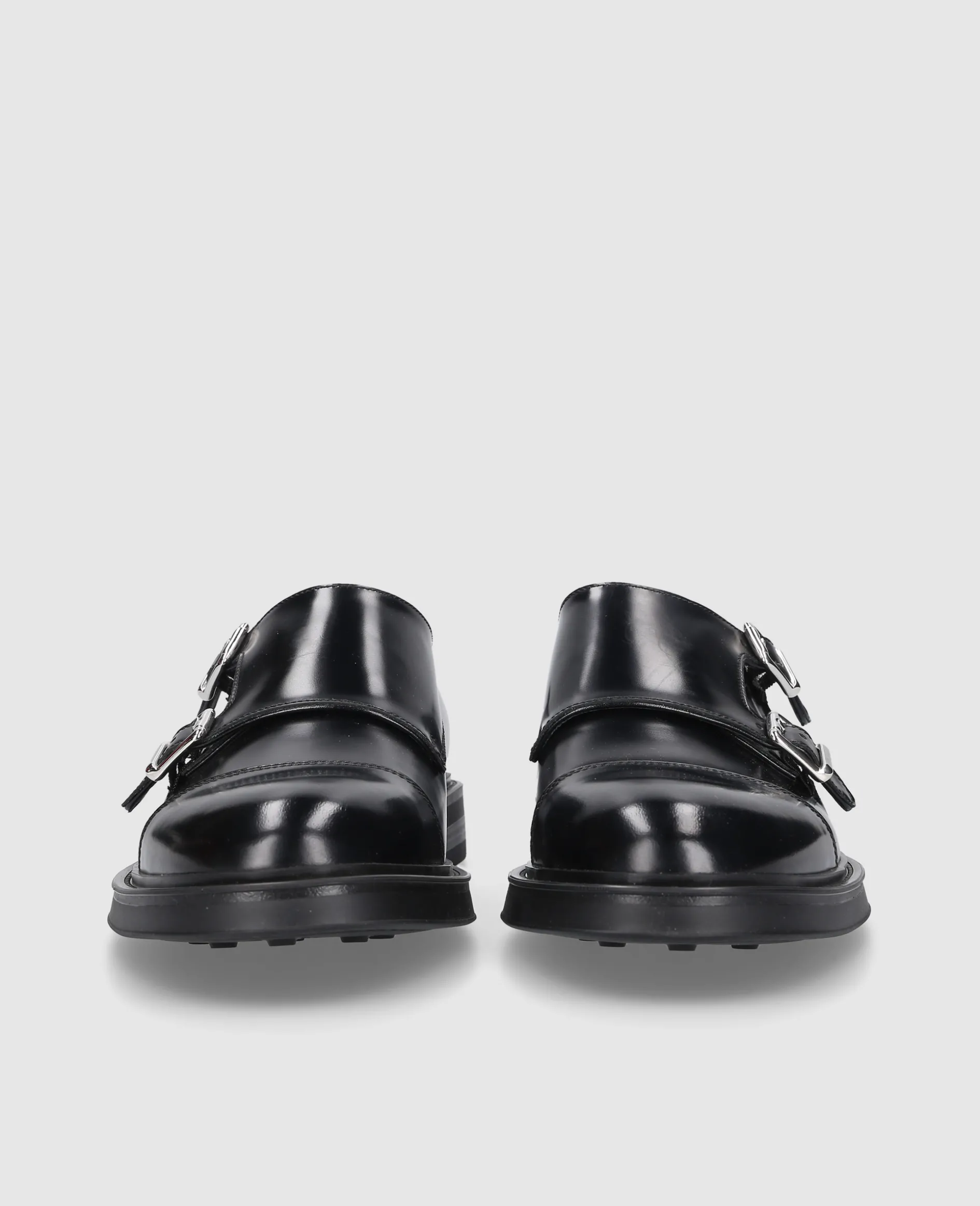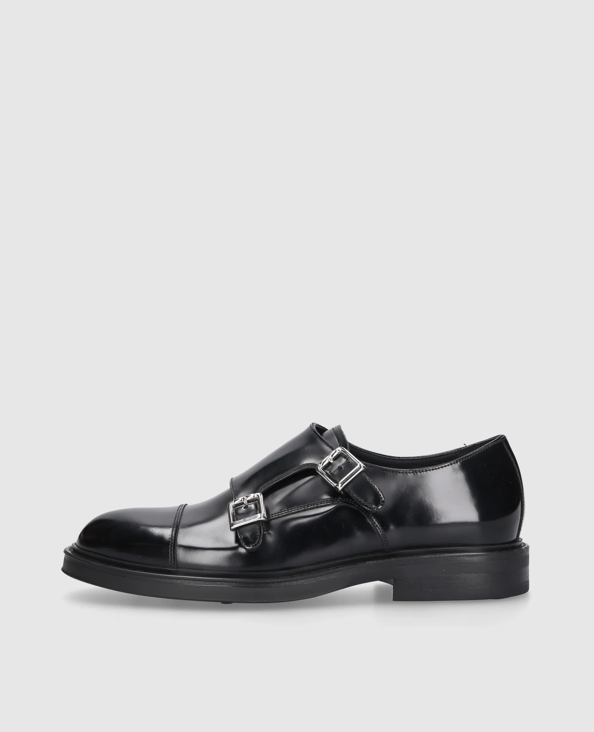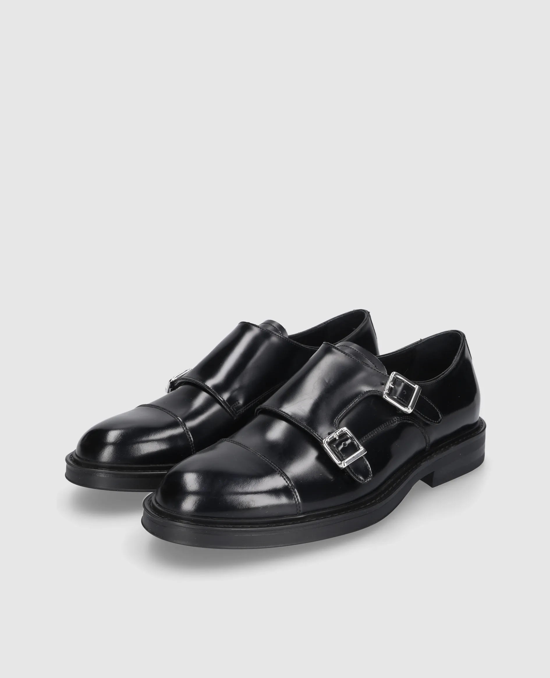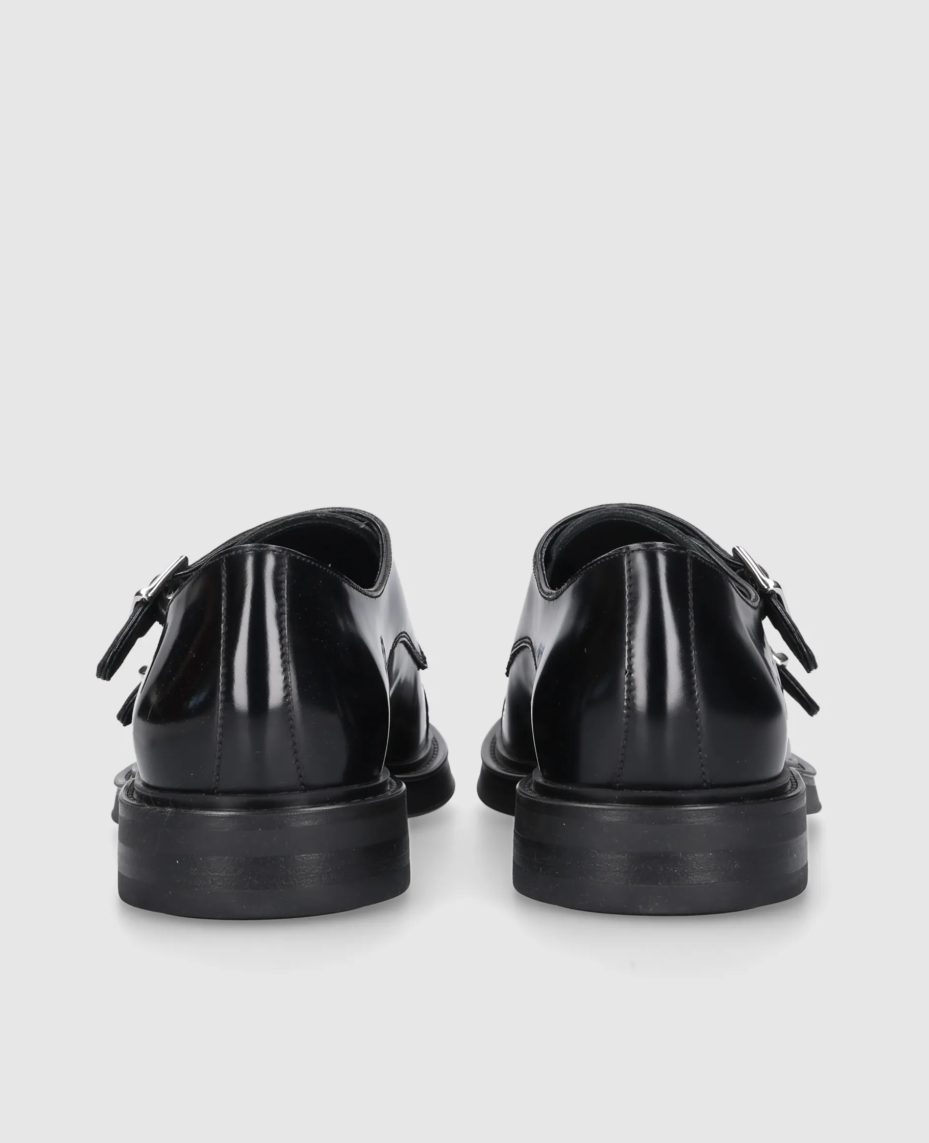 Schnallenschuh, dessen Grundschnitt einem Derby ähnelt und doch ein eigenständiges Schuhmodell beschreibt. Die Quartiere dieses Monkstraps werden durch die charakteristisch opulente Schnalle zusammengehalten.