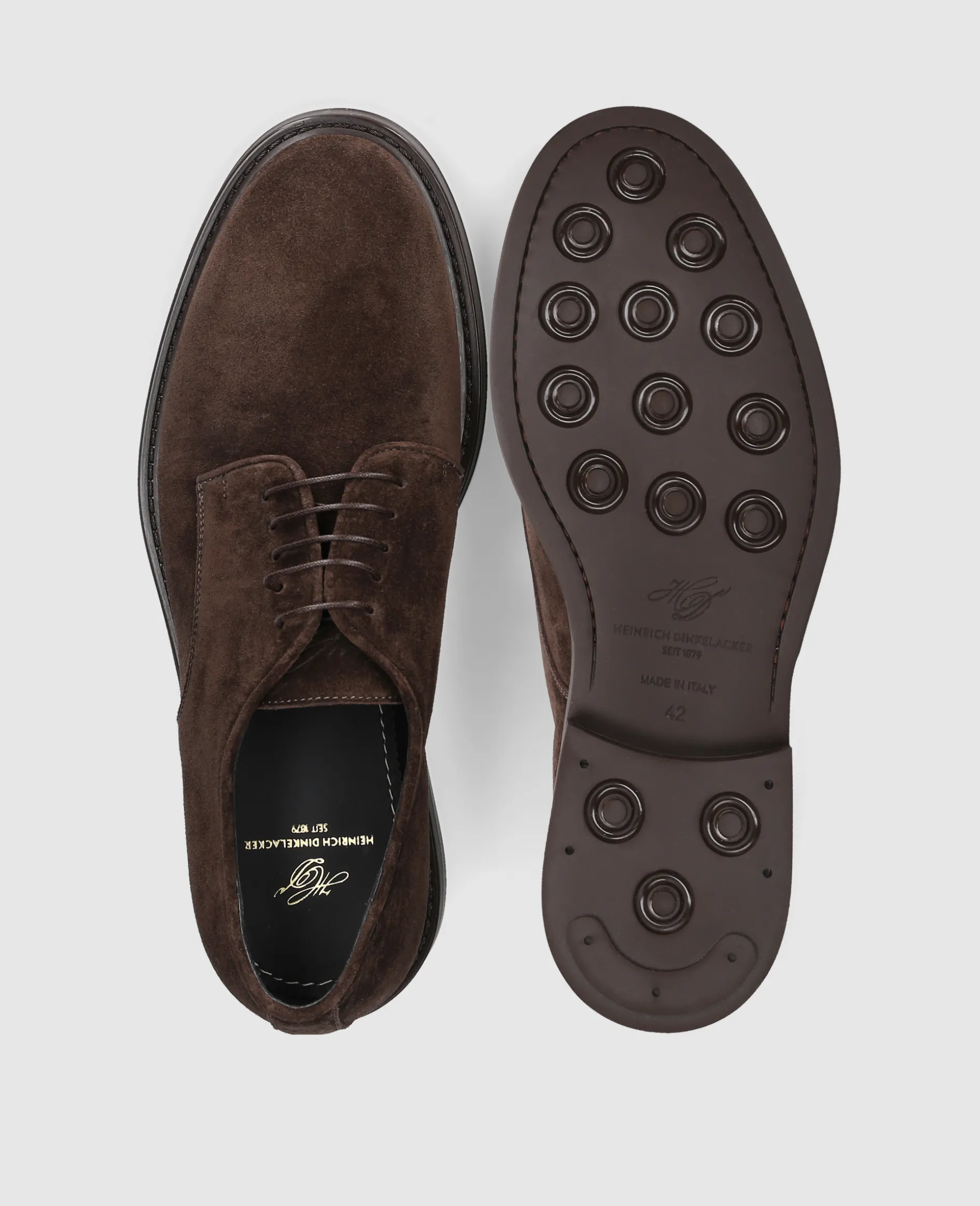 Der Florenz Plain V Plain Derby in Dunkelbraun steht für klassische Eleganz mit saisonalem Charakter. Gefertigt aus softem Veloursleder und ausgestattet mit einer leichten Profilsohle, passt er sich dem Alltag ebenso an wie dem Wetter. Von Hand gefertigt in der Toskana.