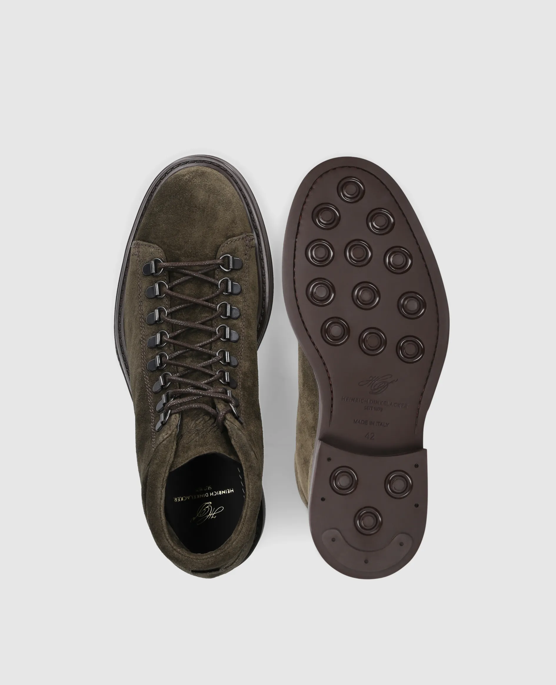Der Florenz Plain V Hiking Boot überzeugt in herbstlichem Dunkelgrün als stilvoller Begleiter für die Übergangszeit. Das Veloursleder mit weicher Haptik und die flexible Profilsohle sorgen gemeinsam für einen komfortablen Auftritt. Gefertigt auf dem breiten Florenz-Leisten und hergestellt in der Toskana.