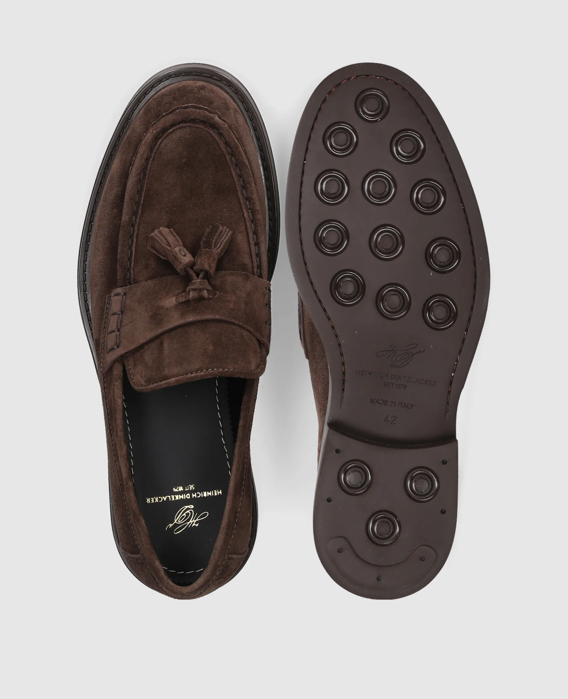 Der Florenz Plain V Tassel Loafer in tiefem Dunkelbraun kombiniert klassische Zurückhaltung mit lässiger Eleganz. Auf dem breiteren Florenz-Leisten gefertigt, bietet das weiche Veloursleder in Kombination mit der leichten Gummisohle optimalen Tragekomfort. Ein stilvoller Begleiter für herbstliche Tage. Hergestellt in der Toskana.