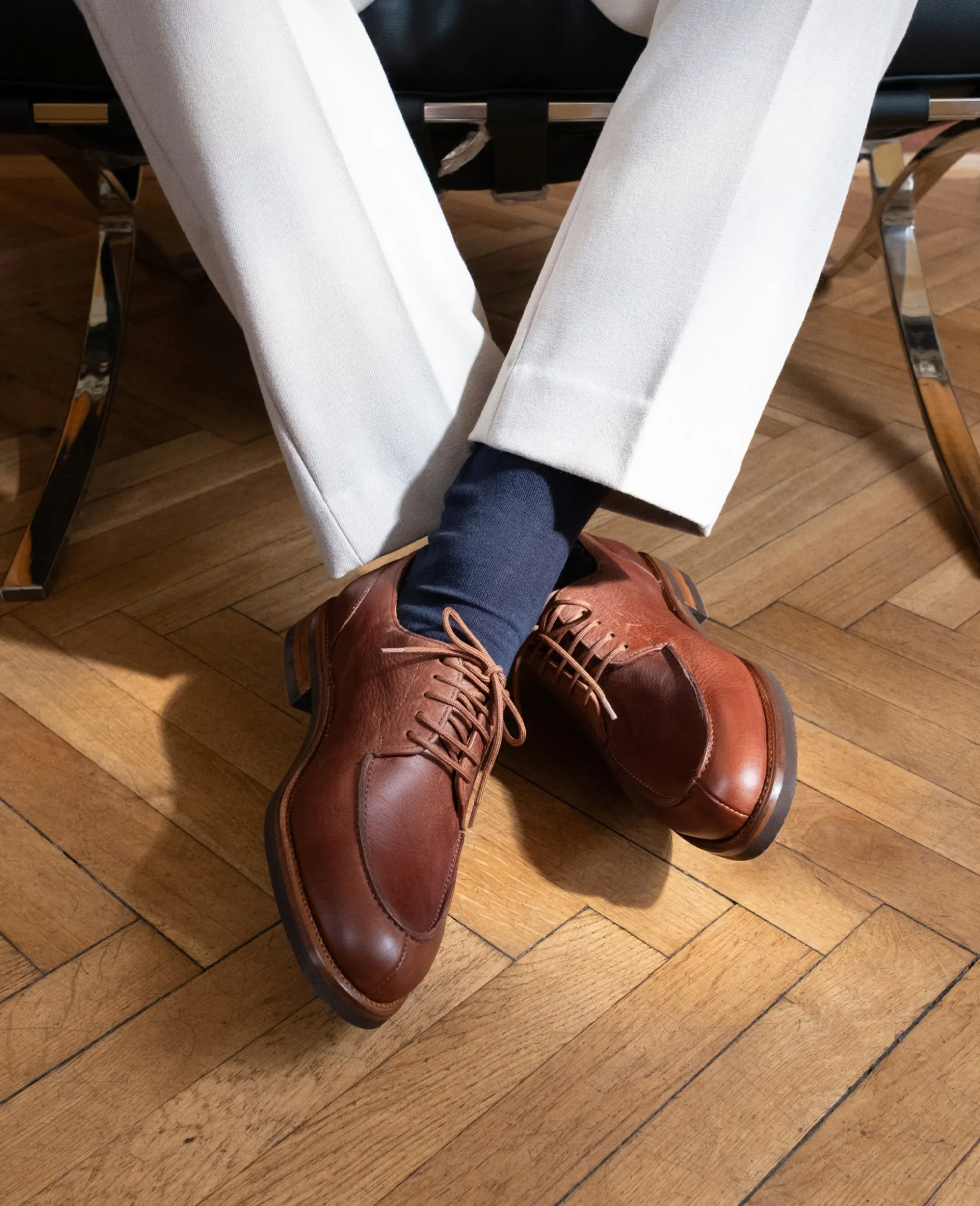Die Königsdisziplin der Schuhfertigung. In einem aufwendigen Verfahren werden Schaft und Laufsohle mittels eines dünnen Lederstreifens miteinander vernäht. Die Schuhe sind dadurch extrem stabil, langlebig, formbeständig und äußerst reparaturfreundlich.
