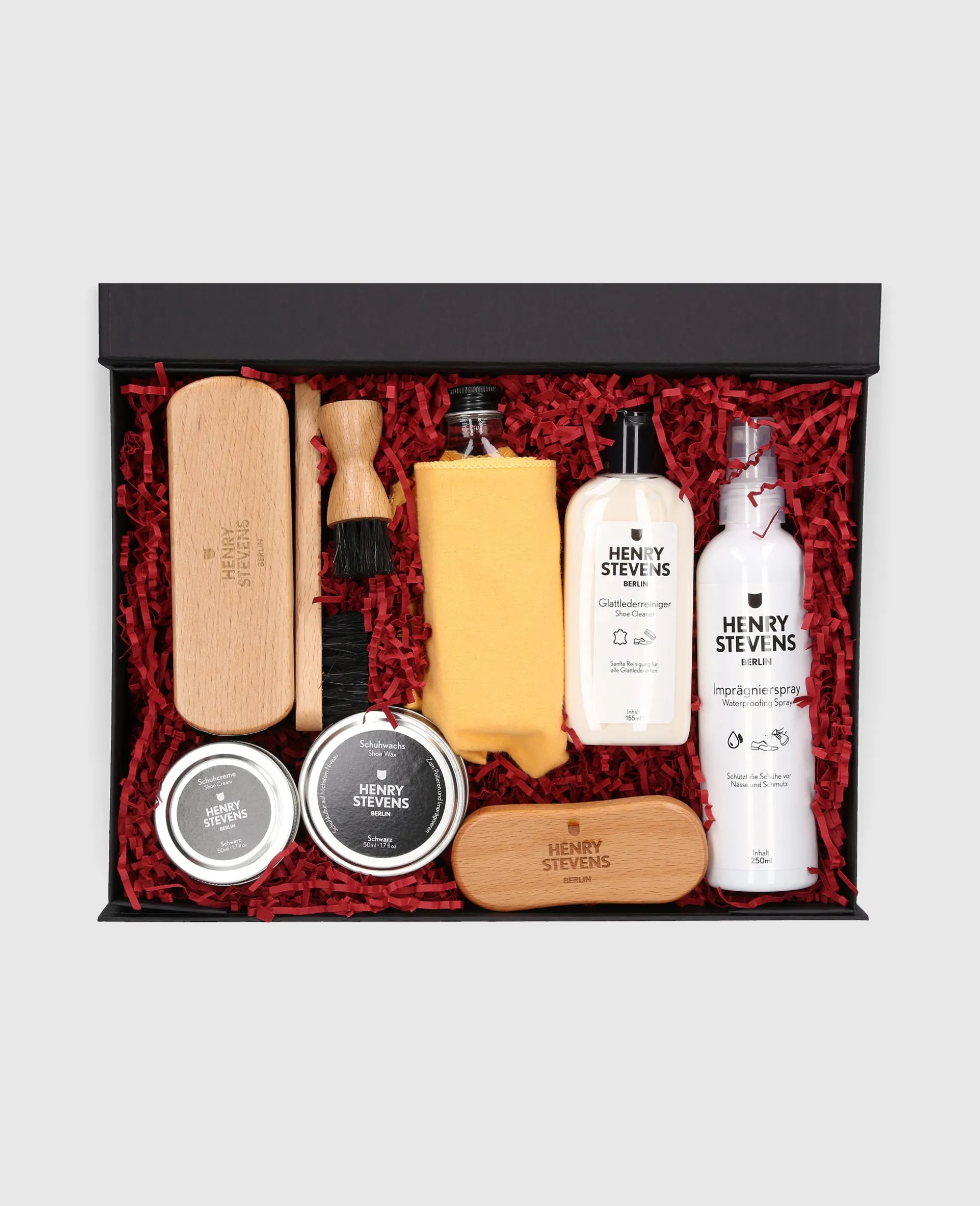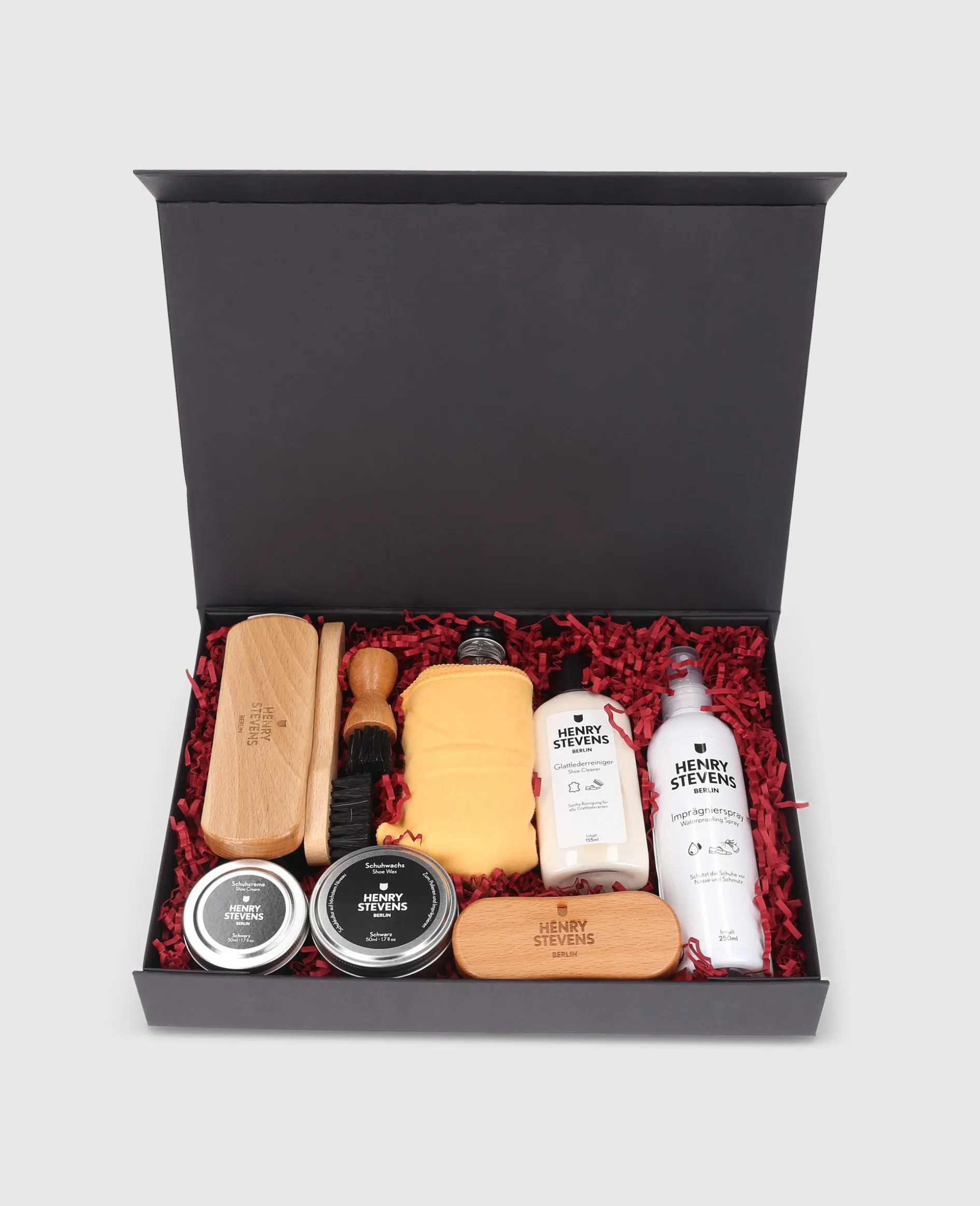 Verleihen Sie Ihren Schuhen Festtagsglanz mit dem exklusiven Schuhpflegeset von Henry Stevens. In klassischem Schwarz gehalten, vereint es Pflege der Spitzenqualität und stilvolle Eleganz – ein unverzichtbares Accessoire für anspruchsvolle Schuhliebhaber. Von hochwertigen Bürsten bis zu Creme und Wachs – ideal für makellos gepflegte Schuhe. Professionelle Pflege verpackt mit weihnachtlichem Charme sorgt für alle Ihre Ansprüche an die Schuhpflege.