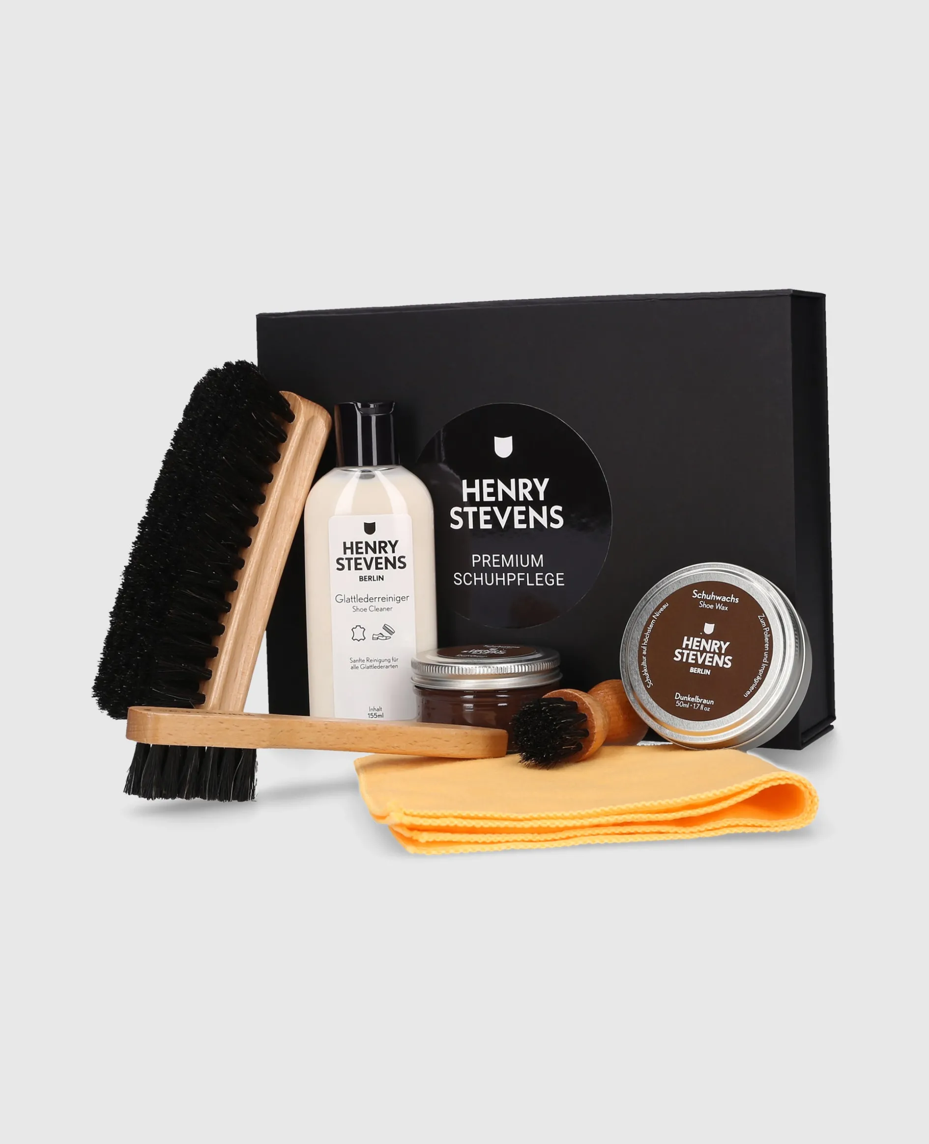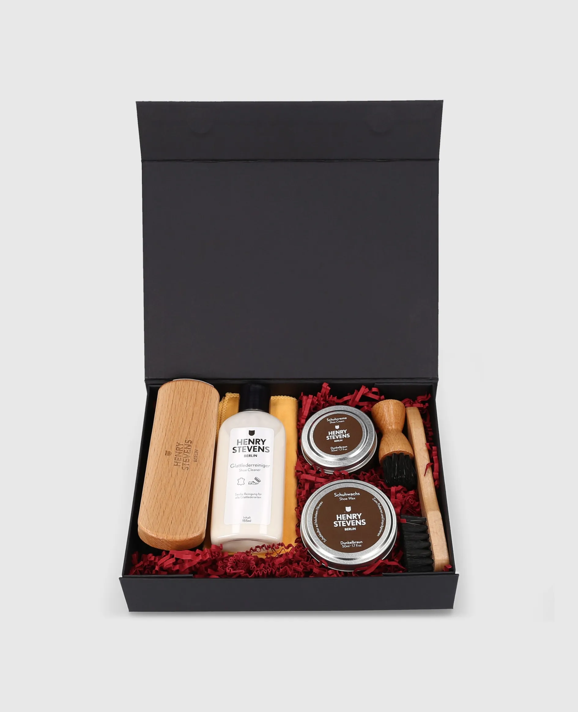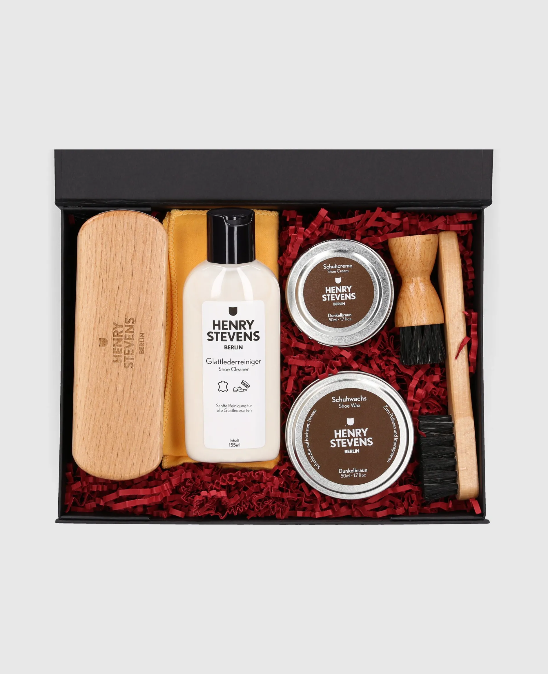 Verleihen Sie Ihren Schuhen Festtagsglanz mit dem exklusiven Schuhpflegeset von Henry Stevens. In edlem Dunkelbraun gehalten, vereint es Pflege der Spitzenqualität und stilvolle Eleganz – ein unverzichtbares Accessoire für anspruchsvolle Schuhliebhaber. Von hochwertigen Bürsten bis zu Creme und Wachs – ideal für makellos gepflegte Schuhe. Professionelle Pflege verpackt mit weihnachtlichem Charme sorgt für alle Ihre Ansprüche an die Schuhpflege.