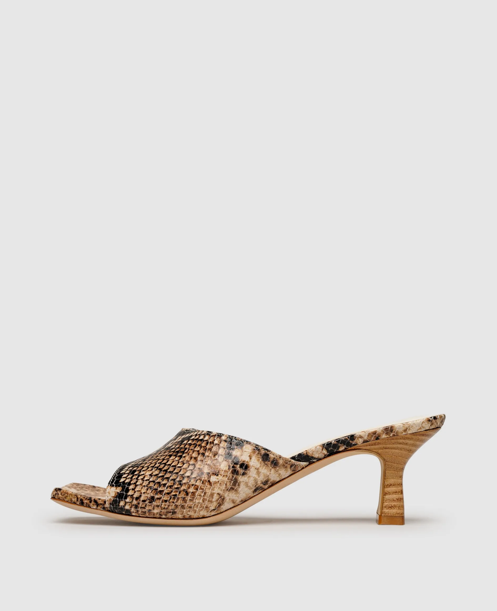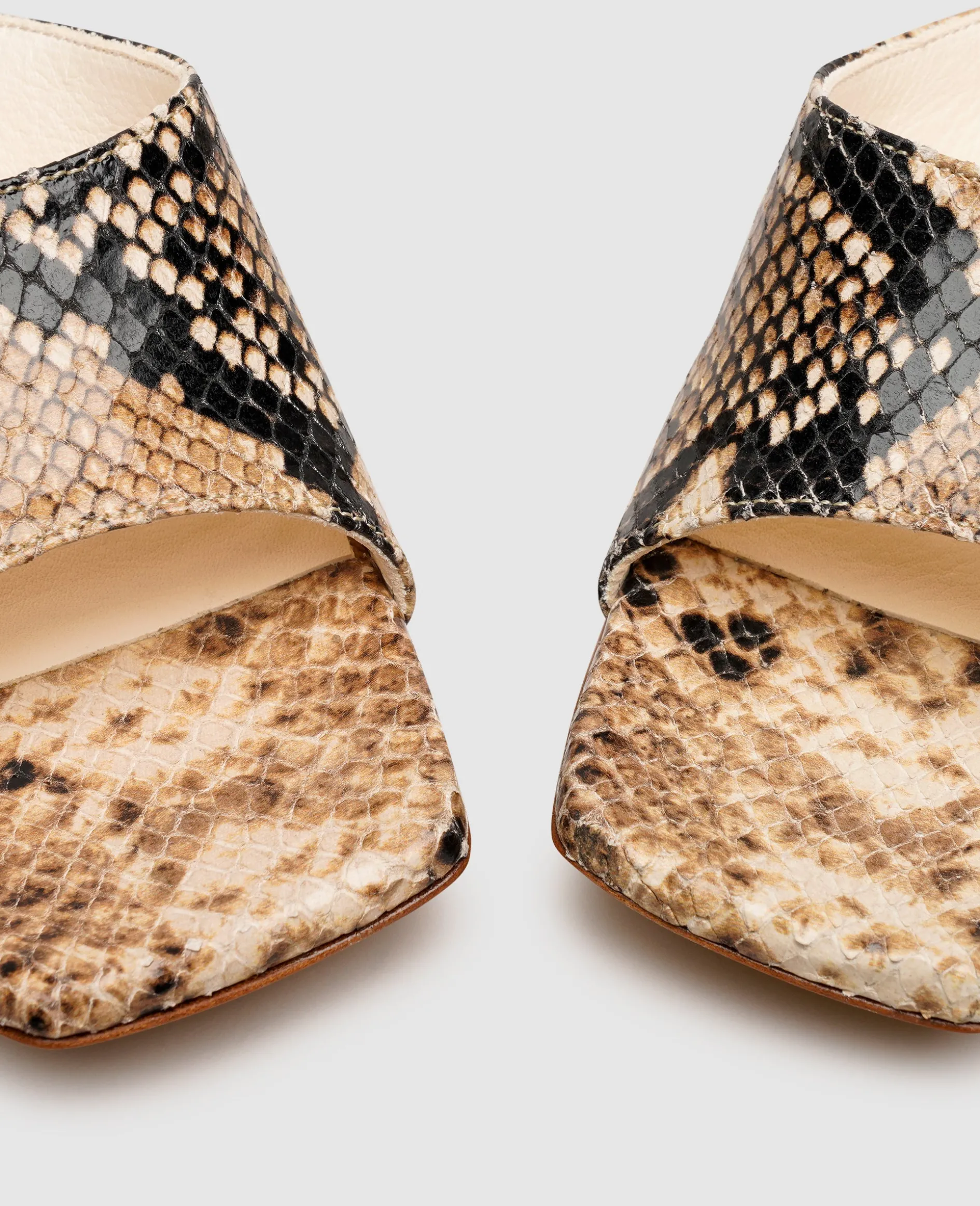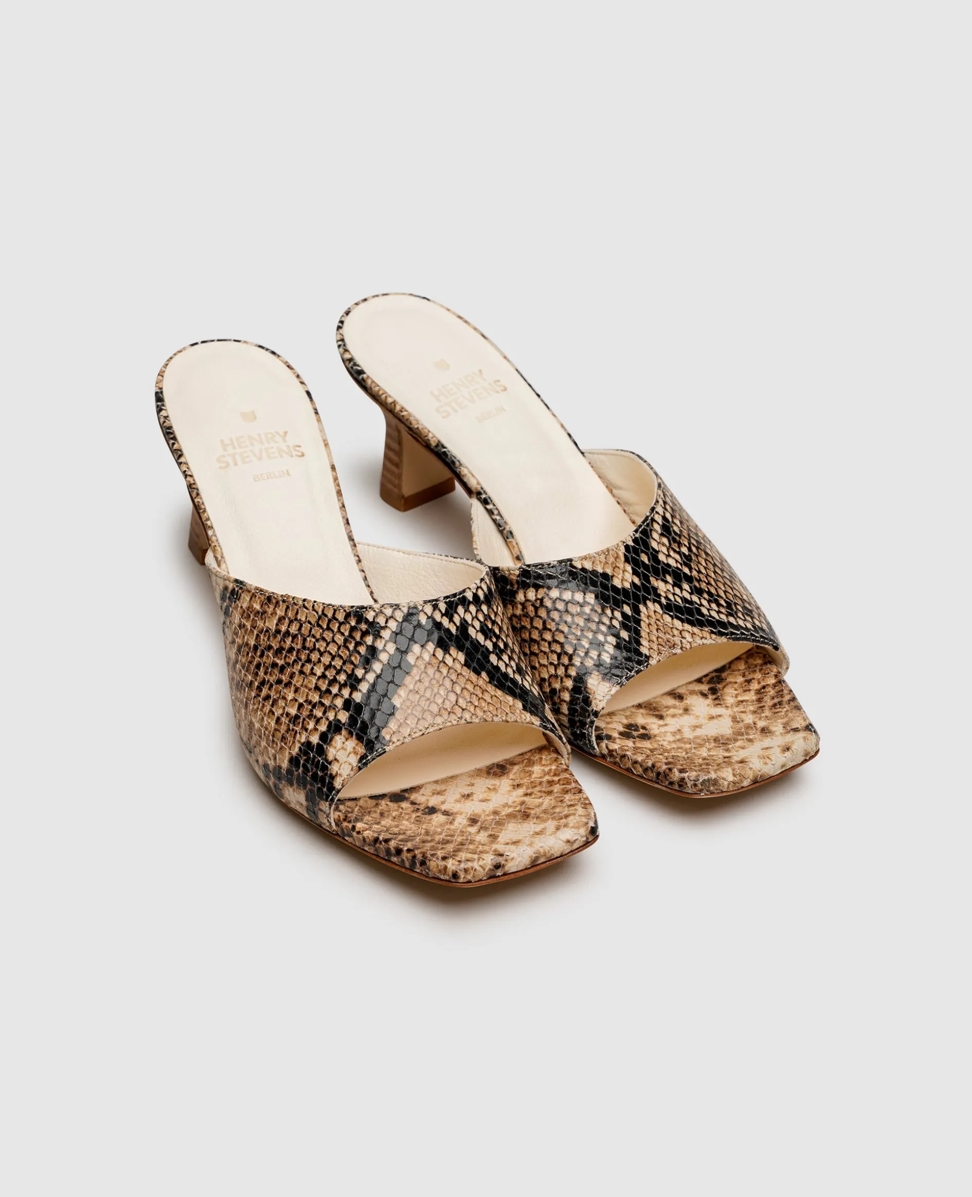 Die Trägerin dieser Mules kann sich anerkennender Blicke gewiss sein, denn sind es mehrere Details, die das Modell mit einem Hauch Extravaganz ausstatten. Das feine Kalbseder erscheint in angesagter Reptil-Optik und wird durch den Karree-Schnitt des Vorderfußbereichs akzentuiert. Dieses elegante und zeitgleich moderne Ensemble wird zudem durch den skulpturalen Absatz mit einer Höhe von 5 Zentimetern und eine klassische Ledersohle komplettiert.[cLineBreak]