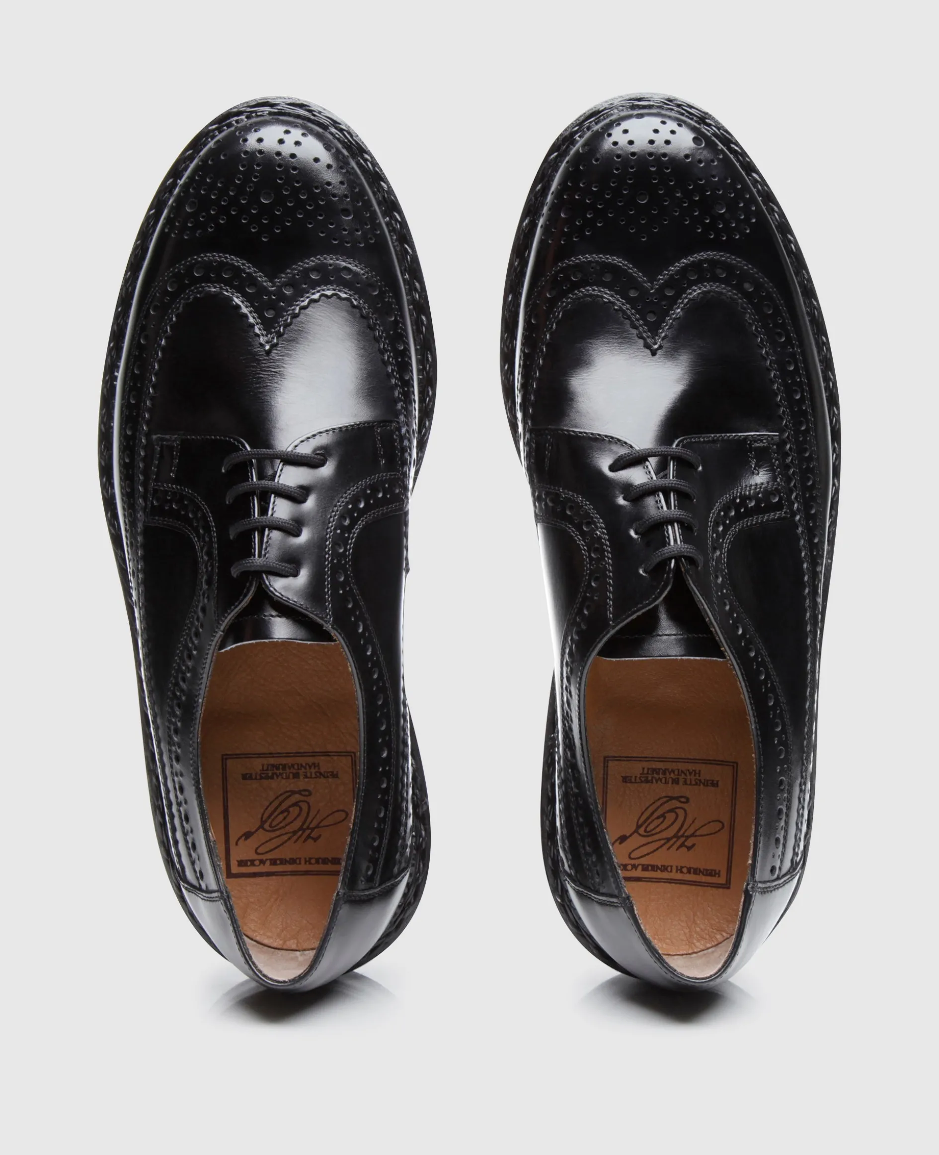 Der extraweite Janosh Full-Brogue BC ist die perfekte Kombination für den Herrn mit breitem Fuß. Die klassische Lyralochung gleicht dem amerikanischen Long-Wing, der bis zur Fersenkappe läuft. Die traditionelle Zopfnaht ziert und stärkt den Rahmen zugleich. Ausgestattet ist der Schuh mit einer doppelten Rendenbach-Sohle, die darüber hinaus von Messingnägeln geschützt wird.