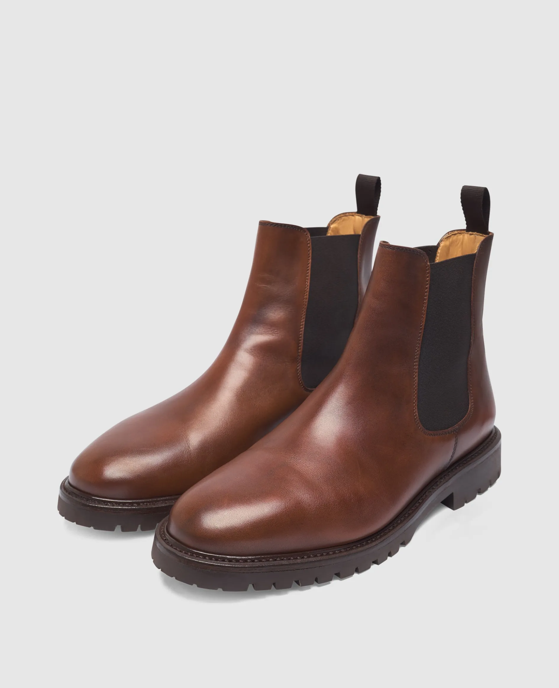 Der handgefertigte Jones Chelsea Boot in Mittelbraun ist aus geschmeidigem Boxcalf und einem Innenmaterial aus vegetabil gegerbtem Leder gefertigt. Durch die breite Leistenform sowie die rahmengenähte Machart bietet er hohen Komfort und ist aufgrund der robusten Gummisohle bequem und für die Herbstsaison geeignet. Hergestellt in Spanien.