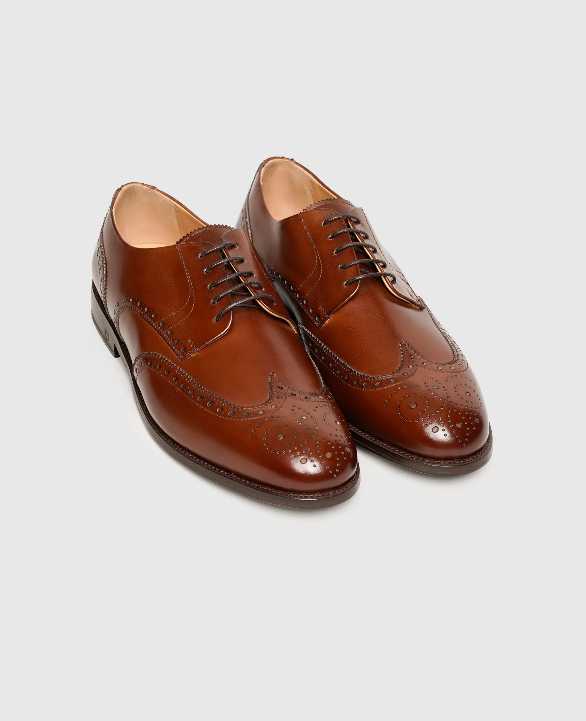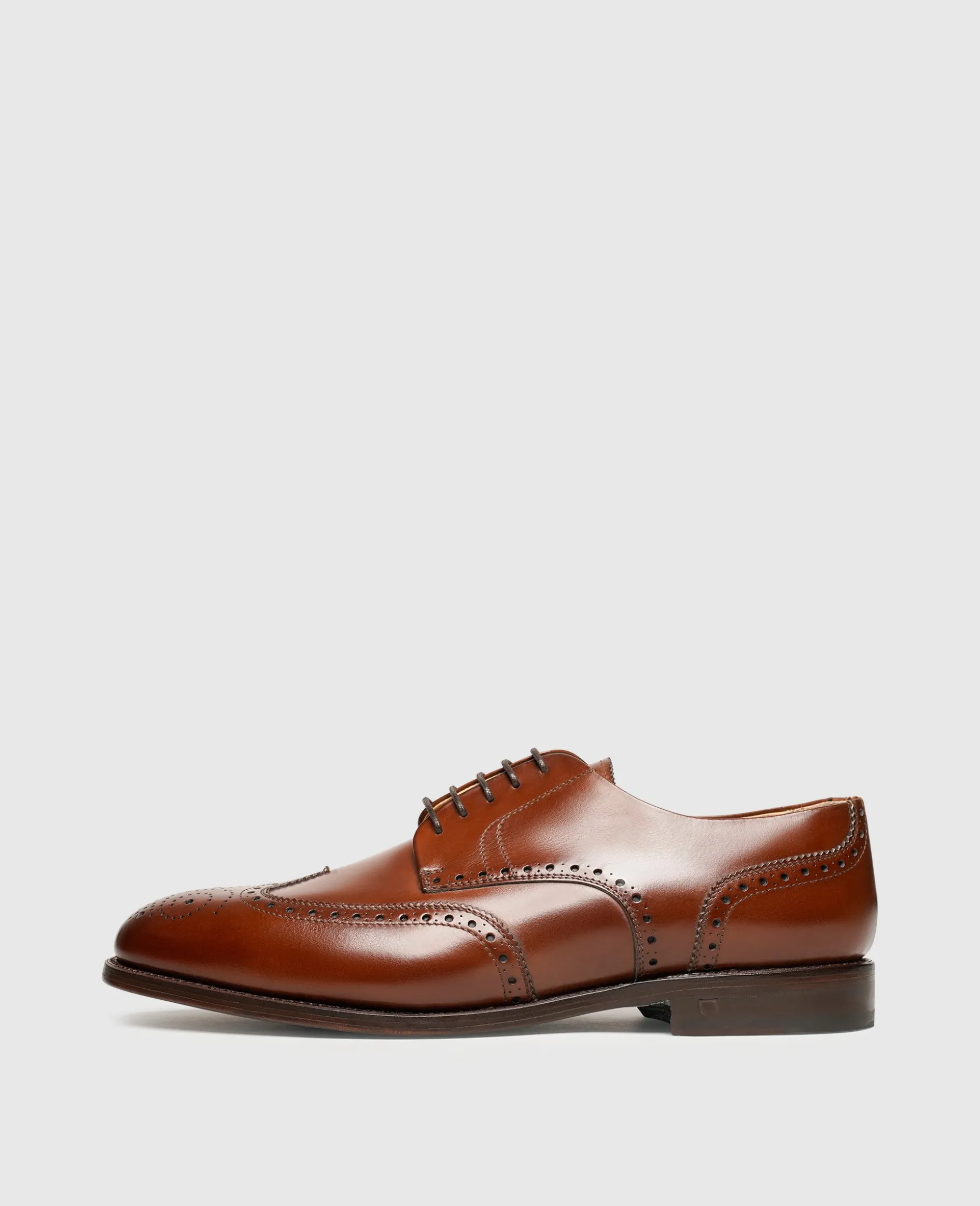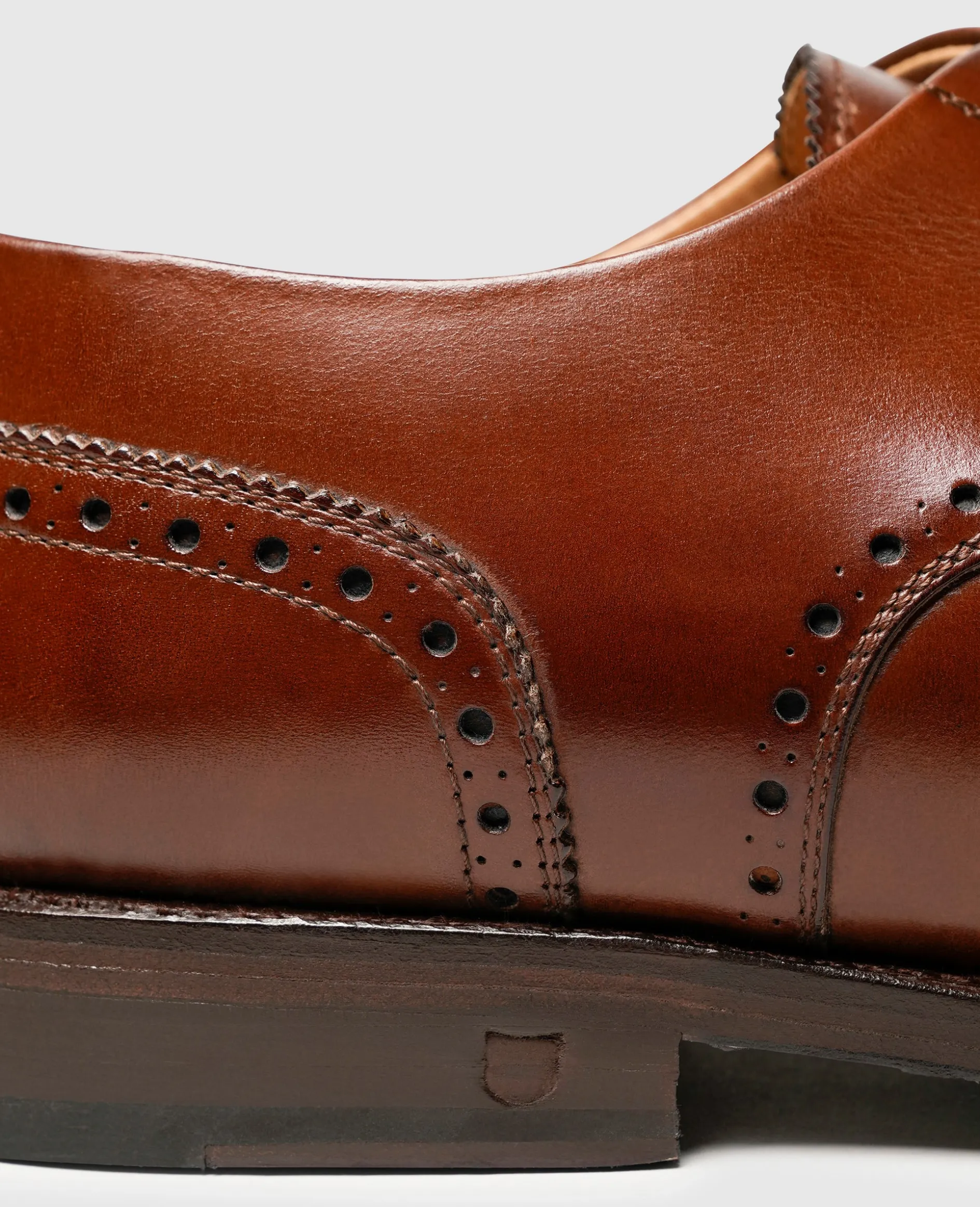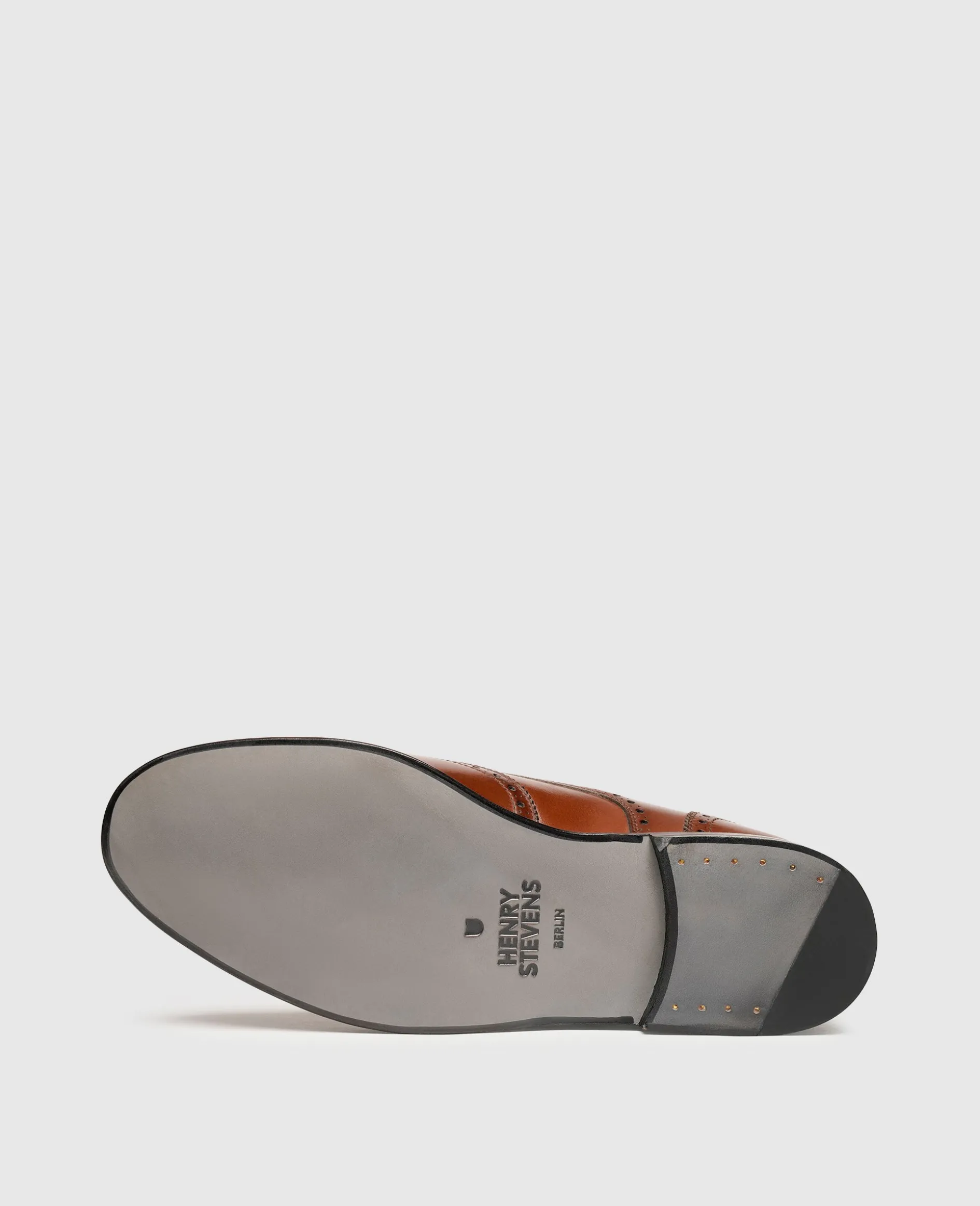 Mit dem Modell Jones präsentiert Henry Stevens einen klassisch rahmengenähten und handgefertigten Full-Brogue Derby für Herren mit einer angenehm breiten Grundform – die richtige Wahl für anspruchsvolle Business- und Freizeit-Looks. Das Mehr an Geräumigkeit wird von einem zeitlosen Design begleitet, dessen opulente Perforation dynamische Eleganz verströmt. Der Schaft begeistert mit pflanzlich gegerbtem Kalbsleder aus Frankreich, ergänzt von einem ebenso vegetabil gegerbtem Innenfutter und einer strapazierfähigen Lederlaufsohle.