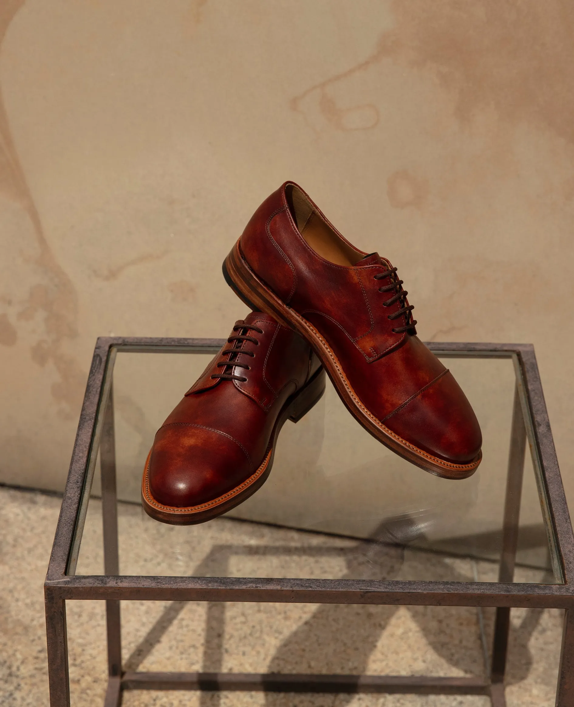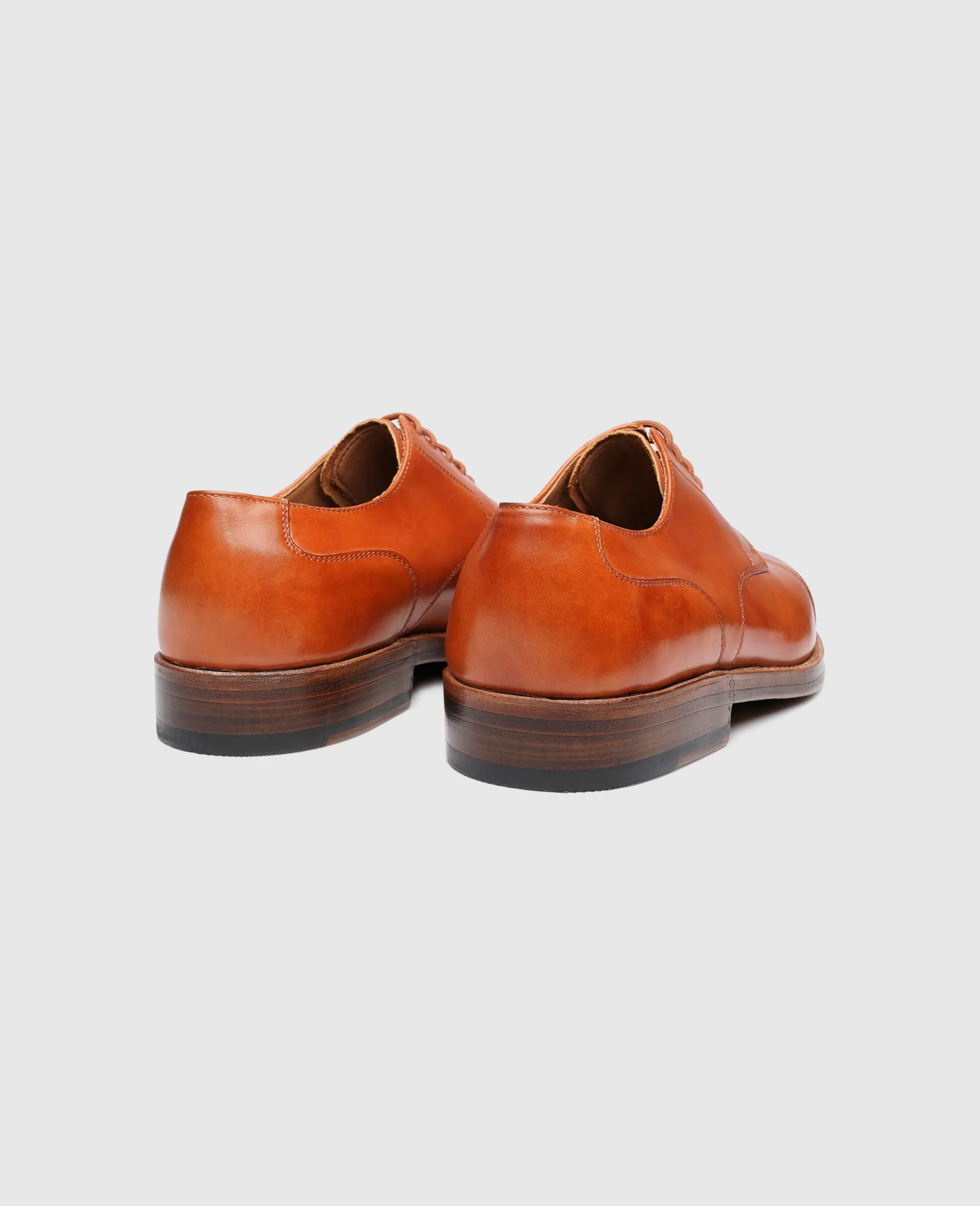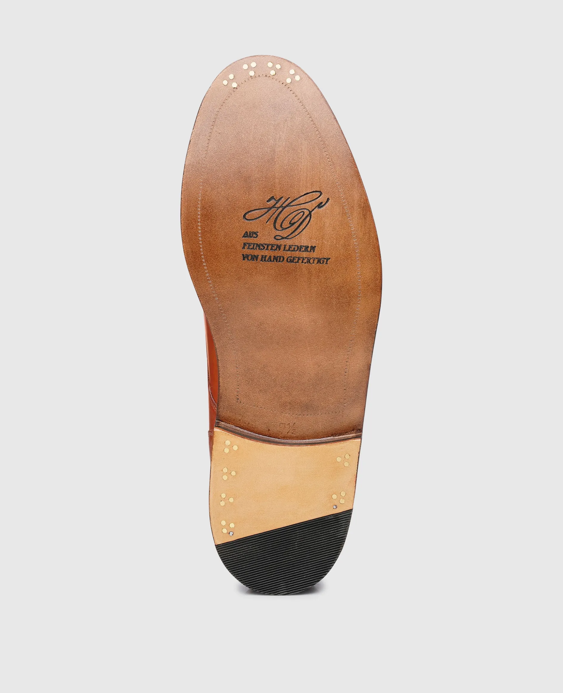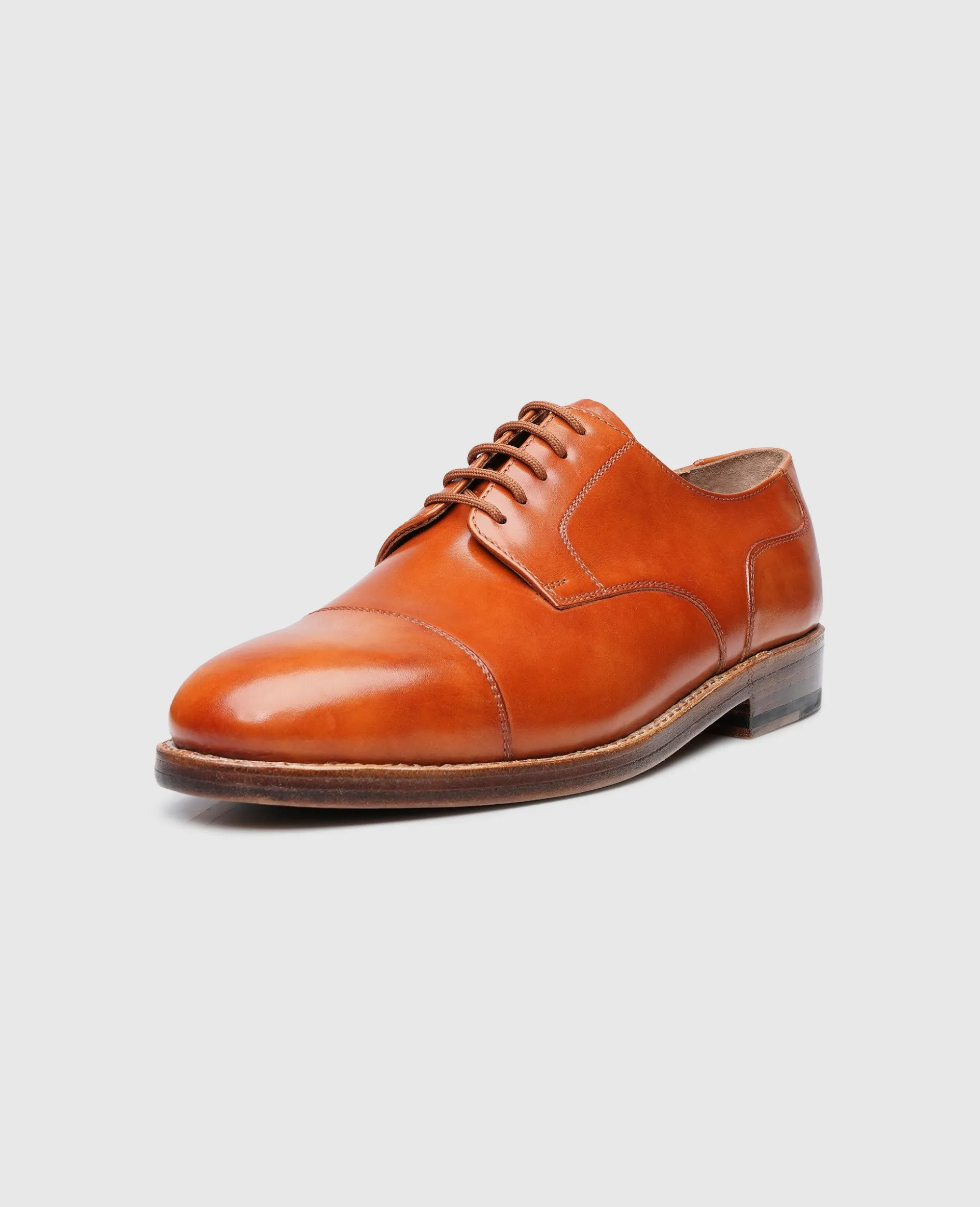Handgefertigt auf dem komfortablen London Leisten präsentiert sich ein zeitloser Klassiker in einzigartigem Gewand. Der rahmengenähte Captoe Derby für Herren besticht vor allem durch das an eine Patina erinnernde Farbspiel des Toscana Calf Leders, aus welchem der Schaft kreiert wurde. Die namensgebende Ziernaht auf der Schuhspitze sowie eine dezente Naht entlang der Fersenpartie sind darüber hinaus der einzige Schmuck des ansonsten schlicht gehaltenen Schnürschuhs.Die rahmengenähte Machart, welche als Königsdisziplin der Schuhmacherkunst gilt, garantiert in Kombination mit der langlebigen doppelten Ledersohle aus dem Hause Rendenbach ein langes Schuhleben. Beide Eigenschaften machen das Modell ausgesprochen reparaturfreundlich. Zu Dreierpaaren angeordnete Messingstifte, welche von Hand in die Sohle eingeschlagen wurden, sorgen zusätzlich für Beständigkeit.