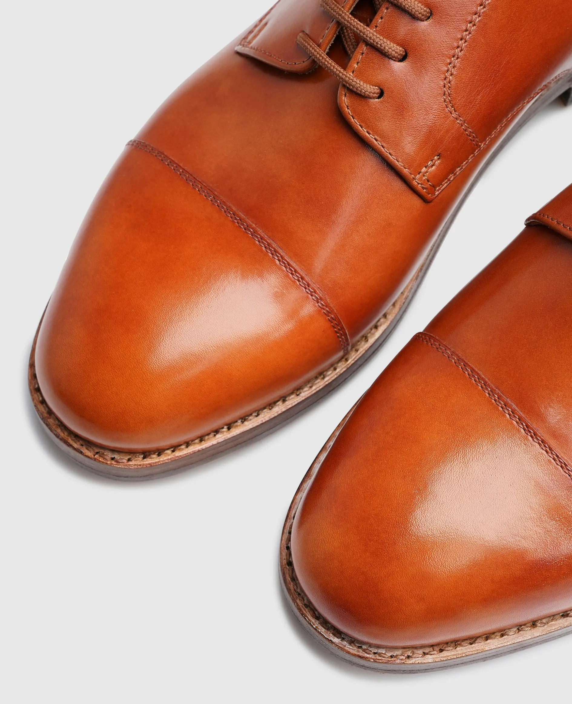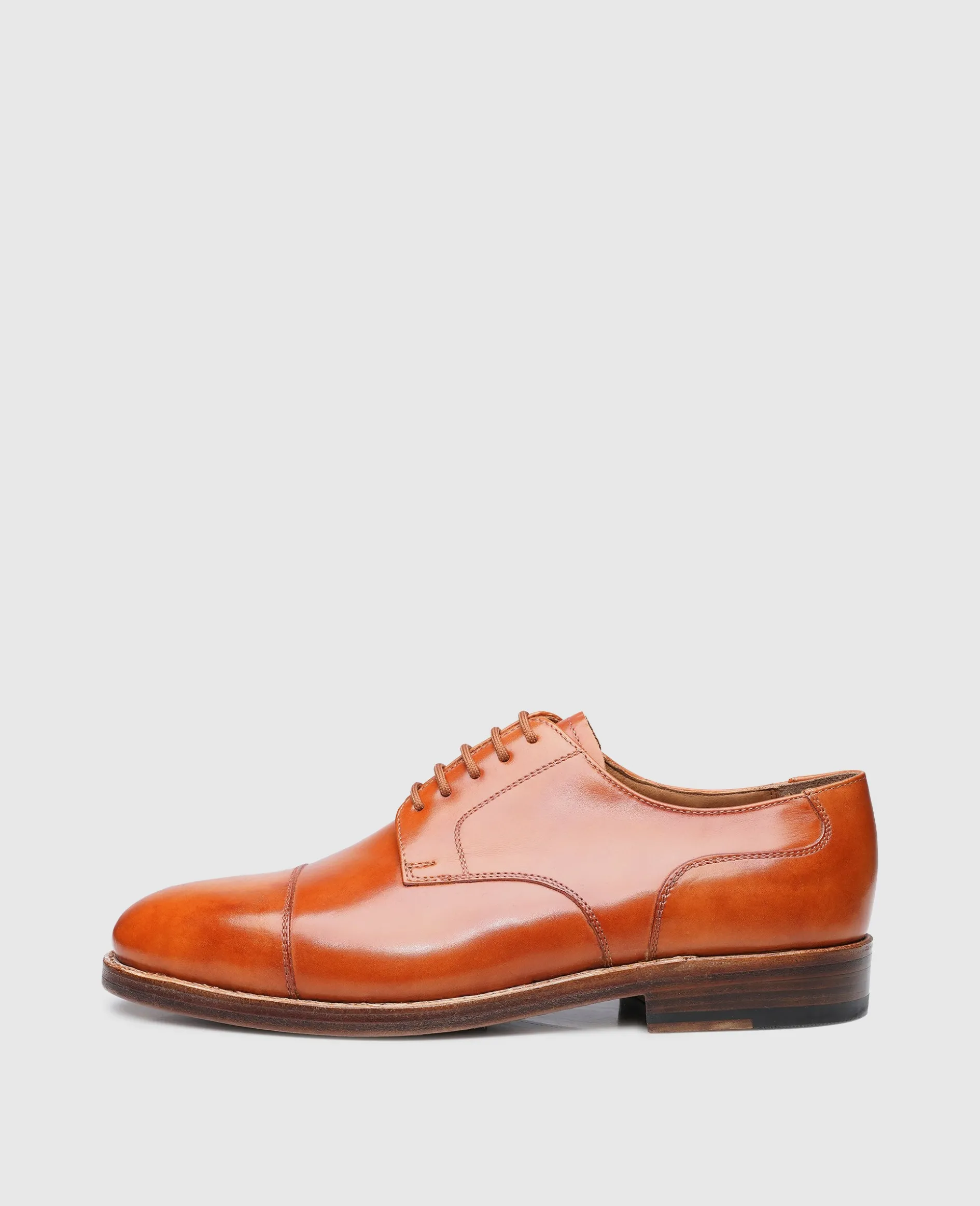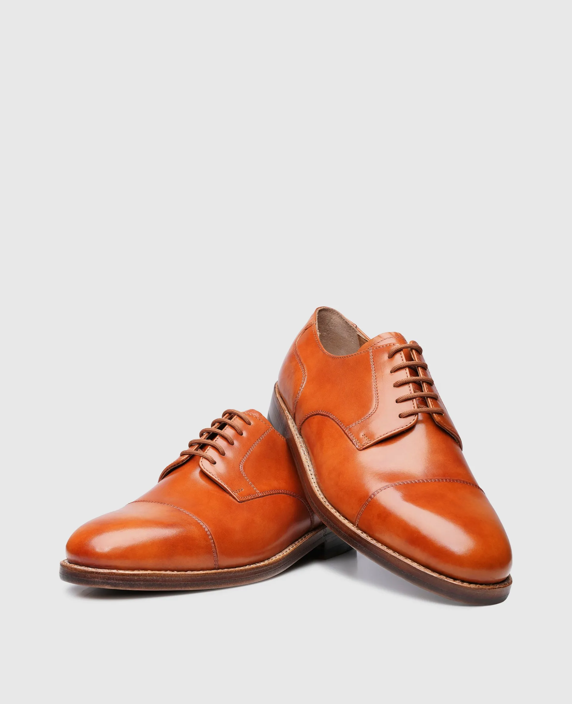 Handgefertigt auf dem komfortablen London Leisten präsentiert sich ein zeitloser Klassiker in einzigartigem Gewand. Der rahmengenähte Captoe Derby für Herren besticht vor allem durch das an eine Patina erinnernde Farbspiel des Toscana Calf Leders, aus welchem der Schaft kreiert wurde. Die namensgebende Ziernaht auf der Schuhspitze sowie eine dezente Naht entlang der Fersenpartie sind darüber hinaus der einzige Schmuck des ansonsten schlicht gehaltenen Schnürschuhs.Die rahmengenähte Machart, welche als Königsdisziplin der Schuhmacherkunst gilt, garantiert in Kombination mit der langlebigen doppelten Ledersohle aus dem Hause Rendenbach ein langes Schuhleben. Beide Eigenschaften machen das Modell ausgesprochen reparaturfreundlich. Zu Dreierpaaren angeordnete Messingstifte, welche von Hand in die Sohle eingeschlagen wurden, sorgen zusätzlich für Beständigkeit.