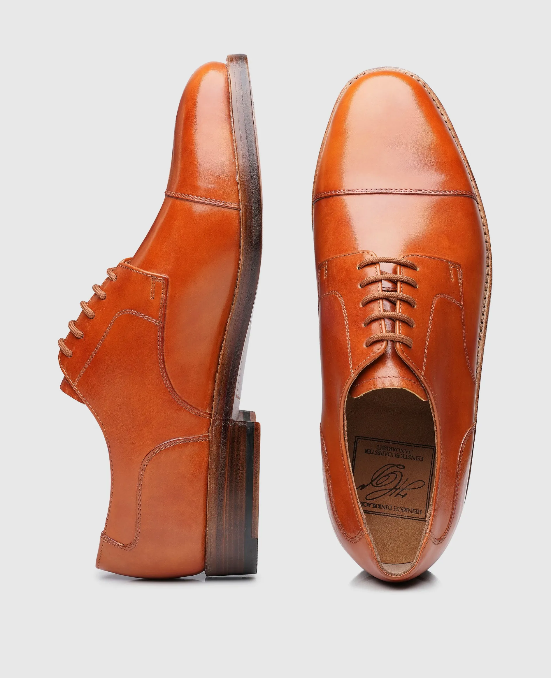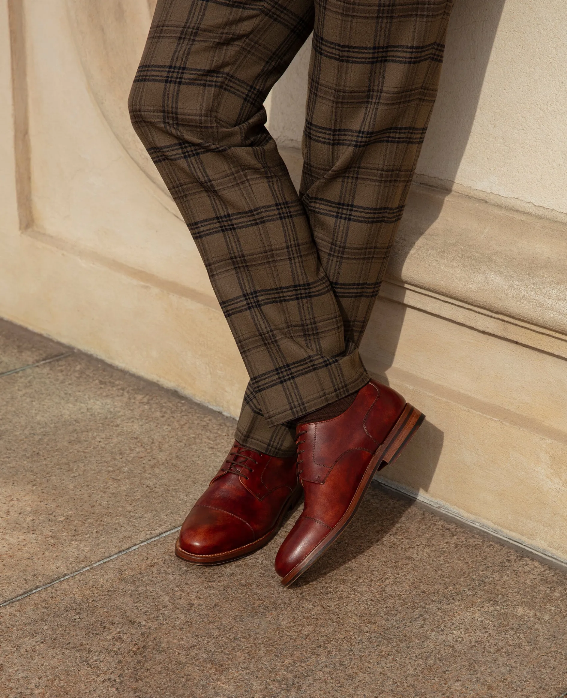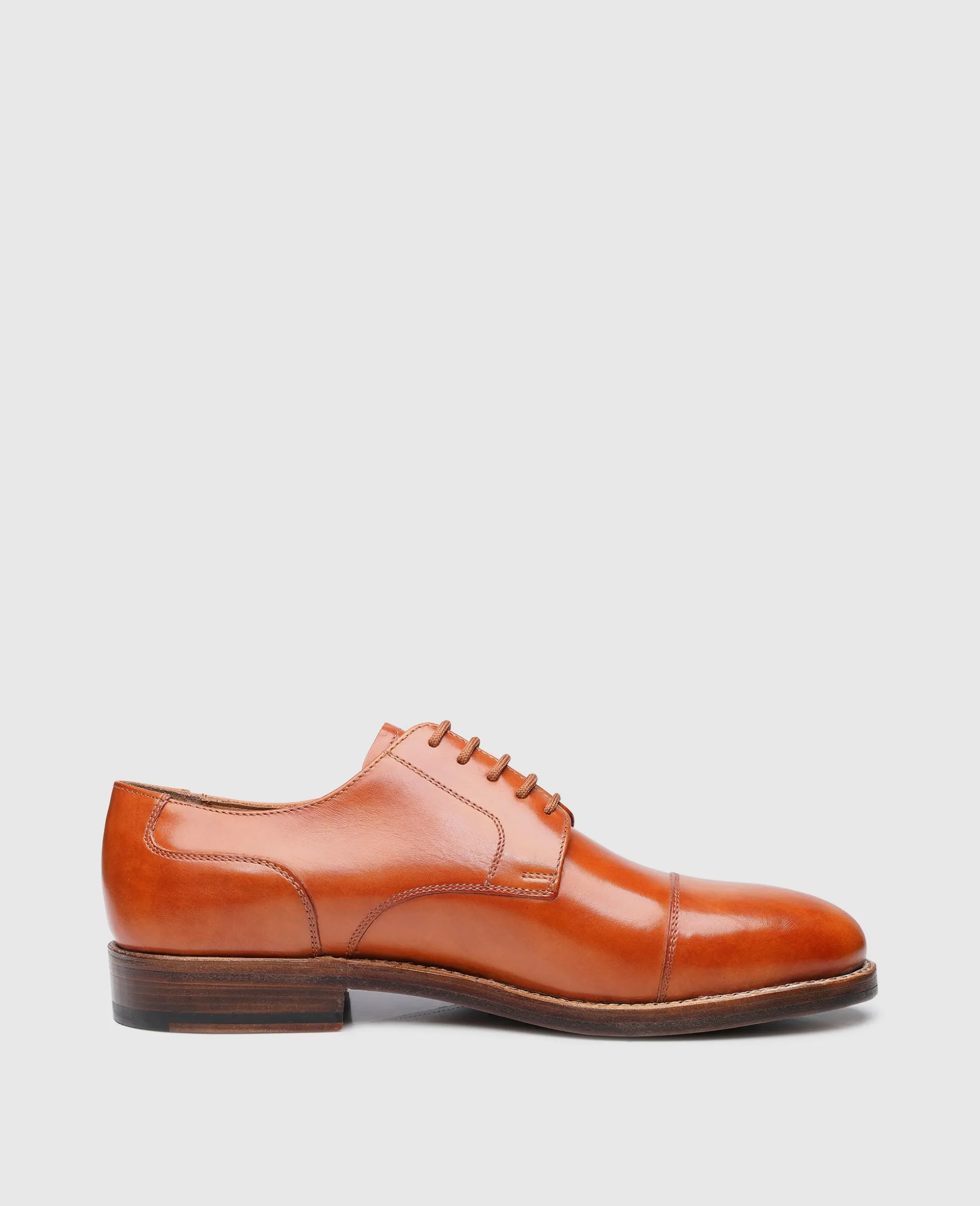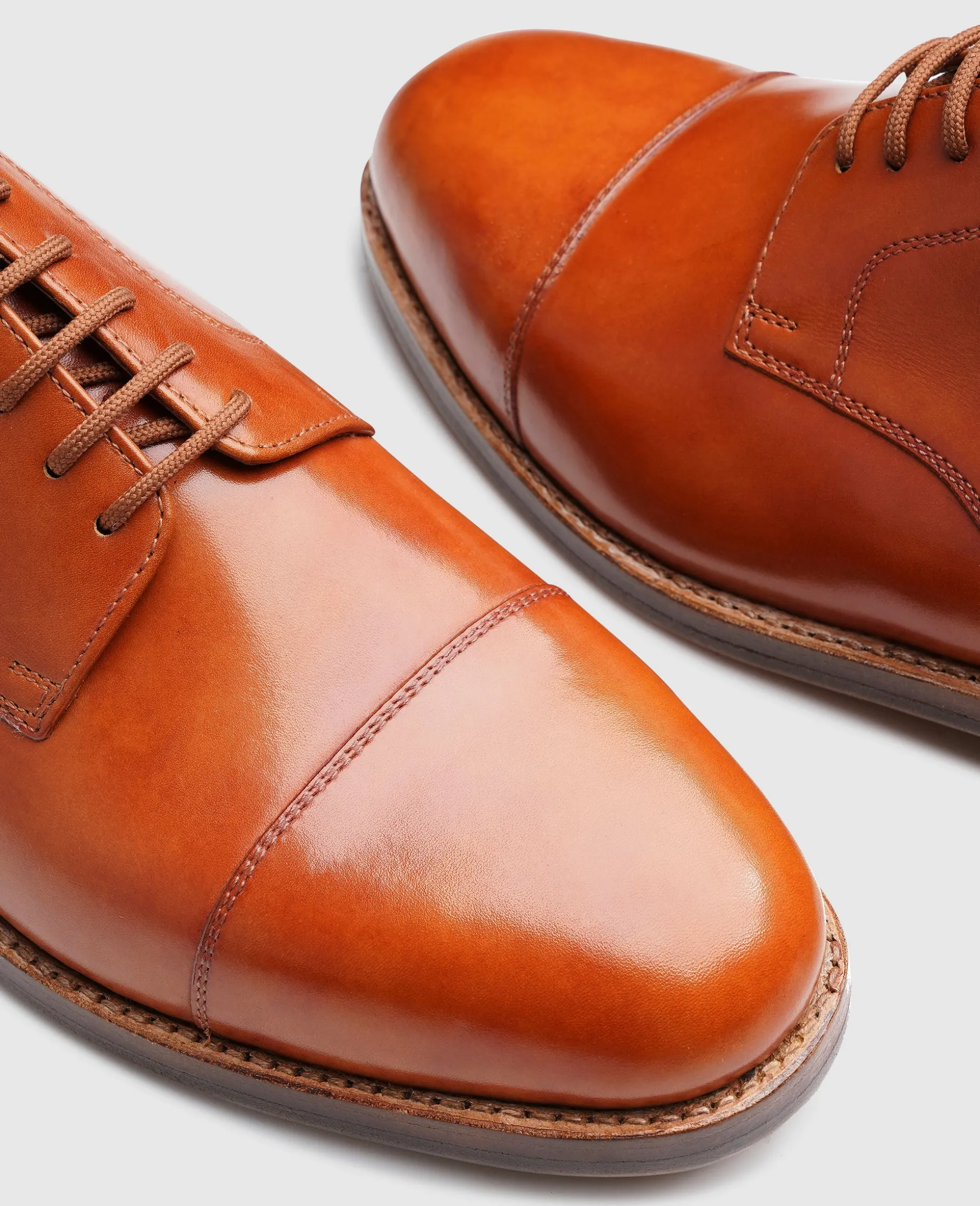 Handgefertigt auf dem komfortablen London Leisten präsentiert sich ein zeitloser Klassiker in einzigartigem Gewand. Der rahmengenähte Captoe Derby für Herren besticht vor allem durch das an eine Patina erinnernde Farbspiel des Toscana Calf Leders, aus welchem der Schaft kreiert wurde. Die namensgebende Ziernaht auf der Schuhspitze sowie eine dezente Naht entlang der Fersenpartie sind darüber hinaus der einzige Schmuck des ansonsten schlicht gehaltenen Schnürschuhs.Die rahmengenähte Machart, welche als Königsdisziplin der Schuhmacherkunst gilt, garantiert in Kombination mit der langlebigen doppelten Ledersohle aus dem Hause Rendenbach ein langes Schuhleben. Beide Eigenschaften machen das Modell ausgesprochen reparaturfreundlich. Zu Dreierpaaren angeordnete Messingstifte, welche von Hand in die Sohle eingeschlagen wurden, sorgen zusätzlich für Beständigkeit.