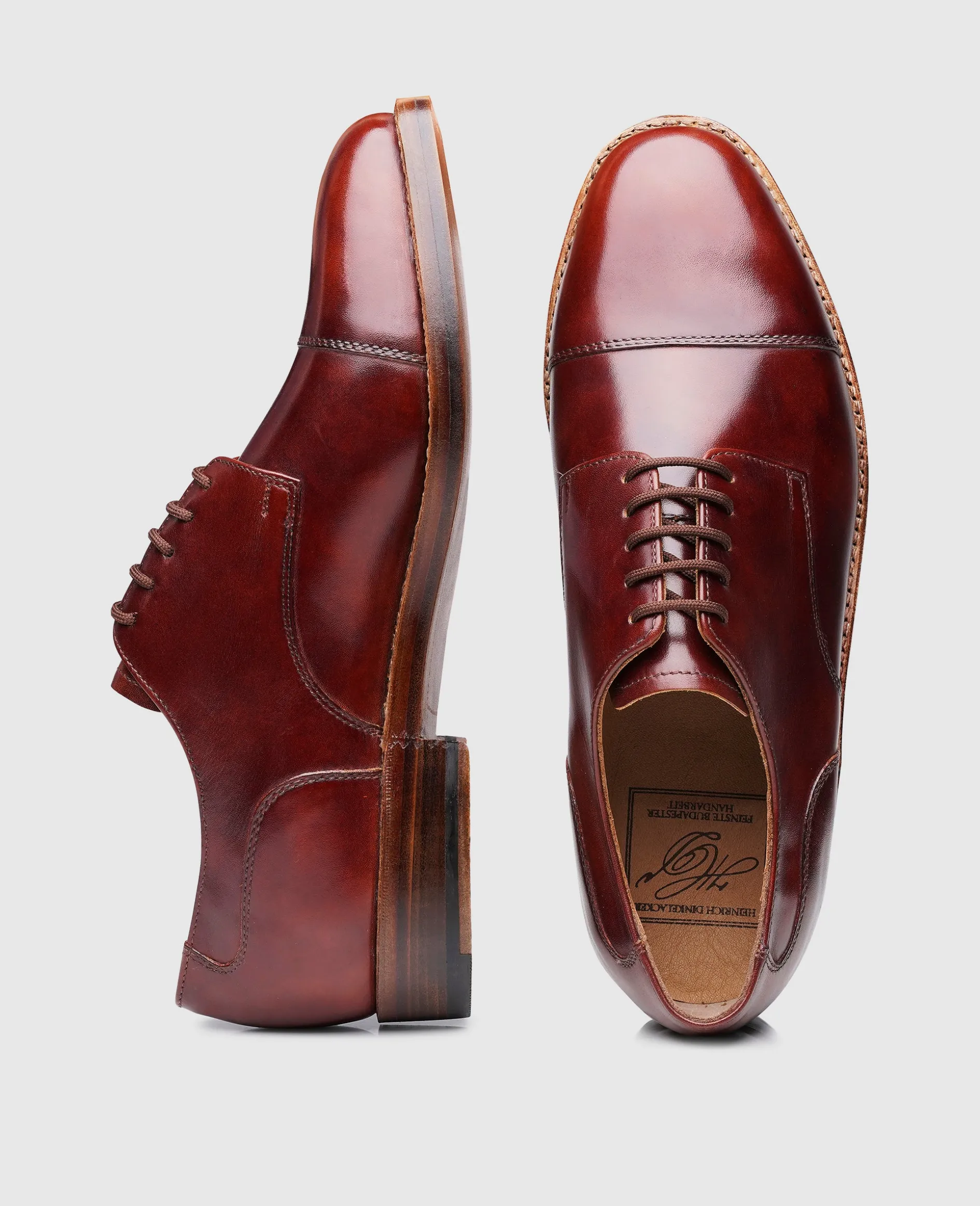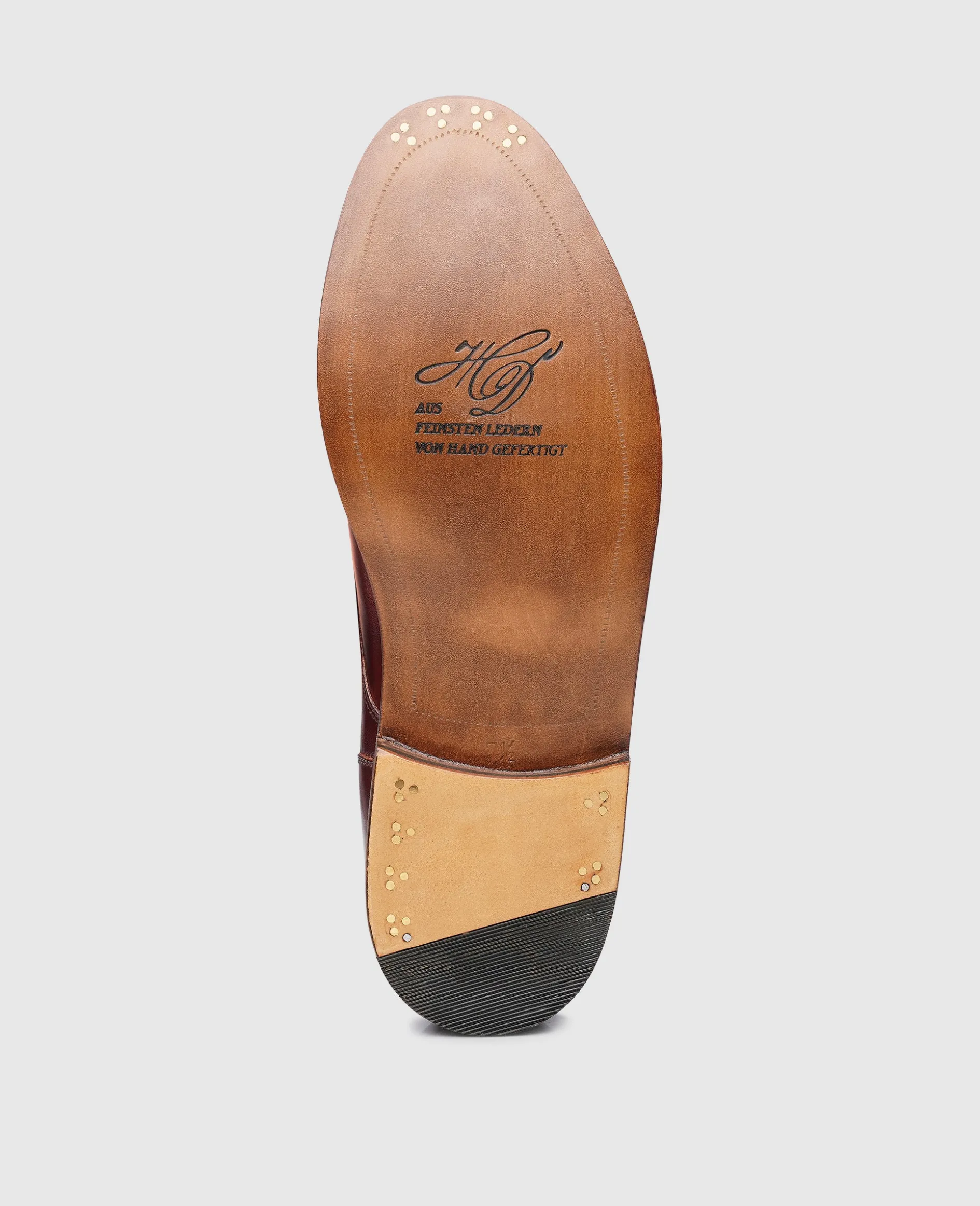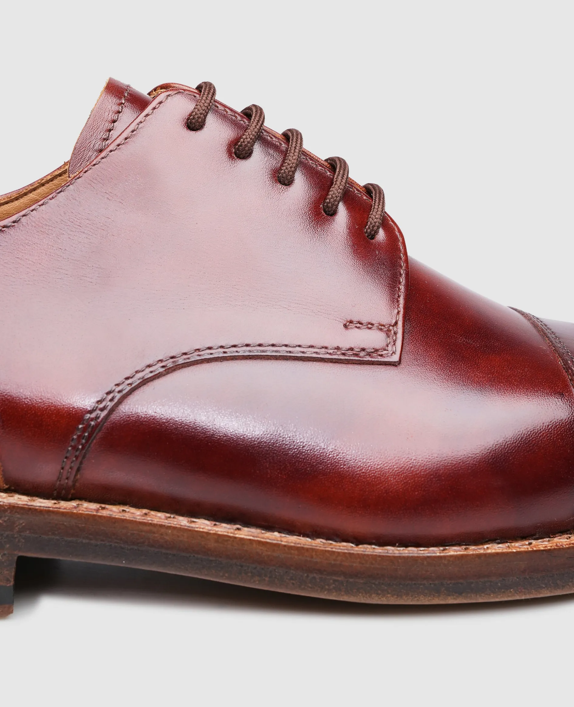 Handgefertigt auf dem komfortablen London Leisten präsentiert sich ein zeitloser Klassiker in einzigartigem Gewand. Der rahmengenähte Captoe Derby für Herren besticht vor allem durch das an eine Patina erinnernde Farbspiel des Toscana Calf Leders, aus welchem der Schaft kreiert wurde. Die namensgebende Ziernaht auf der Schuhspitze sowie eine dezente Naht entlang der Fersenpartie sind darüber hinaus der einzige Schmuck des ansonsten schlicht gehaltenen Schnürschuhs.Die rahmengenähte Machart, welche als Königsdisziplin der Schuhmacherkunst gilt, garantiert in Kombination mit der langlebigen doppelten Ledersohle aus dem Hause Rendenbach ein langes Schuhleben. Beide Eigenschaften machen das Modell ausgesprochen reparaturfreundlich. Zu Dreierpaaren angeordnete Messingstifte, welche von Hand in die Sohle eingeschlagen wurden, sorgen zusätzlich für Beständigkeit.