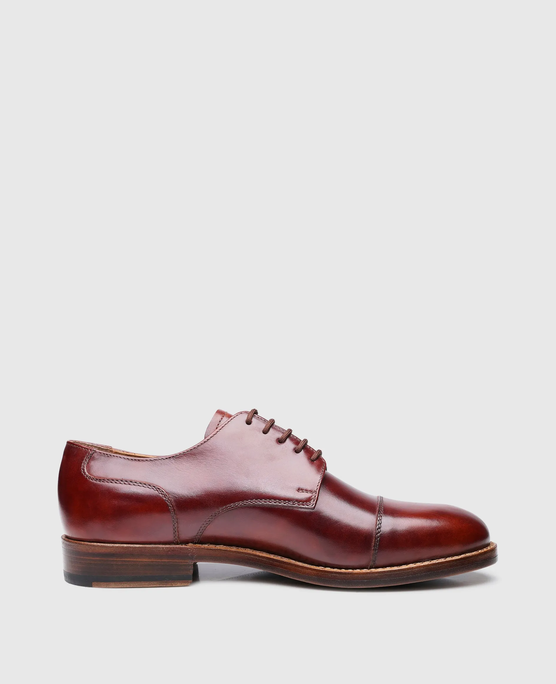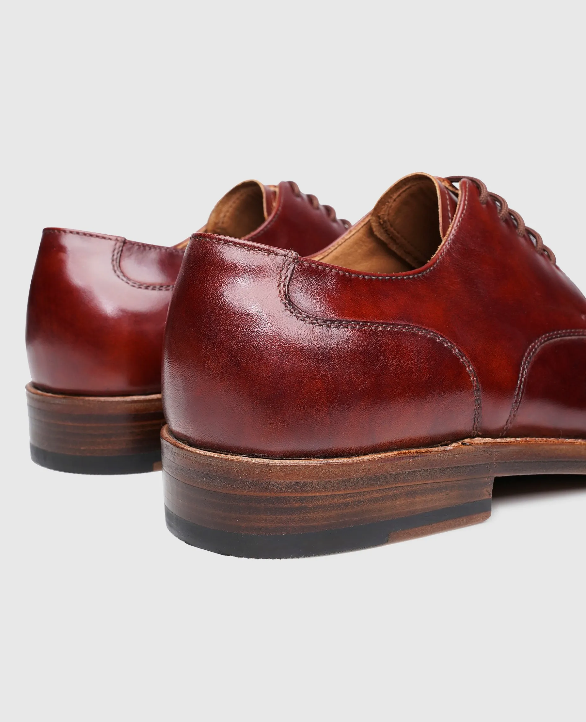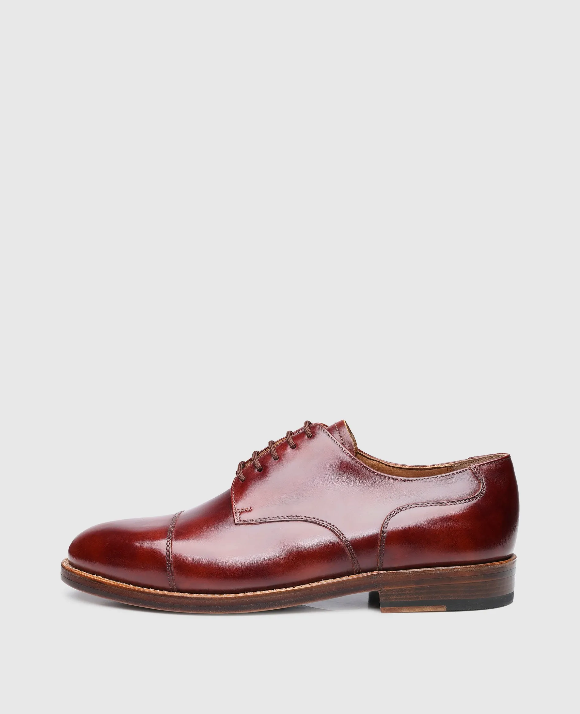 Handgefertigt auf dem komfortablen London Leisten präsentiert sich ein zeitloser Klassiker in einzigartigem Gewand. Der rahmengenähte Captoe Derby für Herren besticht vor allem durch das an eine Patina erinnernde Farbspiel des Toscana Calf Leders, aus welchem der Schaft kreiert wurde. Die namensgebende Ziernaht auf der Schuhspitze sowie eine dezente Naht entlang der Fersenpartie sind darüber hinaus der einzige Schmuck des ansonsten schlicht gehaltenen Schnürschuhs.Die rahmengenähte Machart, welche als Königsdisziplin der Schuhmacherkunst gilt, garantiert in Kombination mit der langlebigen doppelten Ledersohle aus dem Hause Rendenbach ein langes Schuhleben. Beide Eigenschaften machen das Modell ausgesprochen reparaturfreundlich. Zu Dreierpaaren angeordnete Messingstifte, welche von Hand in die Sohle eingeschlagen wurden, sorgen zusätzlich für Beständigkeit.
