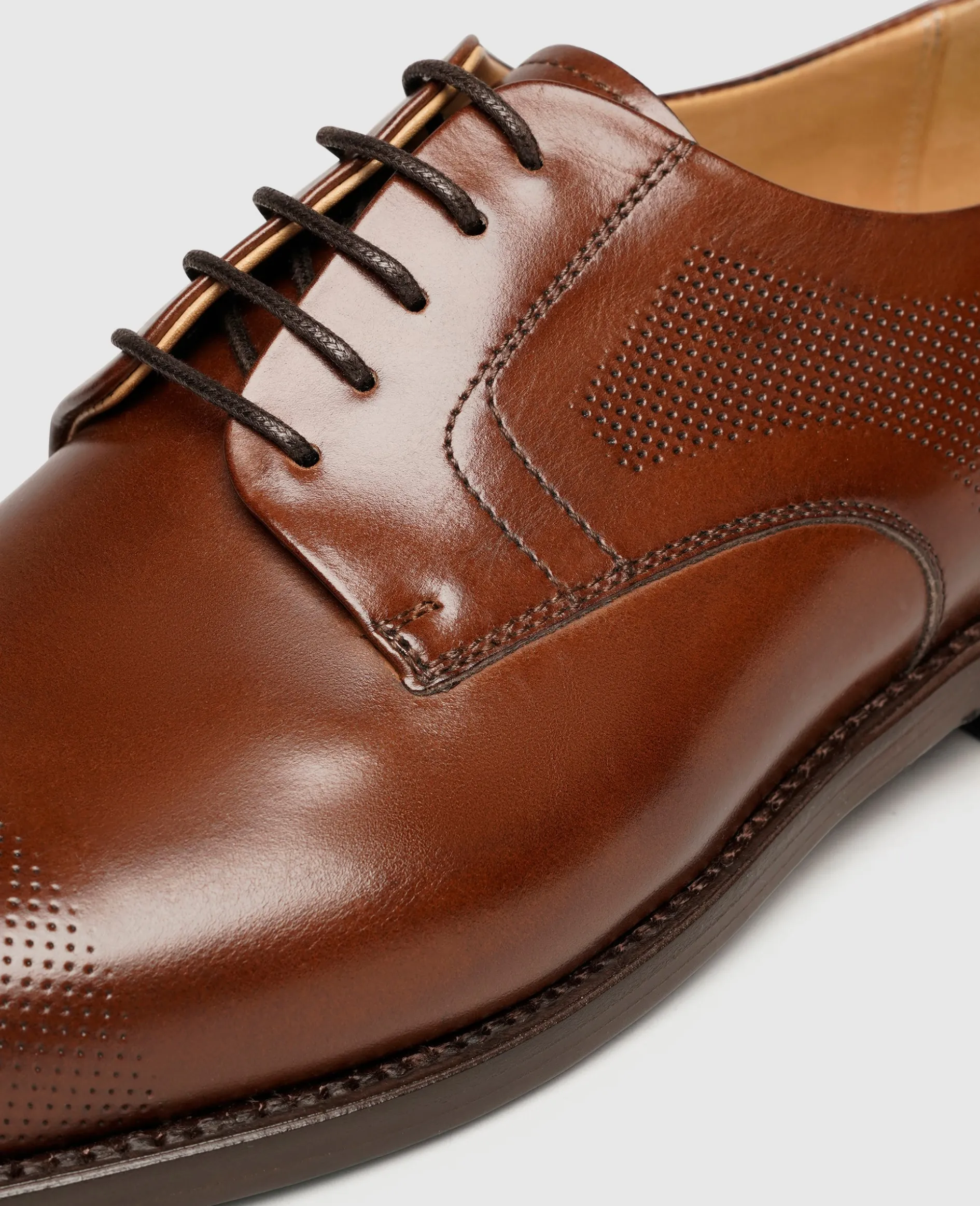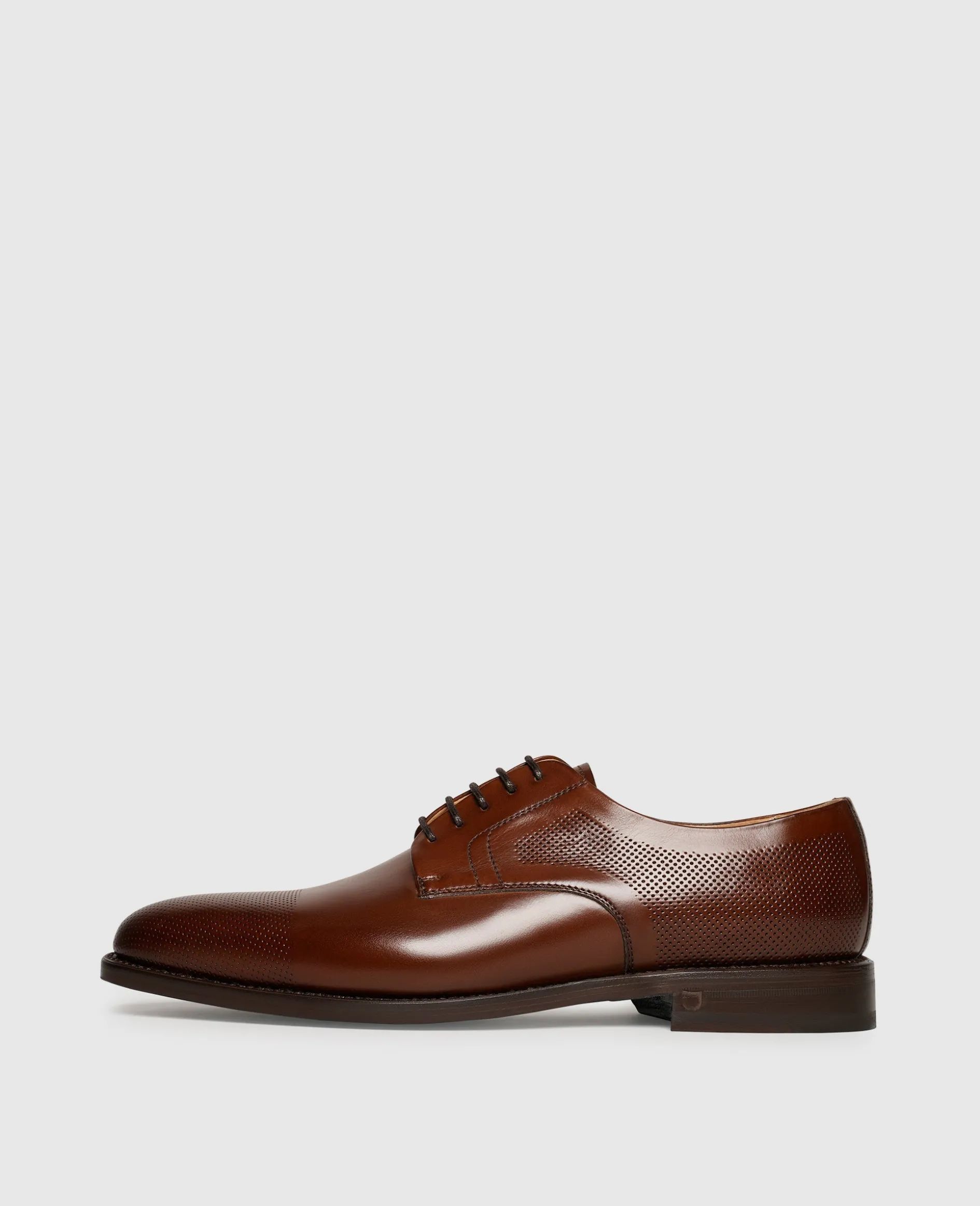 Flexible Dynamik und klassische Anmut vereinen sich in diesem rahmengenähten Captoe Derby von Henry Stevens. Dieses mittelbraune Schuhmodell für Herren überzeugt durch seine Schnürung sowie das glatte und strapazierfähige Newcastle-Leder. Im Schuhinneren sorgt ein pflanzlich gegerbtes Innenfutter aus Leder für puren Wohlfühl-Komfort. Besonderen Halt gibt Ihnen das komfortable Fußbett aus Leder, welches durch eine natürliche Lederlaufsohle Vollendung findet. Wenn Sie auf der Suche nach einem optischen Highlight sind, ist dieses in Spanien handgefertigte Modell mit seinen dekorativen Micro-Perforationen das Richtige für Sie. Seine dynamische Anmut verwandelt den beliebten Schnürer in einen vielseitig einsetzbaren Begleiter für souveräne Business-Looks und die gehobene Freizeitgarderobe.