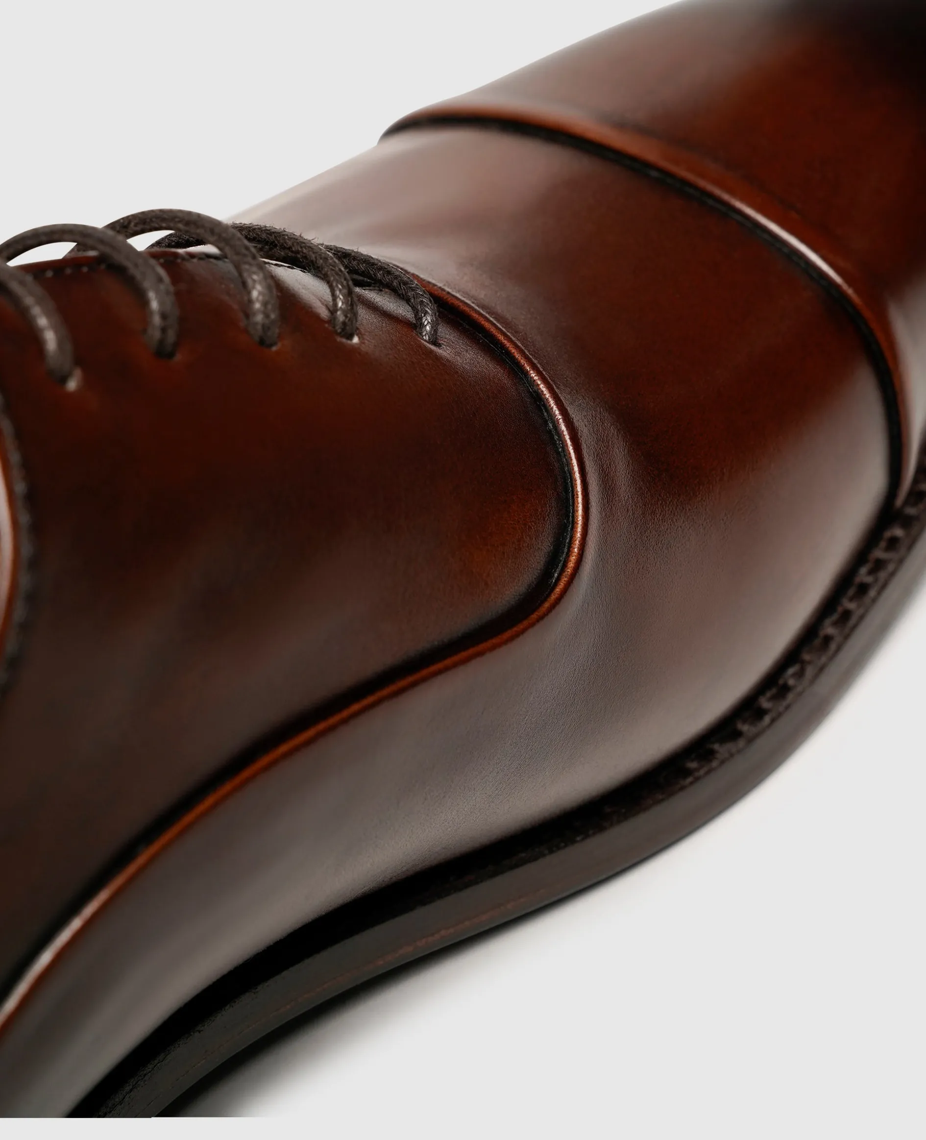 Ein aufwendiges Handfinish verleiht diesem eleganten Captoe Oxford Herrenschuh von Henry Stevens eine außergewöhnliche Anmut. Die faszinierenden Hell-Dunkel-Schattierungen auf dem erlesenen Glattleder sorgen für eine sanfte Dynamik. Kreiert in der Königsdisziplin der Schuhfertigung, garantiert der rahmengenähte Schuhklassiker höchsten Tragekomfort ab dem ersten Schritt. Letzterer wird von einem atmungsaktiven Innenfutter aus vegetabil gegerbtem Leder unterstützt sowie einer langlebigen Lederlaufsohle.