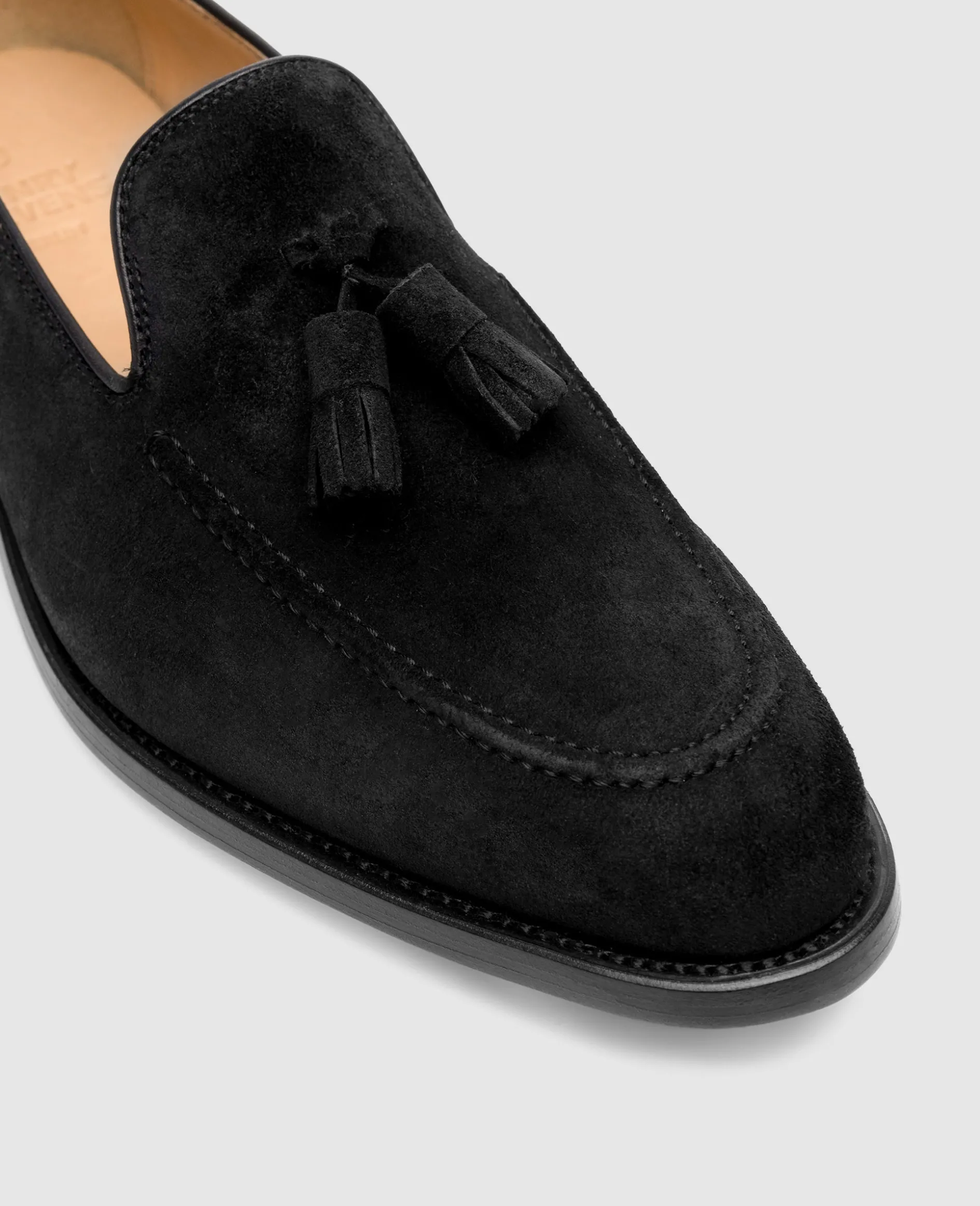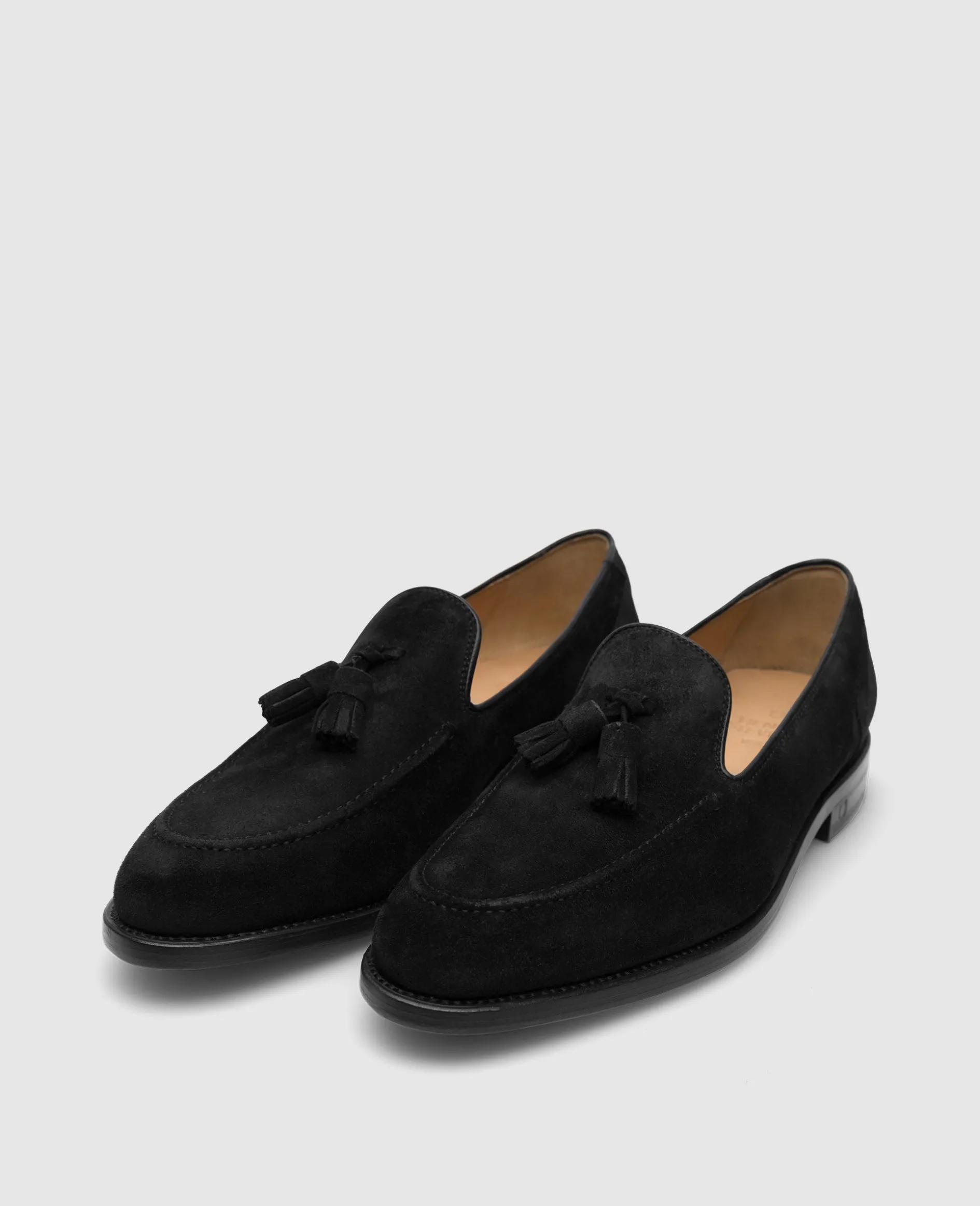Der Marshall Tassel Loafer ist ein rahmengenähter Slipper mit schmaler Passform. Er ist aus schwarzem Kalbsvelours und vegetabil gegerbetem Innenfutter aus Bio-Kalbsleder gefertigt. Diese Materialkombination sorgt für ein angenehmes Tragekomfort und macht dieses Modell zur perfekten Ergänzung ihrer Sommeroutfits.