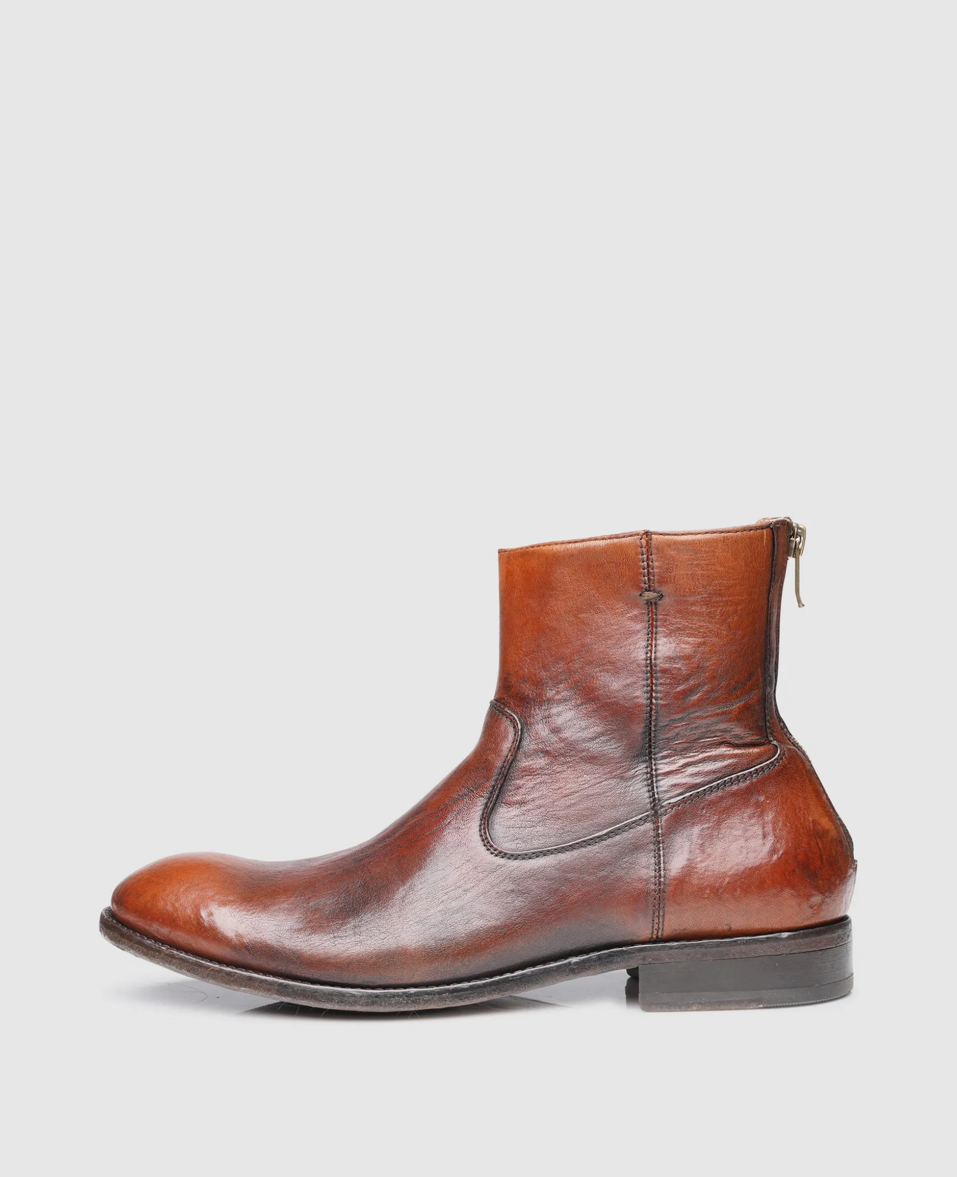Klassisch unverzierte Herrenstiefelette in neuem Gewand. Dank Handfinish und Stone-Washed-Verfahren erstrahlt der Boot in völlig neuem Glanz. Ausgestattet mit Reißverschluss und Zugschlaufe sowie einer in die Ledersohle eingesetzten Gummipartie.