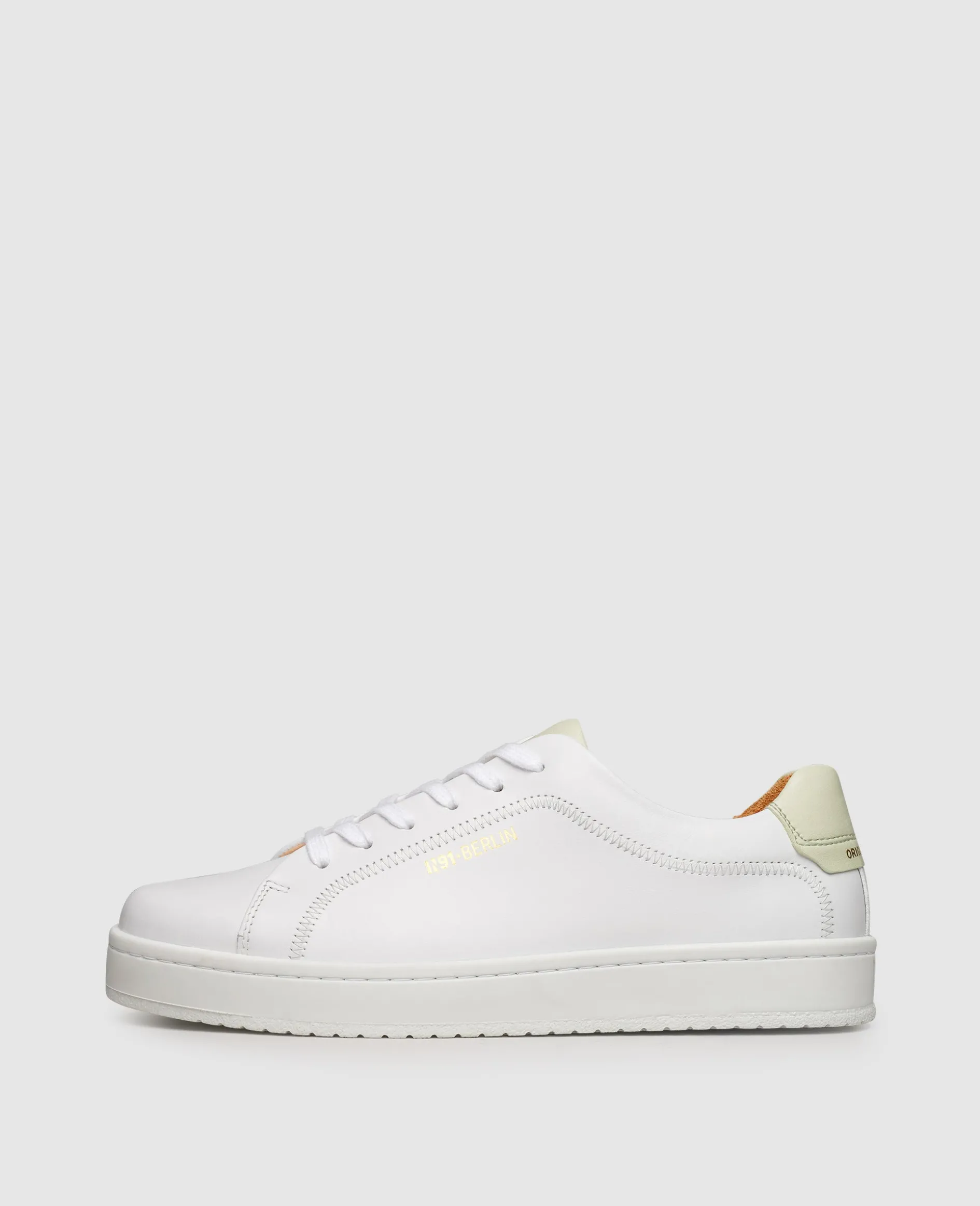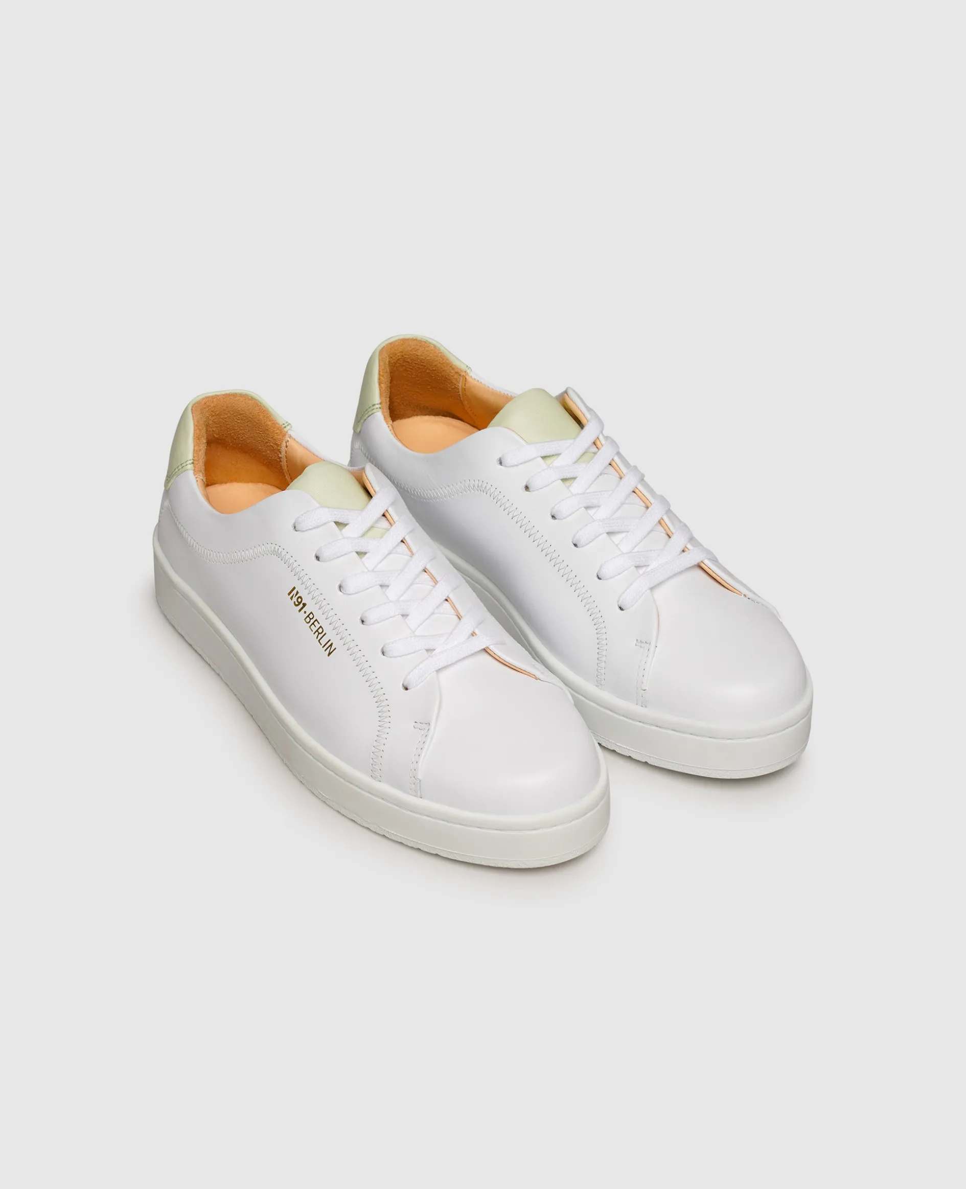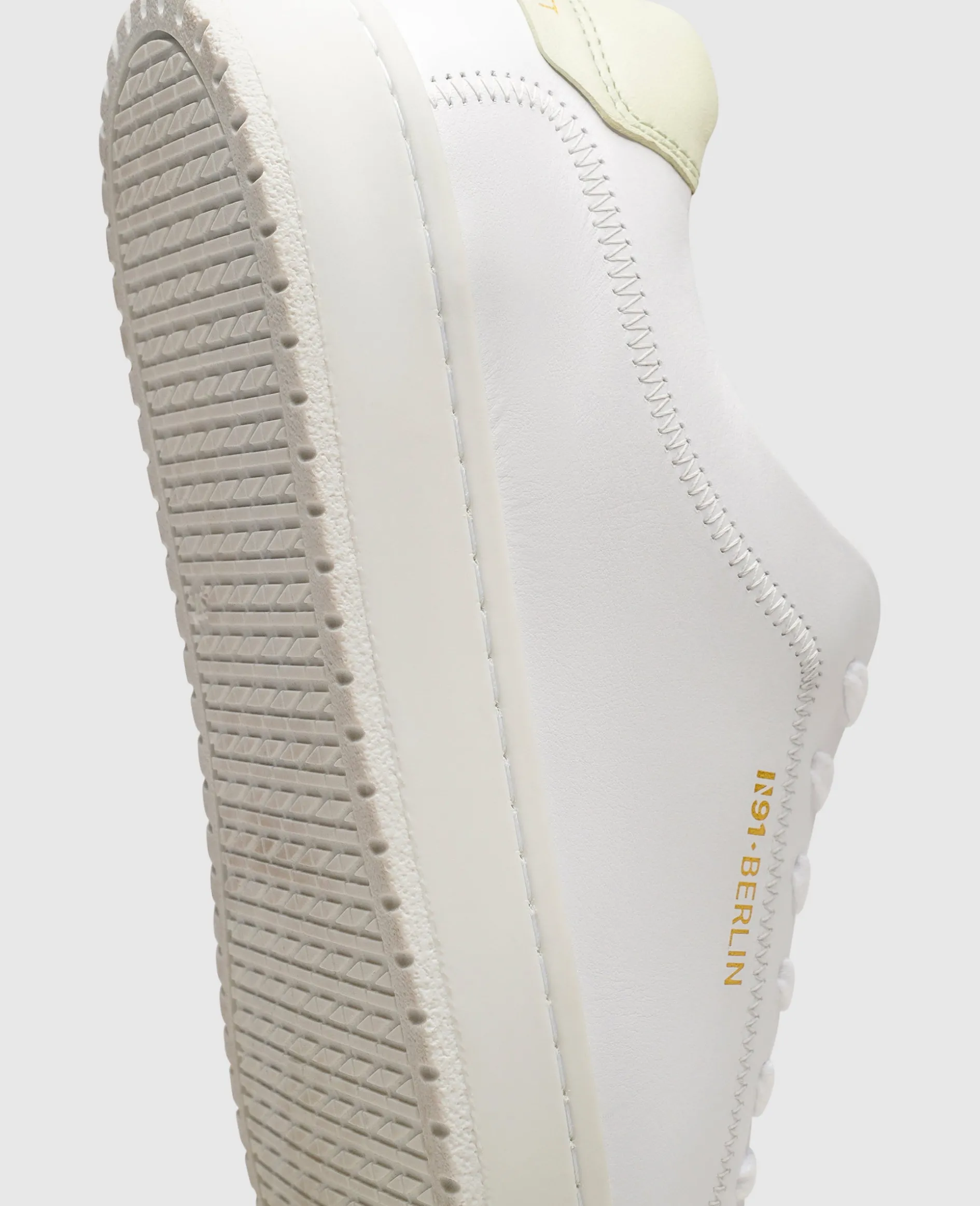 Modernes Understatement manifestiert sich in diesem handgefertigten Damen-Sneaker aus der Kollektion von N91. Das Schuhoberteil, bestehend aus geschmeidigem Kalbsleder, wurde überwiegend in dezentem Weiß gehalten. Ebenso unaufdringlich präsentiert sich die flexible Gummilaufsohle, welche im Inneren mit einem praktischen Wechselfußbett ausgestattet ist. Highlight: Einzelne Farbelemente auf der Schuhlasche und der Hinterkappe sorgen für unaufdringliche Dynamik.
