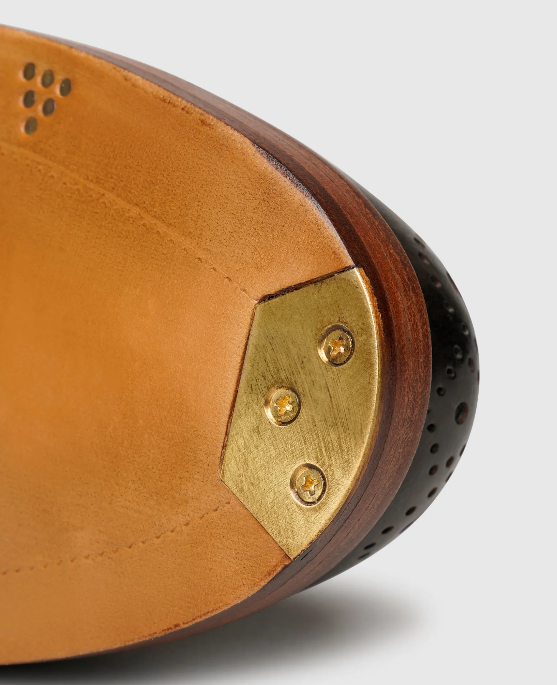 Der Rio Full-Brogue C wird aus erlesenem Shell-Cordovan hergestellt, welches aus der Hinterpartie von Kaltblüter-Pferden gewonnen wird. Wasserabweisend und tief glänzend ist es eines der hochwertigsten Leder auf dem Markt. Dreifachsohle und Lyralochung geben dem Schuh darüber hinaus seinen typischen Budapester Charme.