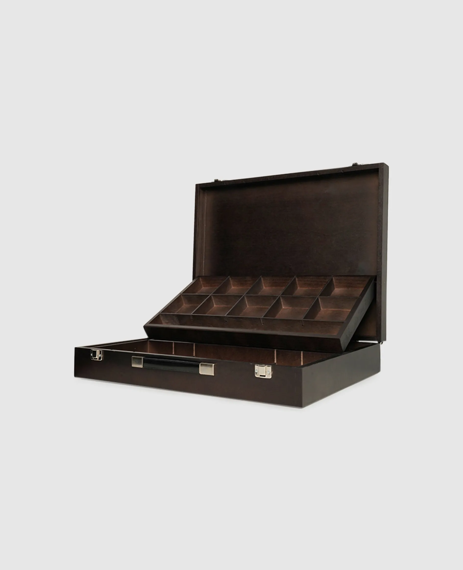 Perfekt für eine übersichtliche Aufbewahrung Ihrer Schuhpflegemittel: Aus erstklassigem Buchenholz gefertigter Schuhputzkoffer mit Ledergriff und herausnehmbaren Trennfächern.