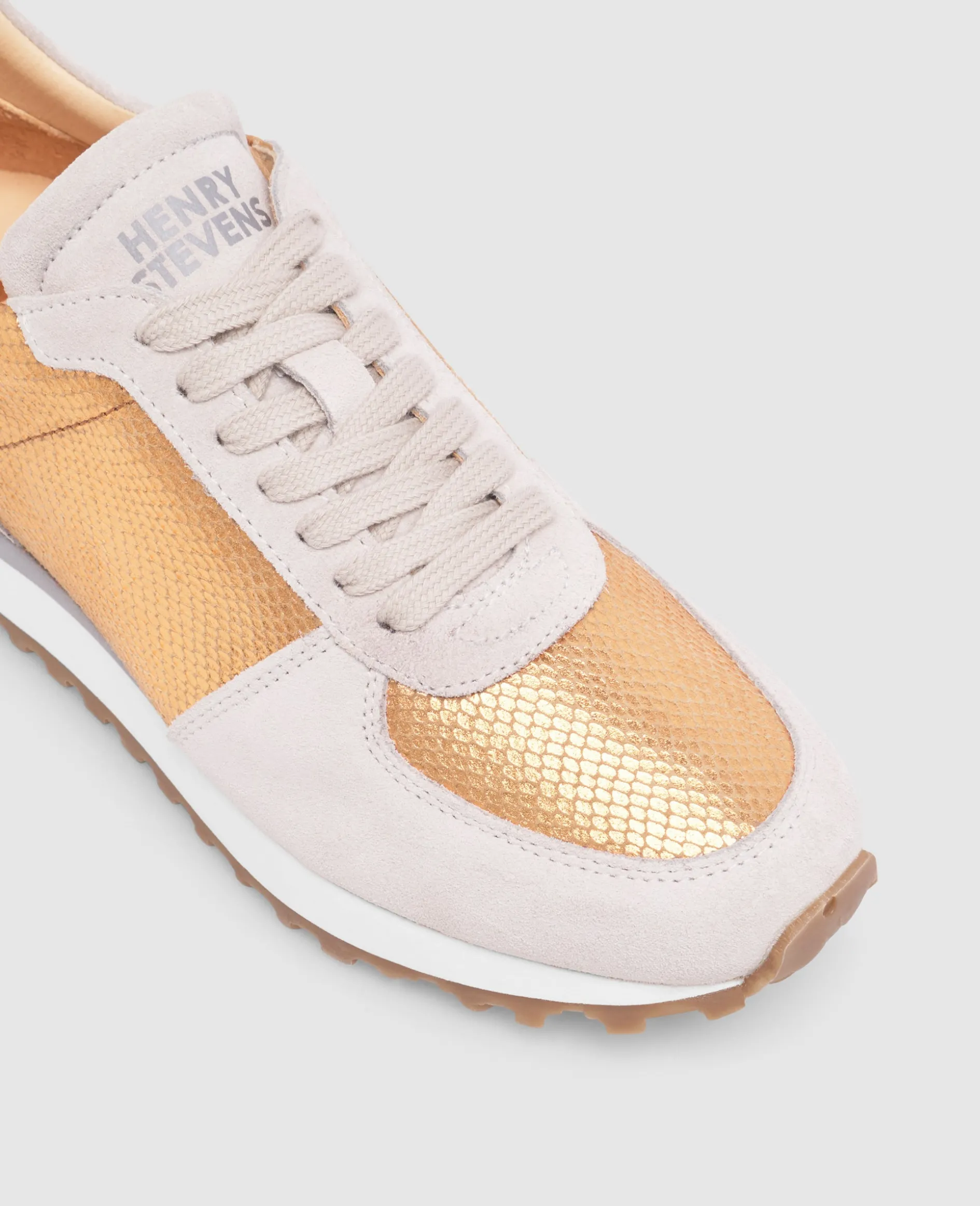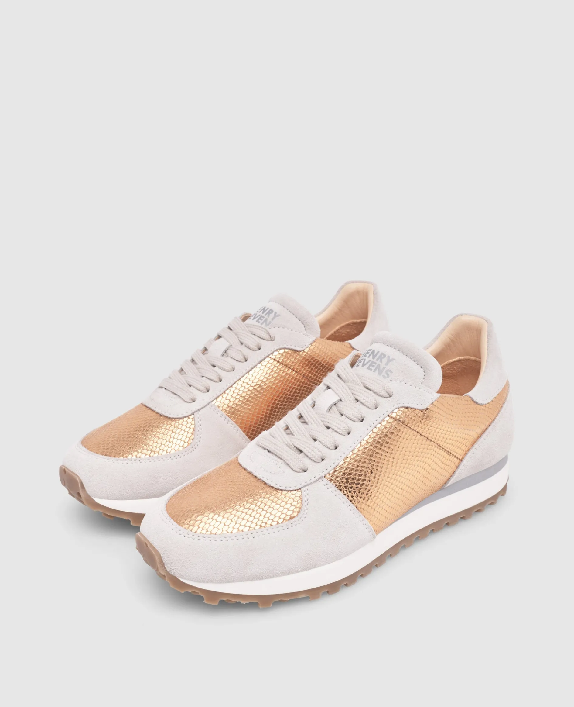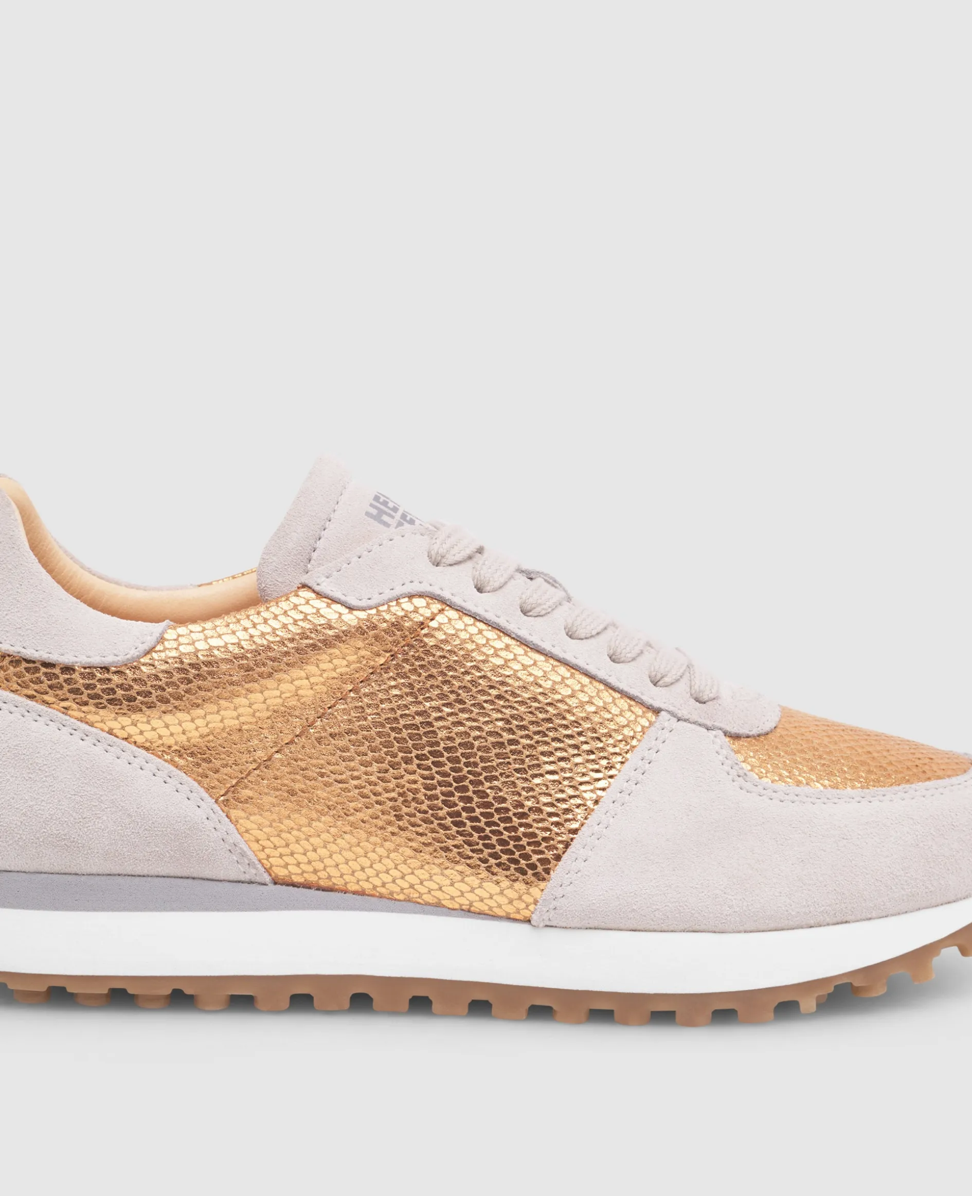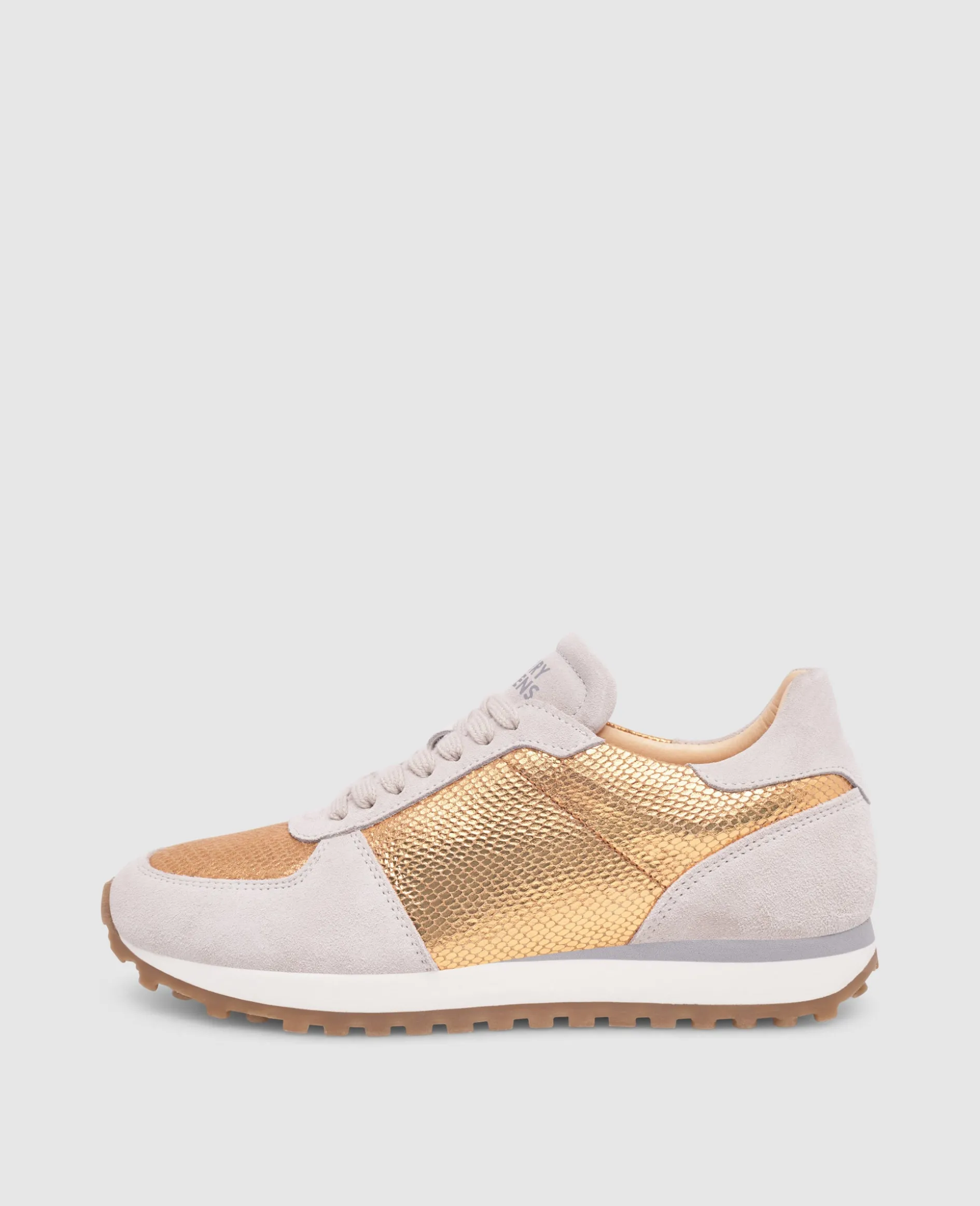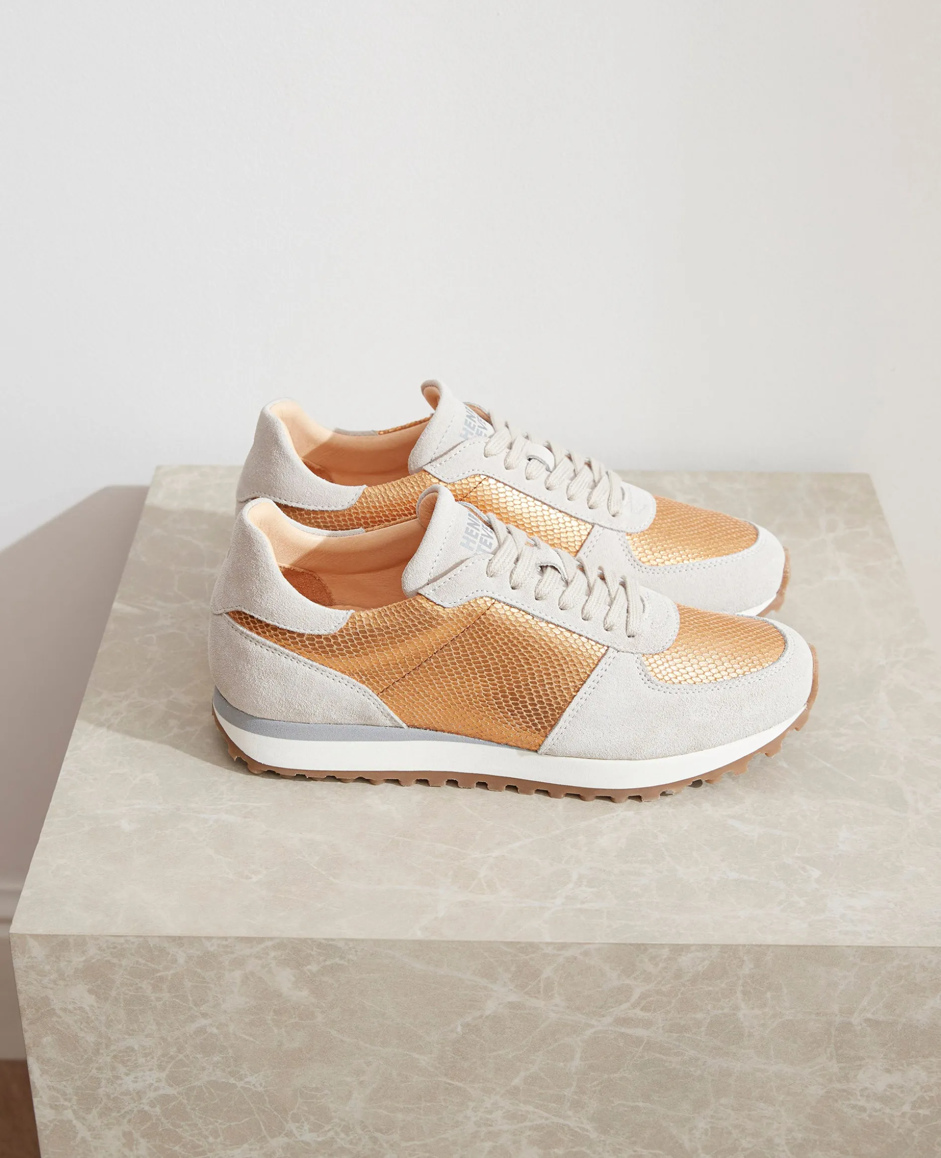 Ein harmonisches Zusammenspiel aus Kalbsvelours und Kalbsleder mit edler Schlangen-Prägung, gefüttert mit nachhaltigem Bio-Leder. Das Kupfer erinnert an leichte Sommertage – ein Schuh, der modernes Design und sommerliche Eleganz mühelos vereint.