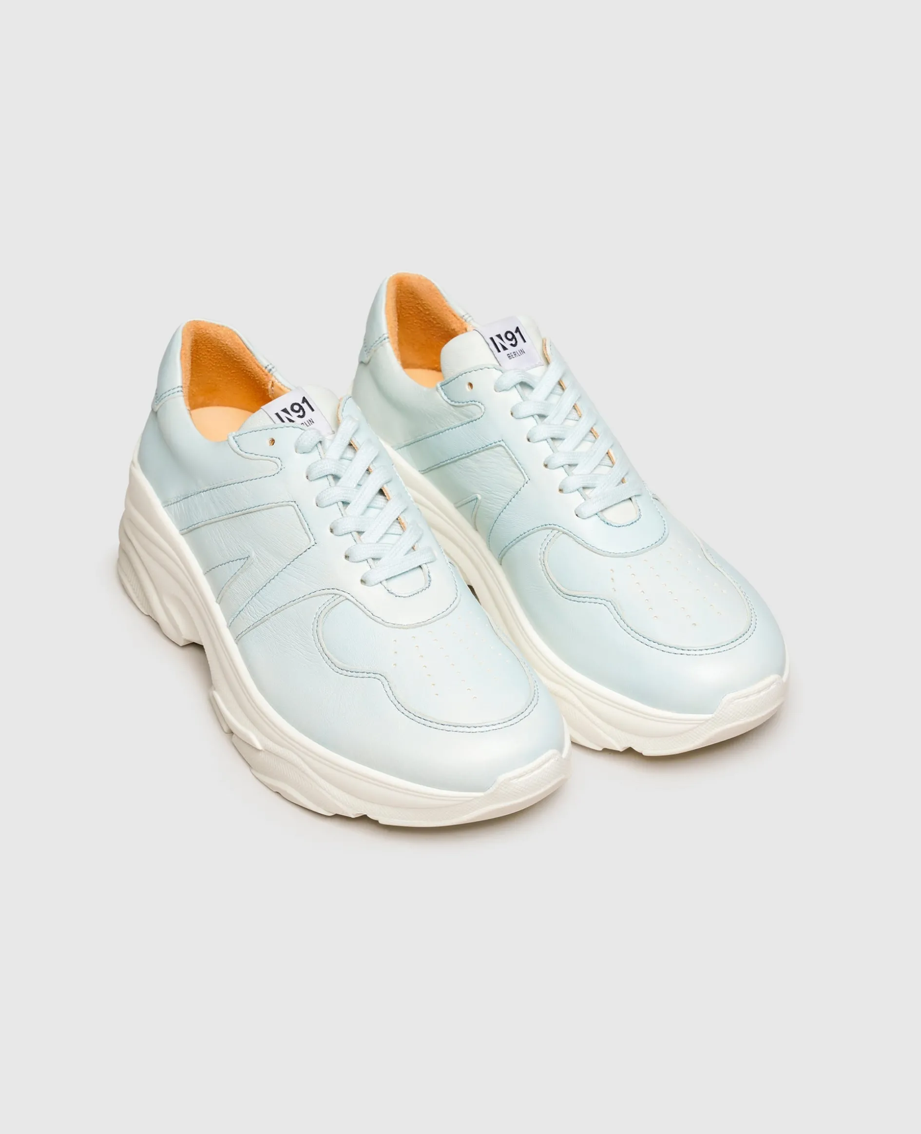 Ein selbstbewusster Look im beliebten Chunky-Style kennzeichnet die handgefertigten Sneaker für Damen der Berliner Schuh-Marke N91. Das Schuhoberteil und die Laufsohle präsentieren sich im monochromen Design und begeistern mit einem frischen Blauton. Während das verwendete Glattleder vom Kalb auf die Qualität der verwendeten Materialien verweist, garantiert die breite Gummisohle den Komfort des sportlichen Allrounders.