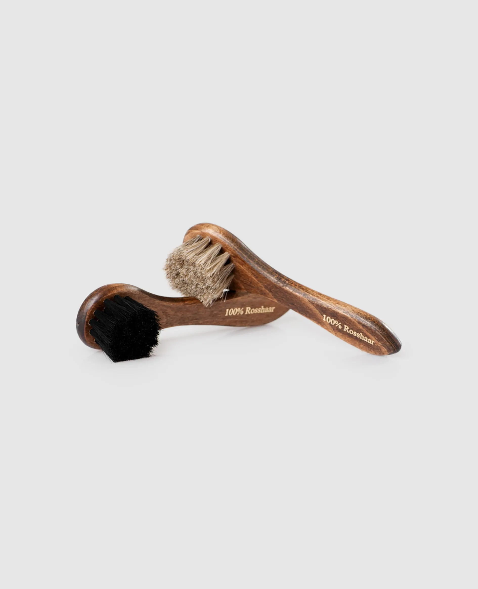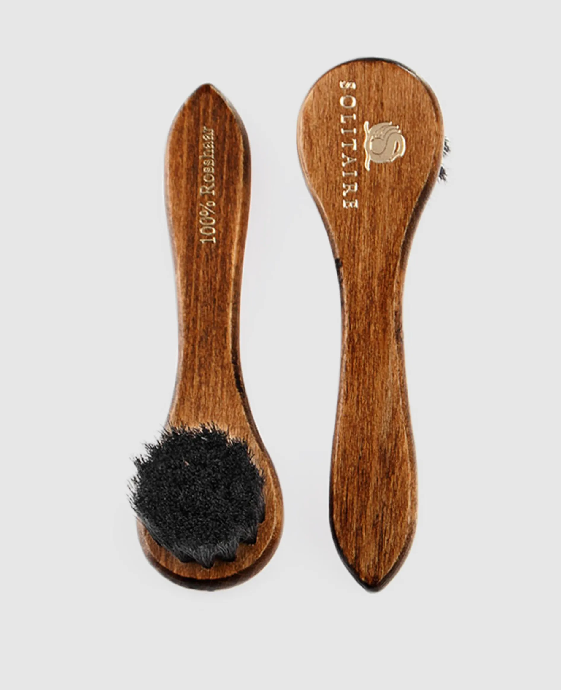 Die ergonomisch optimal gearbeitete Tiegelbürste von Solitaire bringt Schuhcreme gleichmäßig und schonend auf das Oberleder. Hohe Qualität dank Holzkörper und 100-prozentigem Rosshaarbesatz in Dunkel oder Silbergrau.