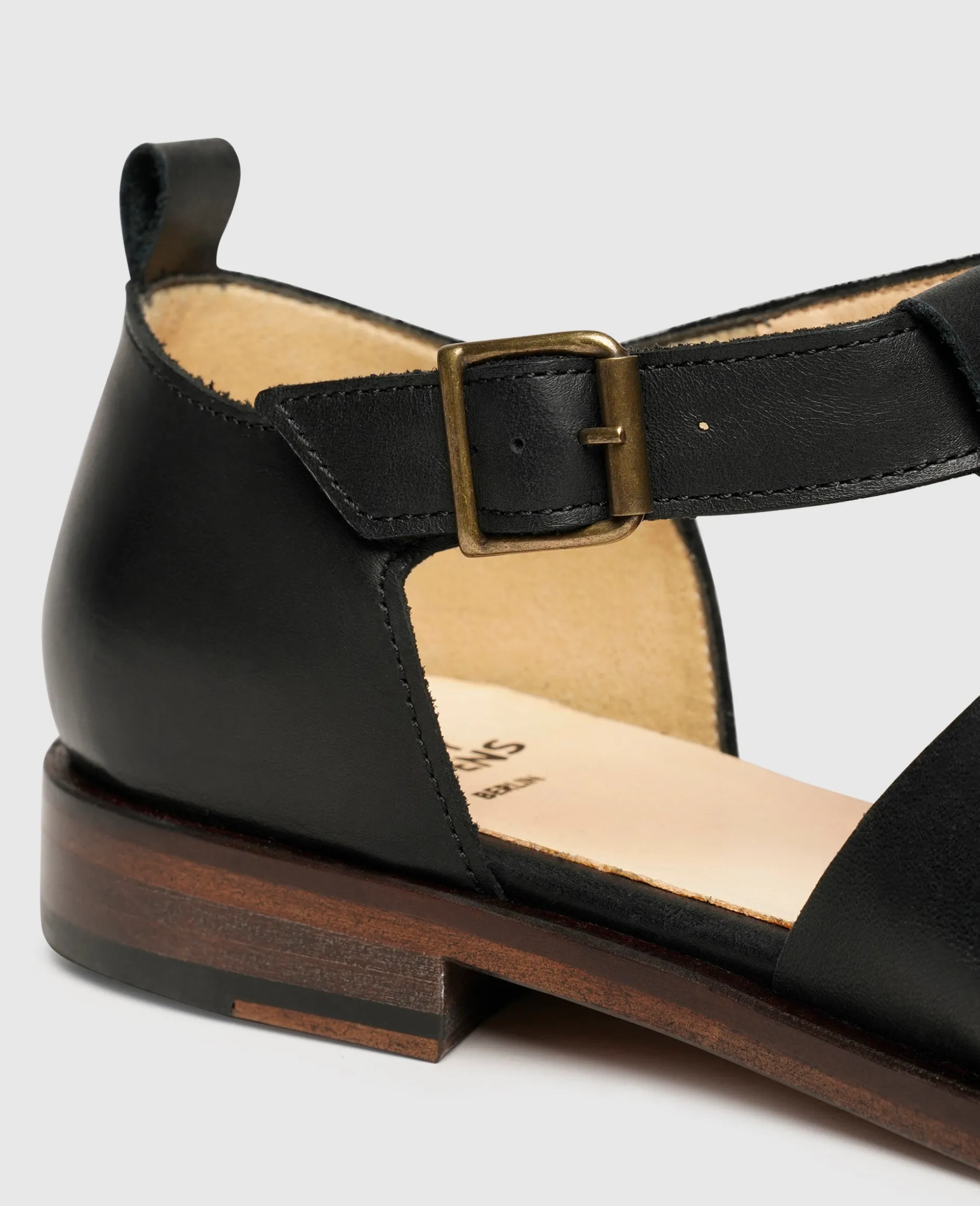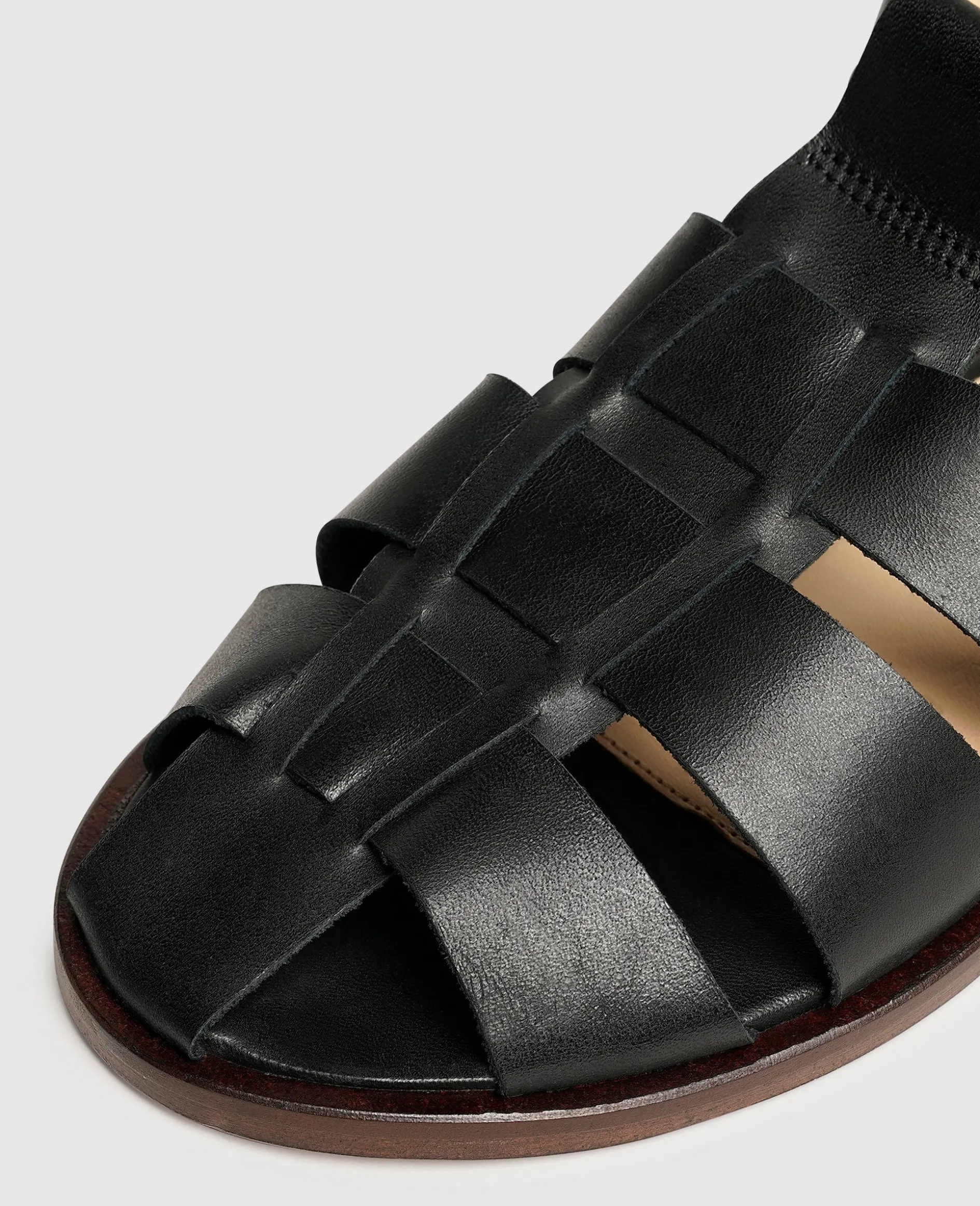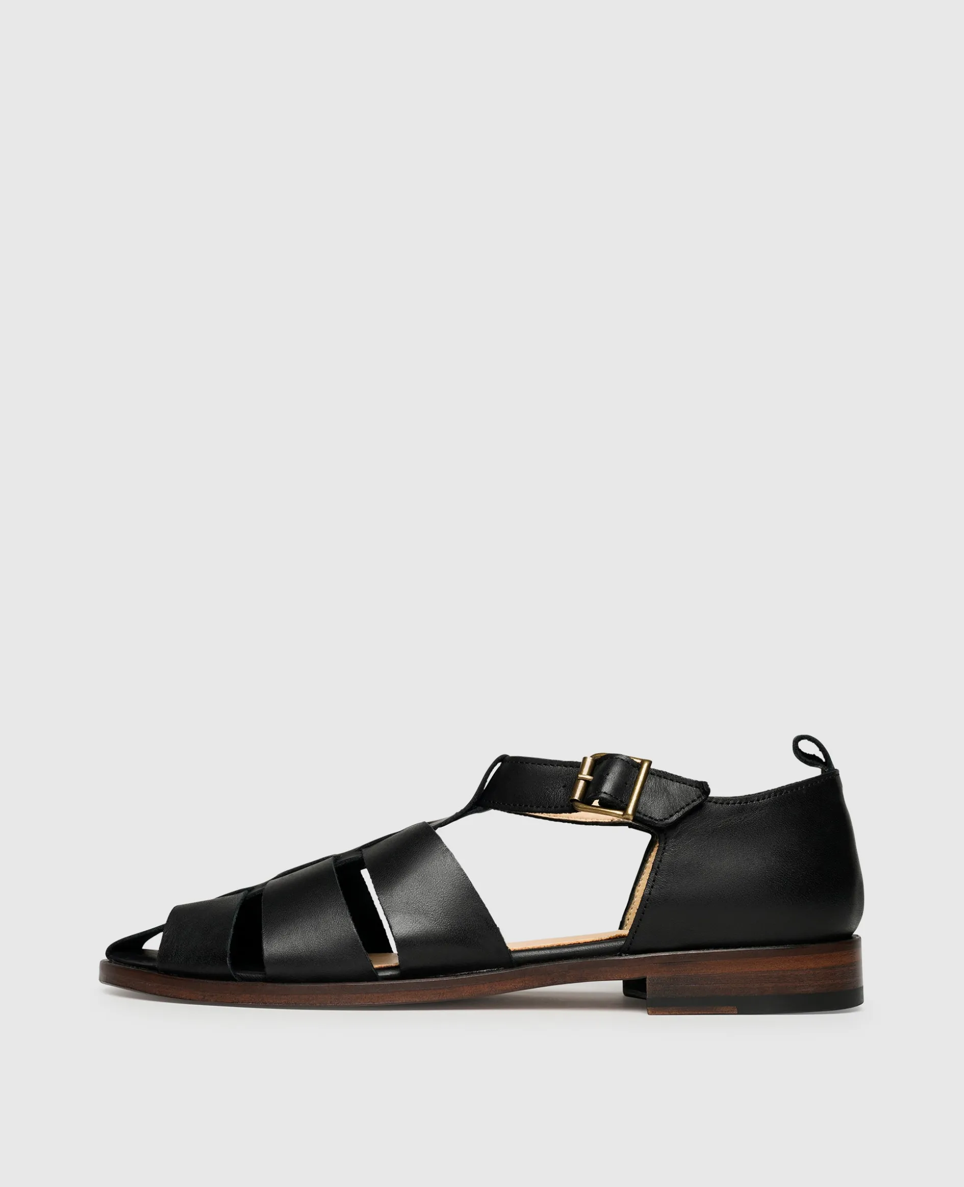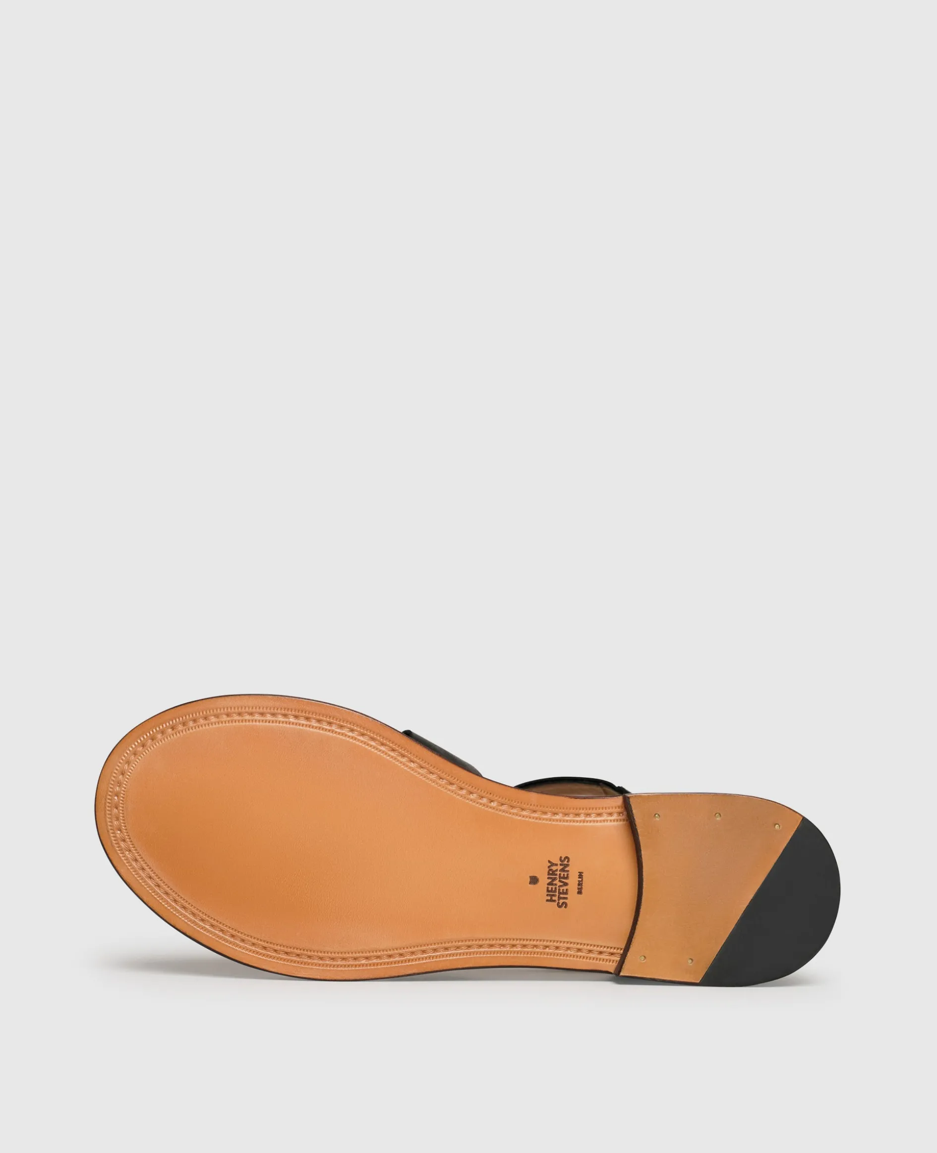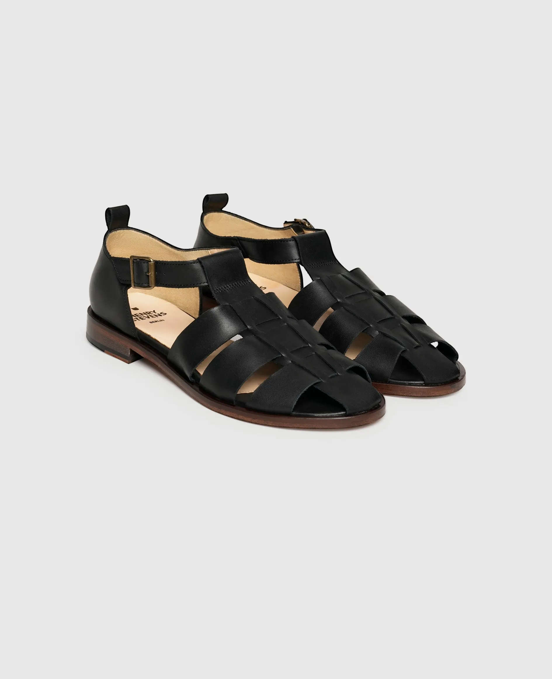 Diese Sandalen von Henry Stevens sind genau das Richtige für eine entspannte Zeit an heißen Sommertagen. Den schwarzen Schuh zieren Riemen aus glattem und feinem Kalbsleder, dessen Weite durch eine Schnalle reguliert werden kann. Im Schuhinneren befindet sich pflanzlich gegerbtes und vollständig kompostierbares Bio-Leder. Durch das weiche Lederfußbett mit Memoryfoam-Effekt und die Laufsohle aus Leder wird Ihr Komfort auf ein unglaublich hohes Niveau gehoben. Mit dieser Fischersandale, die in Portugal gefertigt wurden, vollenden Sie Ihre legeren Sommer- und Freizeitlooks.