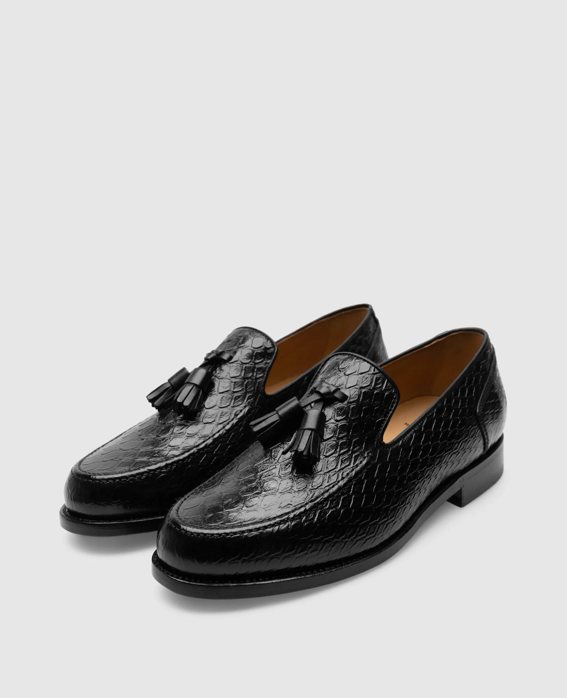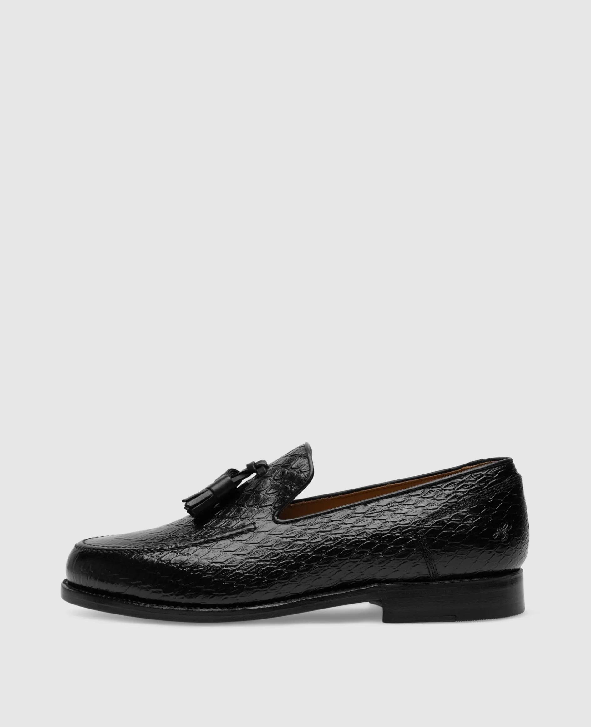 Der Wien Tassel Loafer in Schwarz ist aus Kalbsleder in Krokodil-Optik gefertigt und einem Innenfutter aus vegetabil gegerbtem Leder. Die rahmengenähte Ledersohle steht für erstklassige Handwerkskunst und macht ihn zur idealen Wahl für stilbewusste Sommergarderoben.