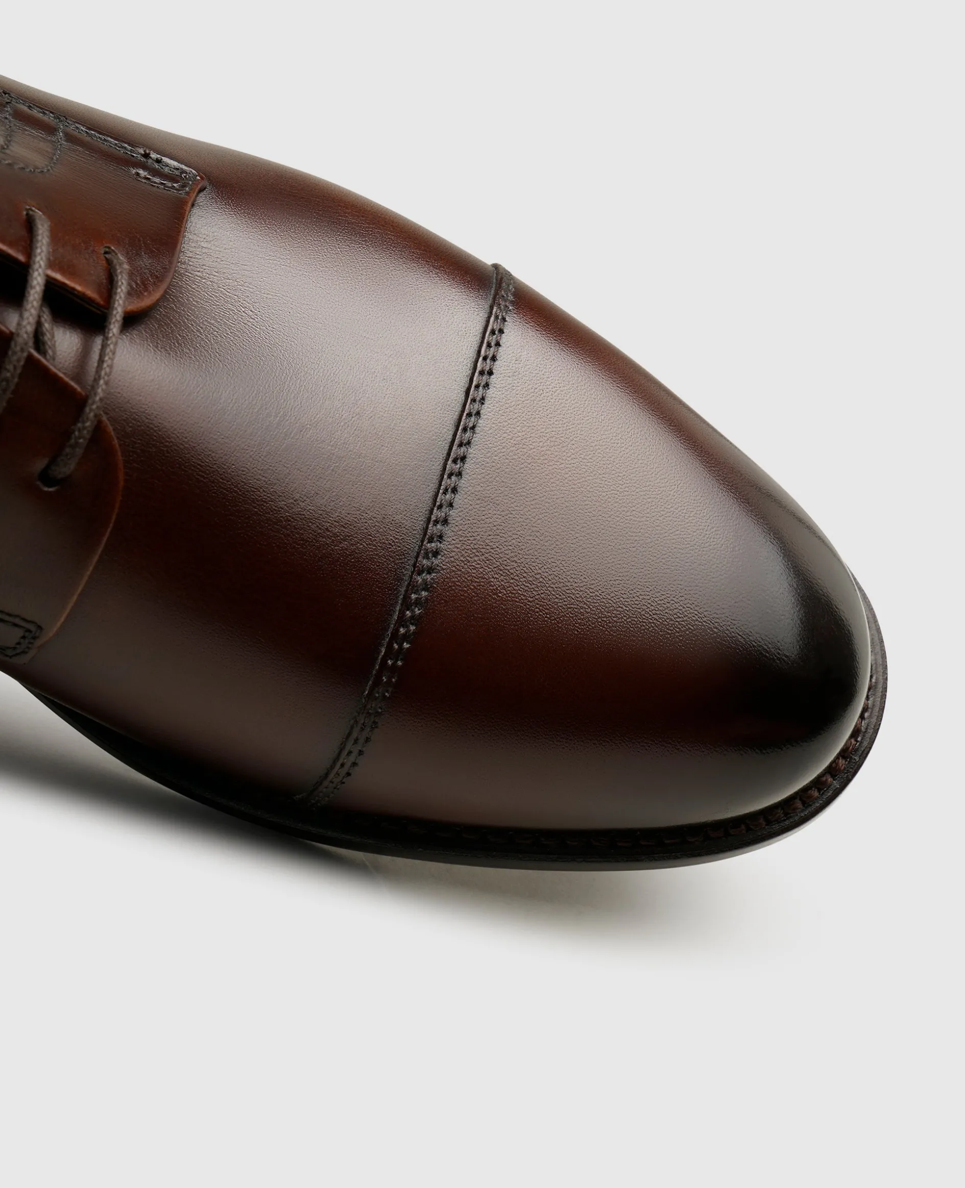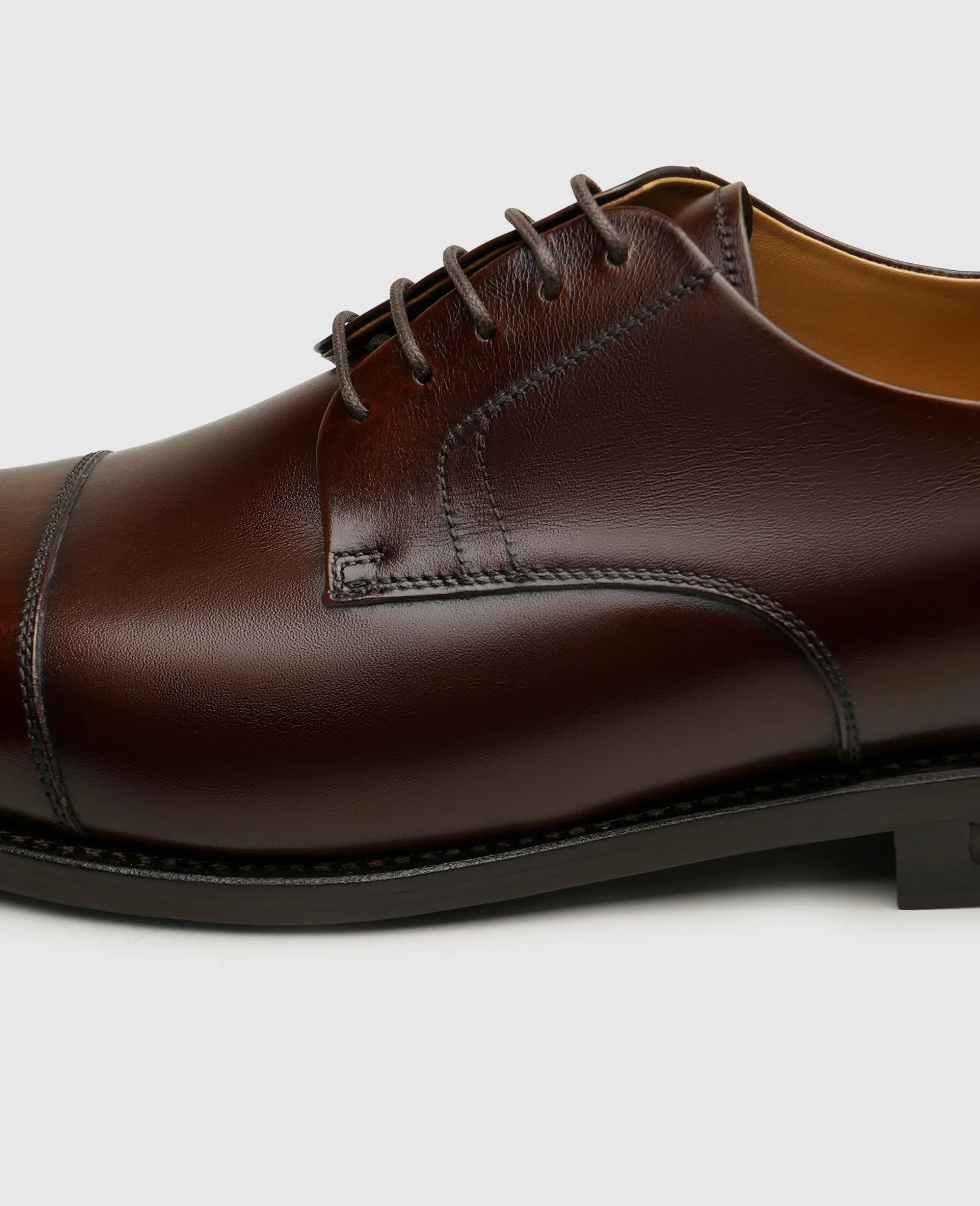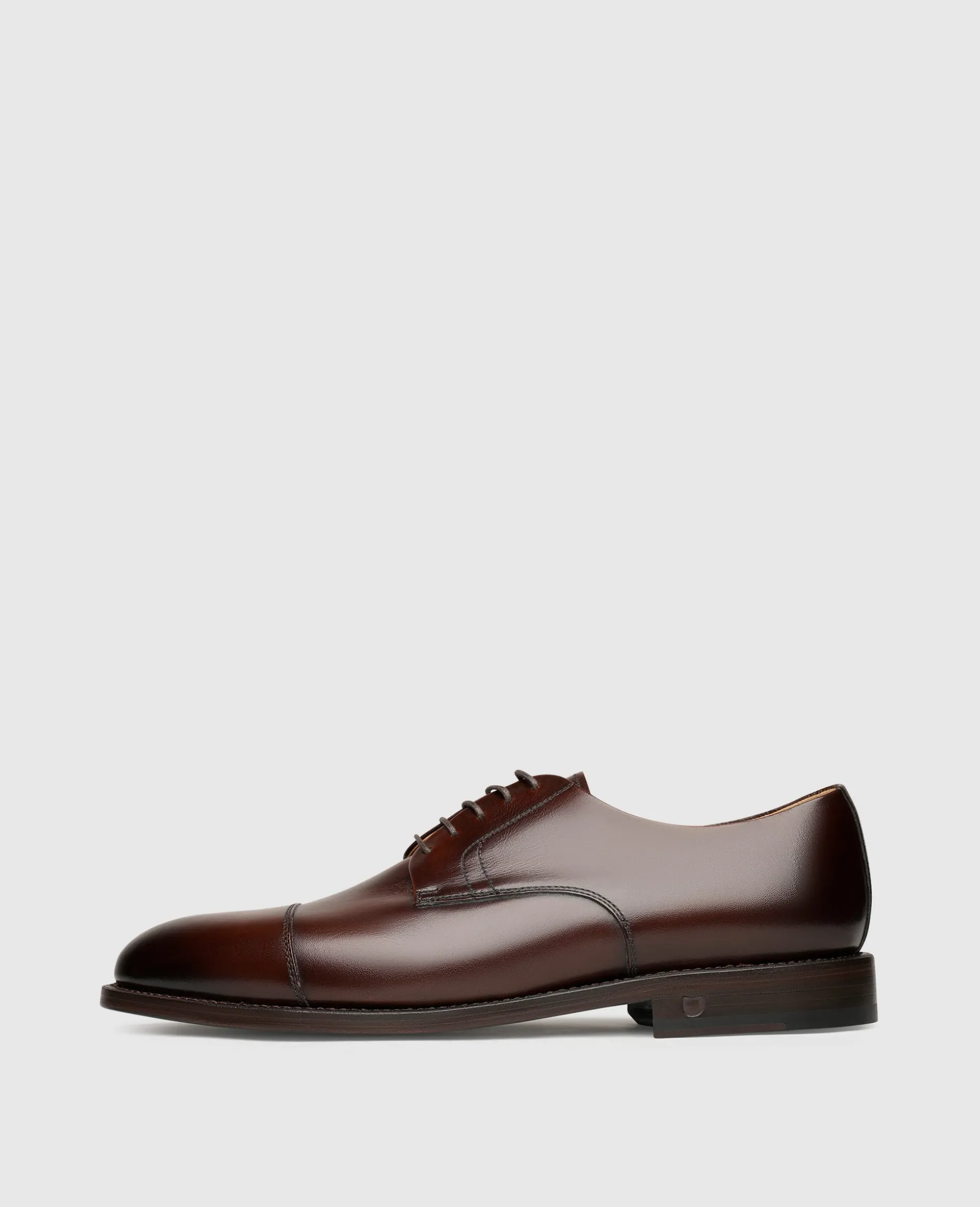 Eine faszinierende Patina-Optik, ausgewählte Materialien sowie eine detailverliebte Machart verleihen dem rahmengenähten und handgefertigten Volllederschuh für Herren seine Exklusivität. Das aufwendige Handfinish kreiert aufregende Farbnuancen auf dem geschmeidig glänzenden Kalbsleder, welche das Modell Winston Captoe Derby von Henry Stevens eindeutig von anderen Herrenschuhen unterscheidet. Der richtige Begleiter für alle Herren, die klassischen Stil gern mit modernen Akzenten kombinieren.