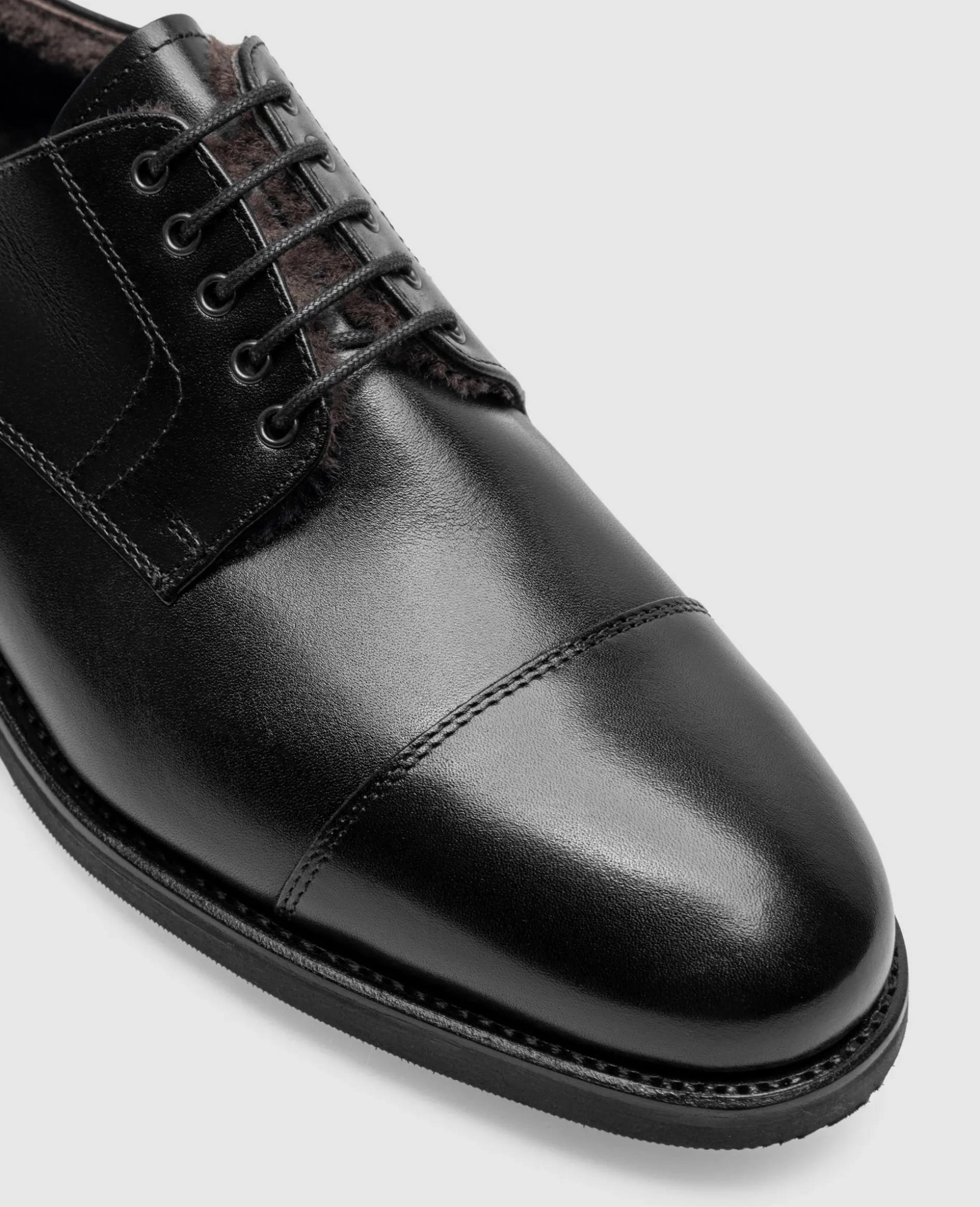 Der Winston Captoe Derby in Schwarz ist aus Kalbsleder gefertigt und bietet ein Innenmaterial aus luxuriösem Lammfell. In Kombination mit der rahmengenähten Profil-Gummisohle bietet dieser Klassiker Wetterbeständigkeit und Komfort im Winter. Hergestellt in Spanien.