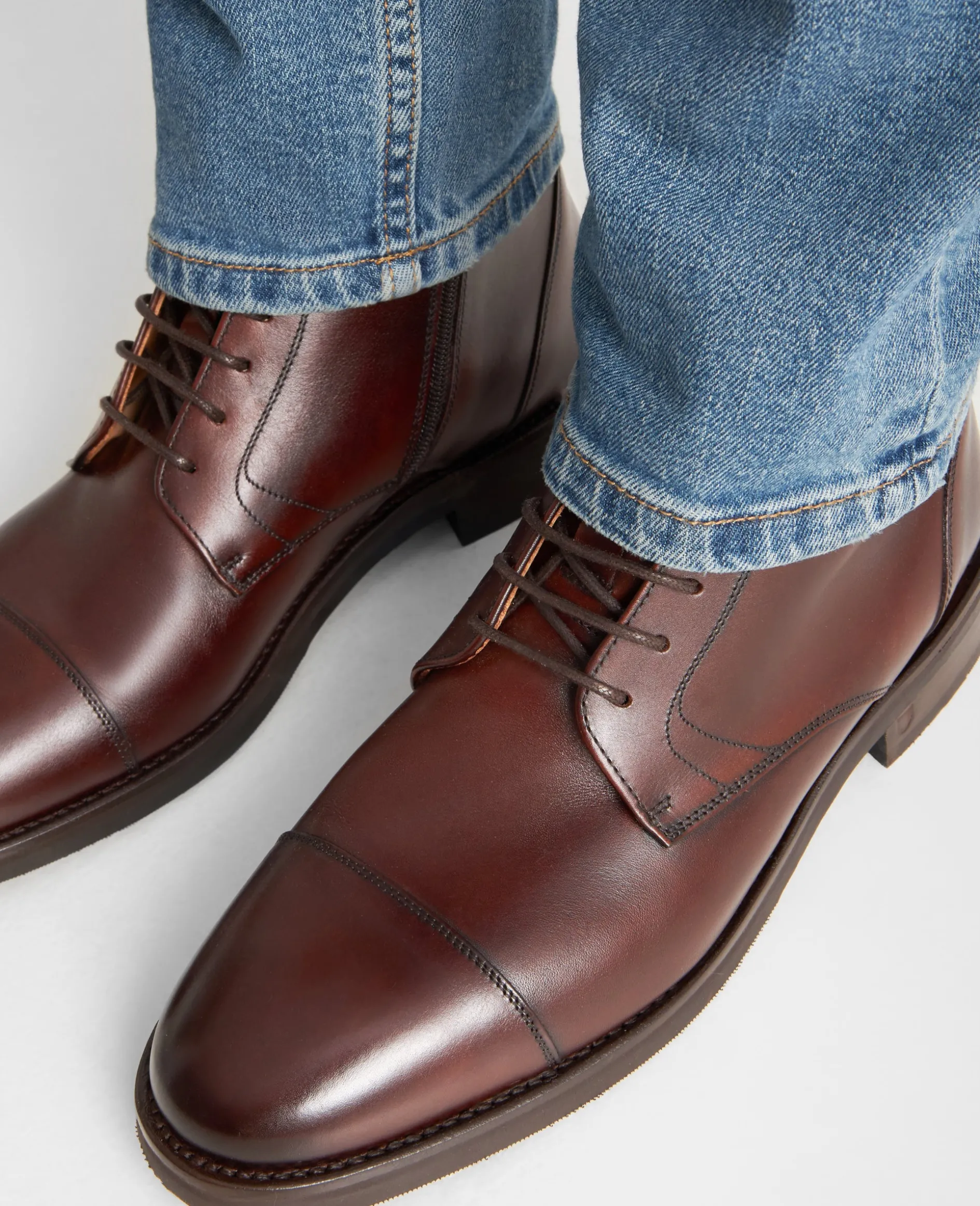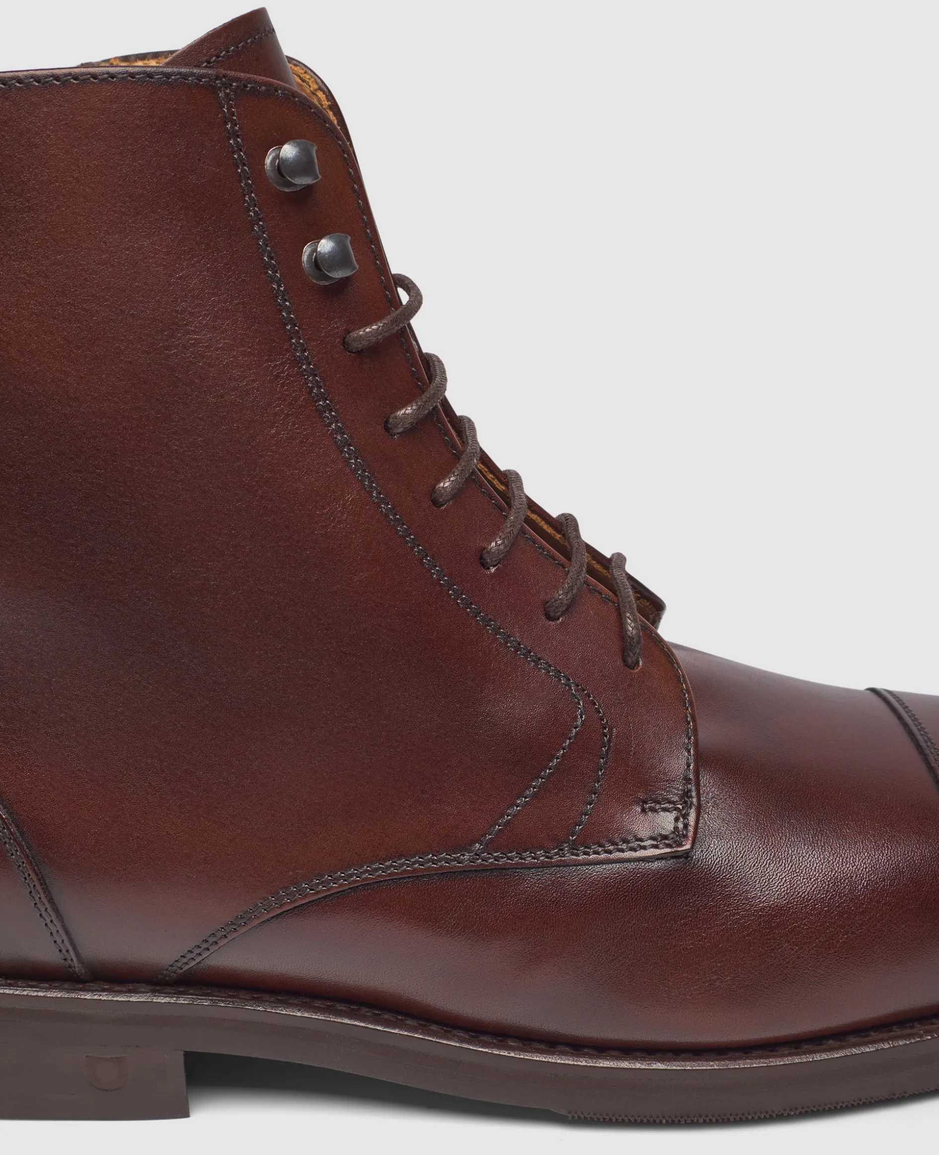 Der Winston Captoe Derby Boot in Schwarzbraun ist handgemacht aus Kalbsleder mit einer Patina sowie einem Innenmaterial aus vegetabil gegerbtem Leder. Durch die rahmengenähte Machart und die flexible Gummisohle vereint er hohen Komfort mit zeitlosem Design. Hergestellt in Spanien.